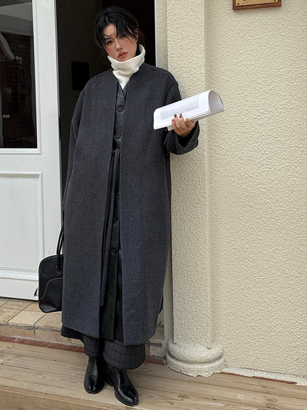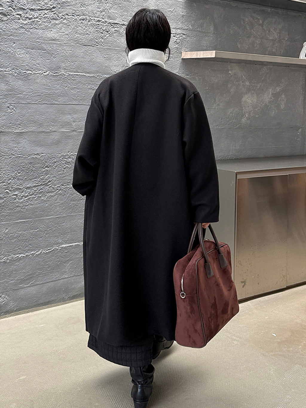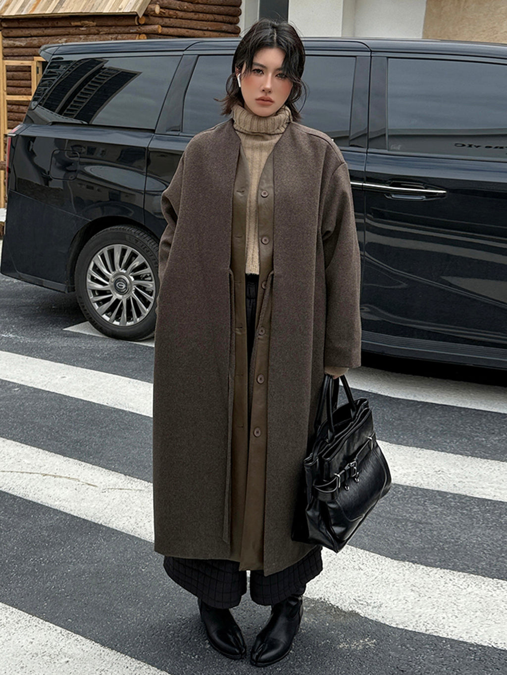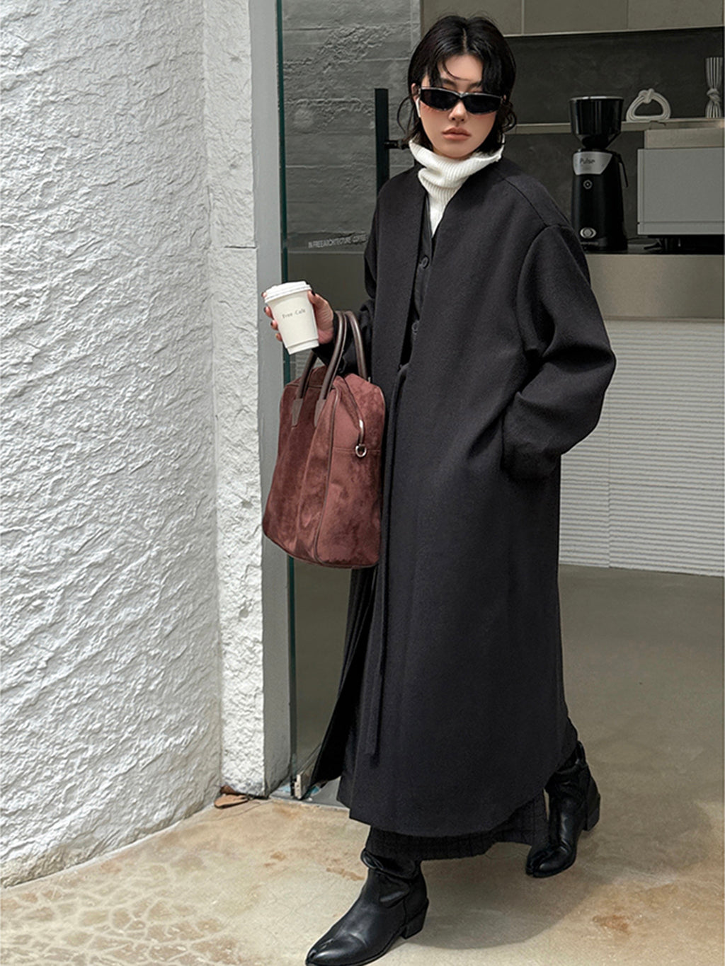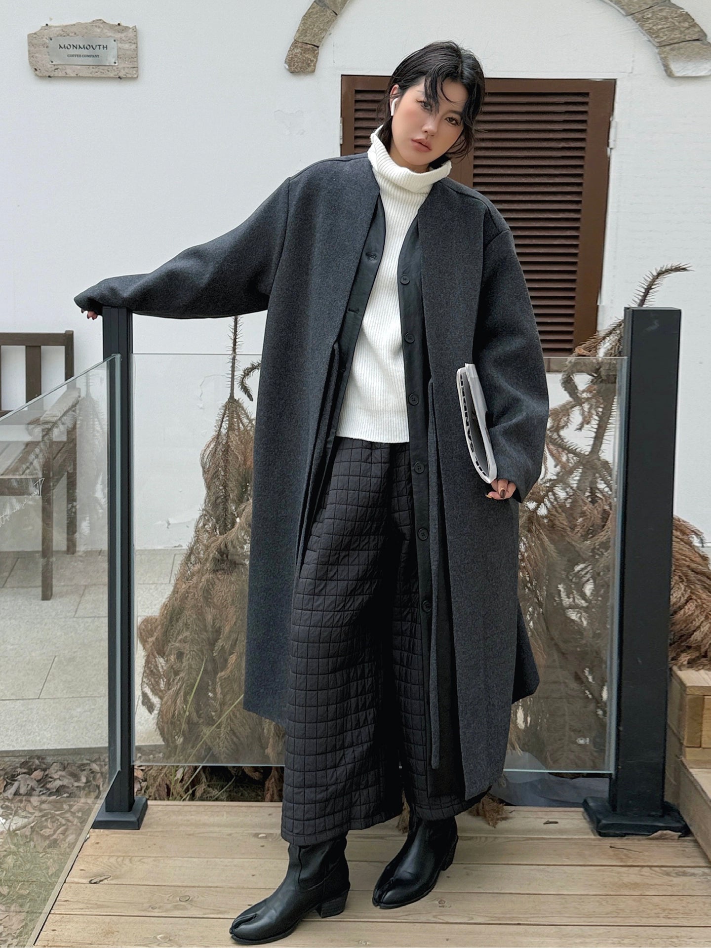 すっきりとしたノーカラーが印象的なロング丈コート。表面はウール調の起毛感を持ち、やわらかな質感が体を包み込むようにフィット。内側には光沢のある生地を配し、前合わせから覗くことでモード感のあるレイヤード風に仕上げている。ドロップショルダーのラグランスリーブにより肩回りはゆとりがあり、全体的にやや丸みを帯びたリラクシーなシルエット。重ね着にも適した余白感があり、日常のスタイルから都市的なモードコーデまで活用できる汎用性の高い一枚。