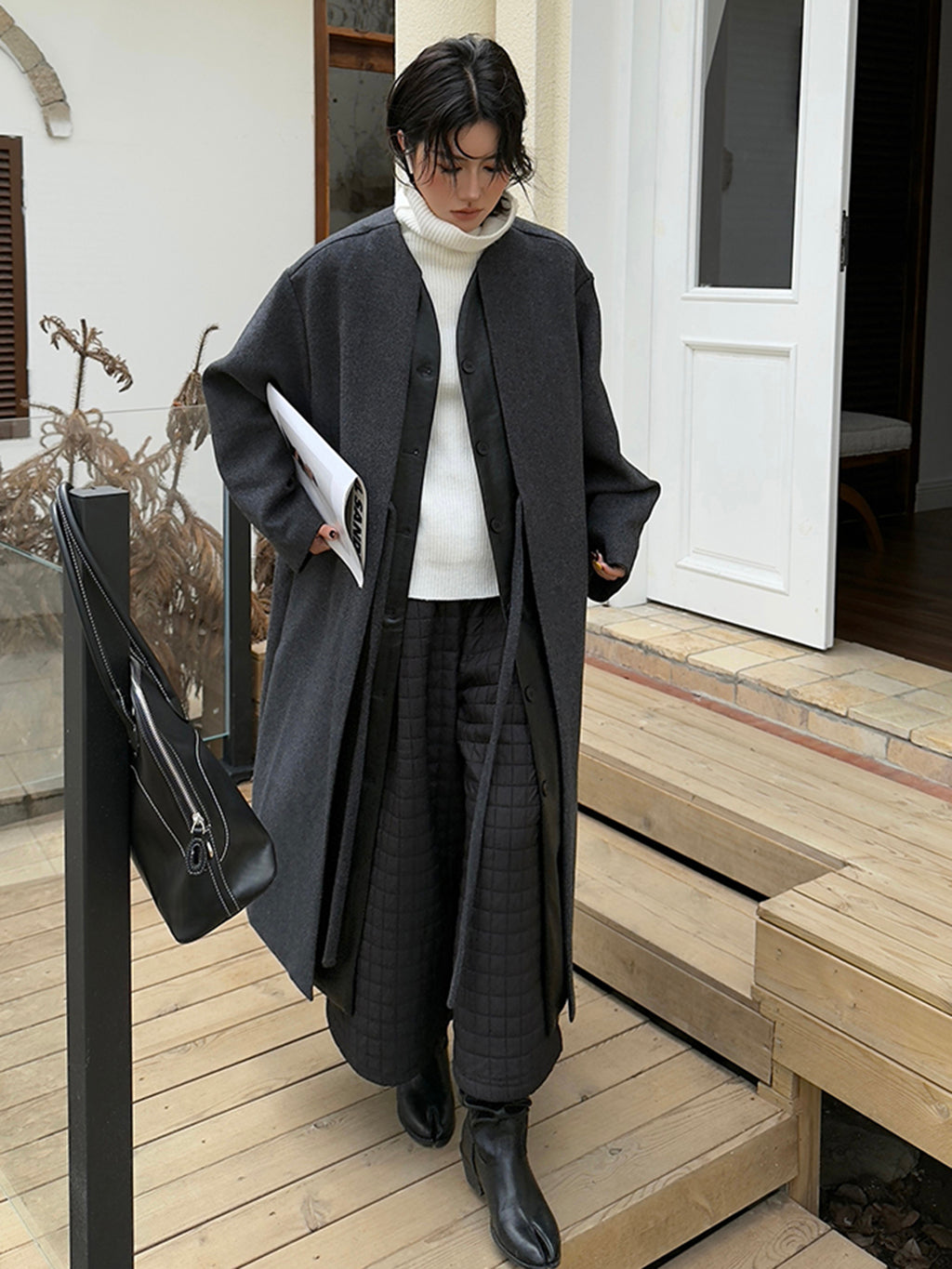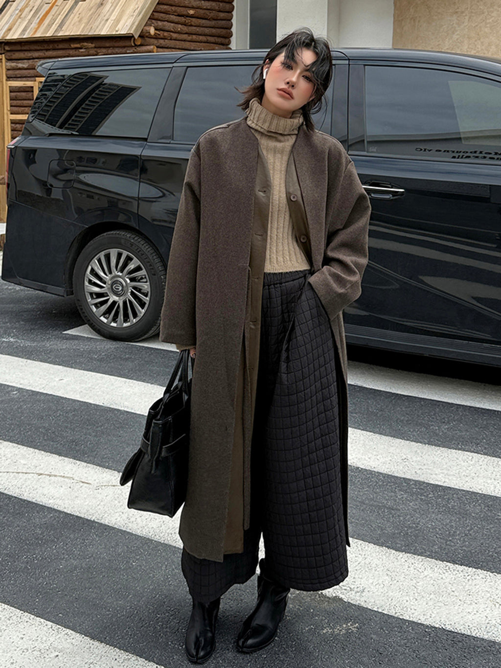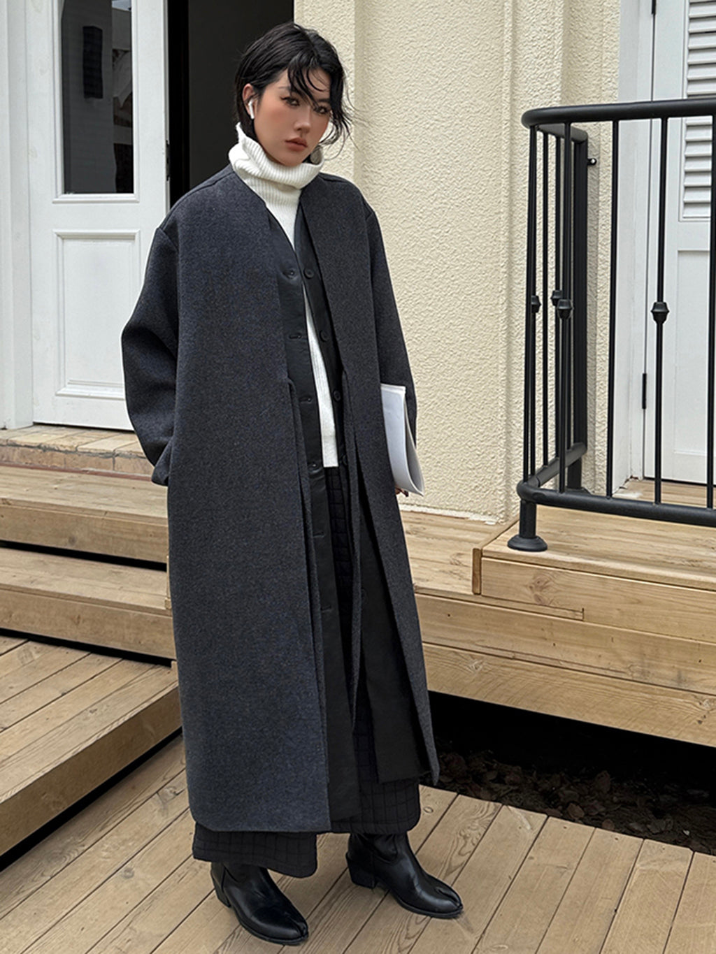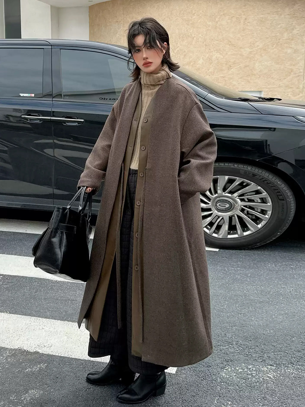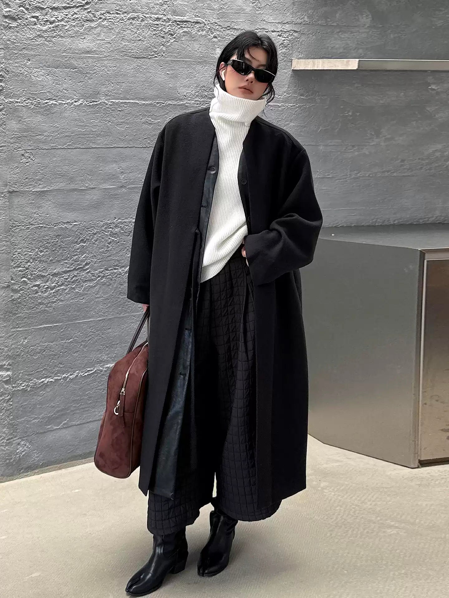 すっきりとしたノーカラーが印象的なロング丈コート。表面はウール調の起毛感を持ち、やわらかな質感が体を包み込むようにフィット。内側には光沢のある生地を配し、前合わせから覗くことでモード感のあるレイヤード風に仕上げている。ドロップショルダーのラグランスリーブにより肩回りはゆとりがあり、全体的にやや丸みを帯びたリラクシーなシルエット。重ね着にも適した余白感があり、日常のスタイルから都市的なモードコーデまで活用できる汎用性の高い一枚。
