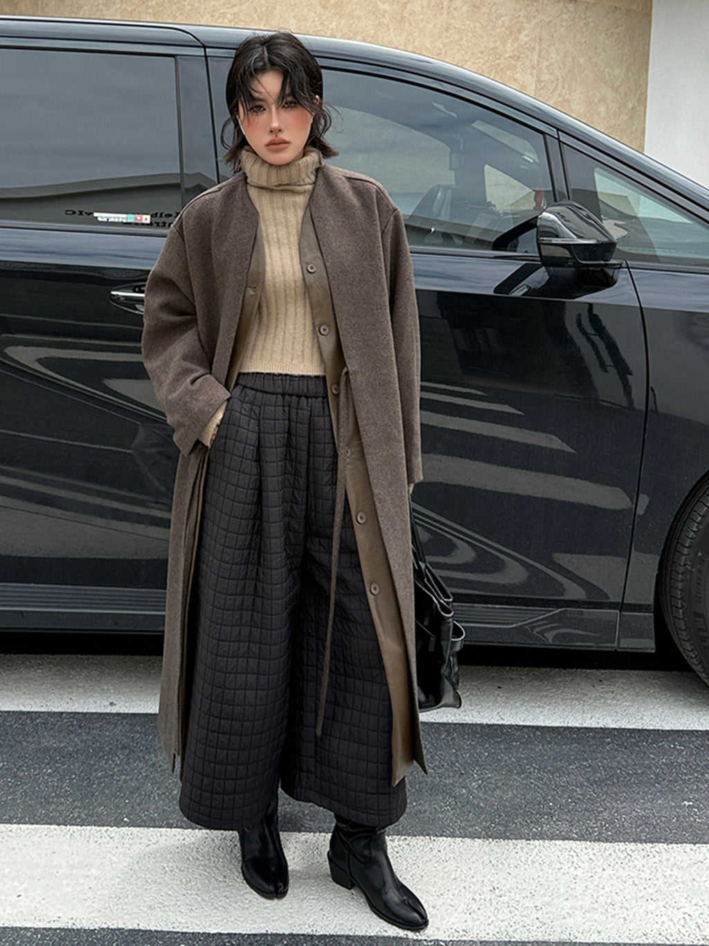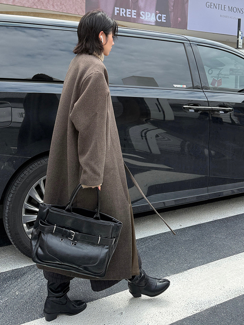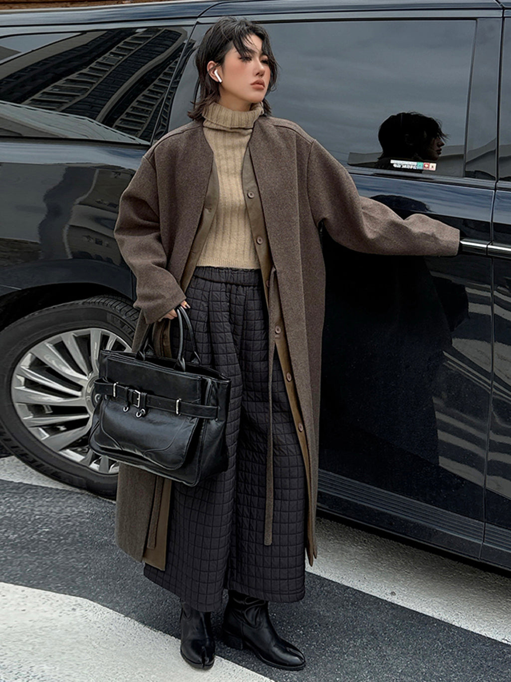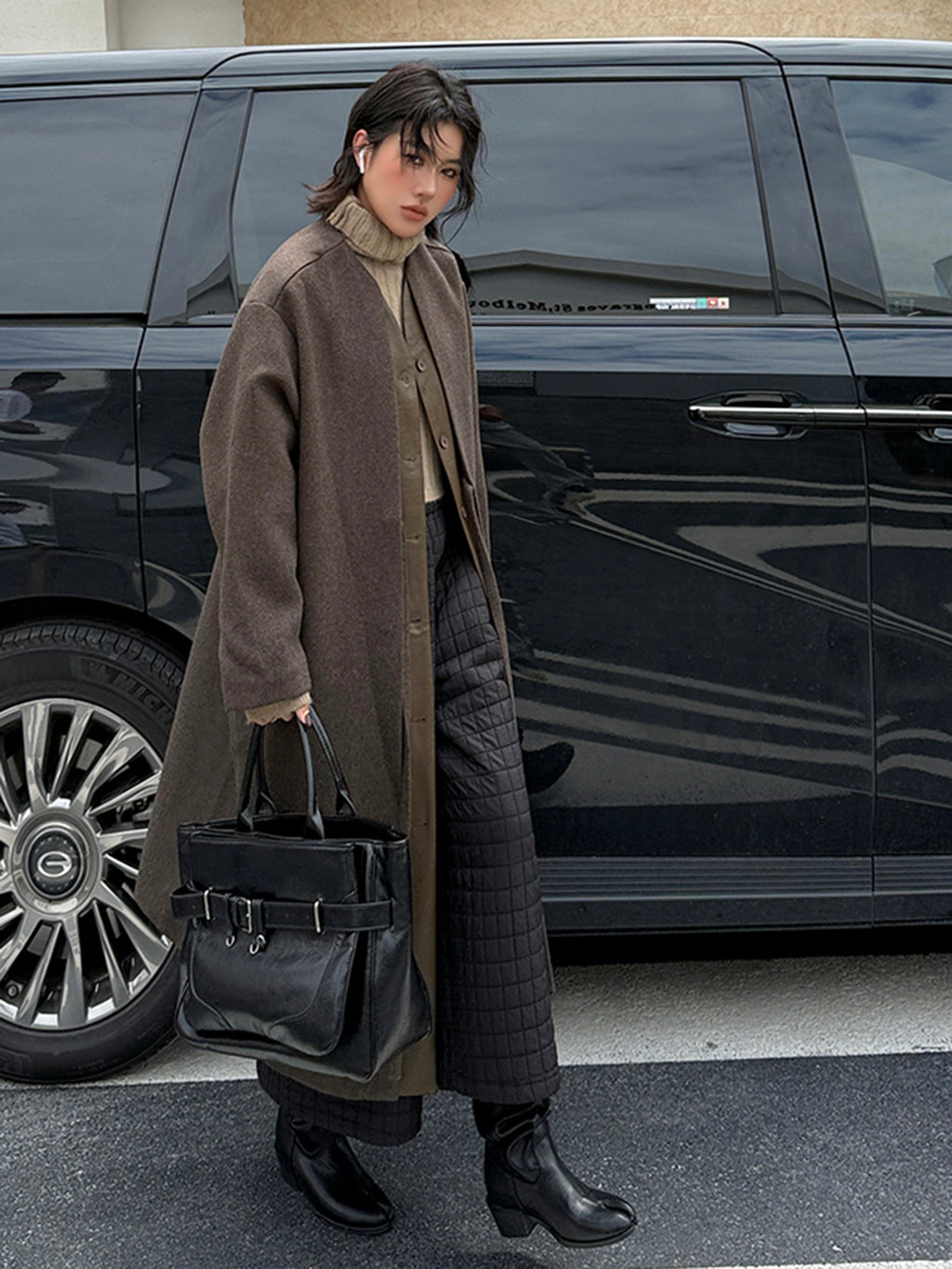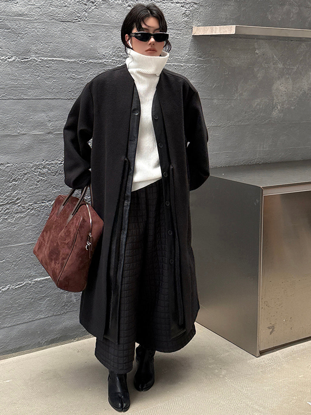 すっきりとしたノーカラーが印象的なロング丈コート。表面はウール調の起毛感を持ち、やわらかな質感が体を包み込むようにフィット。内側には光沢のある生地を配し、前合わせから覗くことでモード感のあるレイヤード風に仕上げている。ドロップショルダーのラグランスリーブにより肩回りはゆとりがあり、全体的にやや丸みを帯びたリラクシーなシルエット。重ね着にも適した余白感があり、日常のスタイルから都市的なモードコーデまで活用できる汎用性の高い一枚。