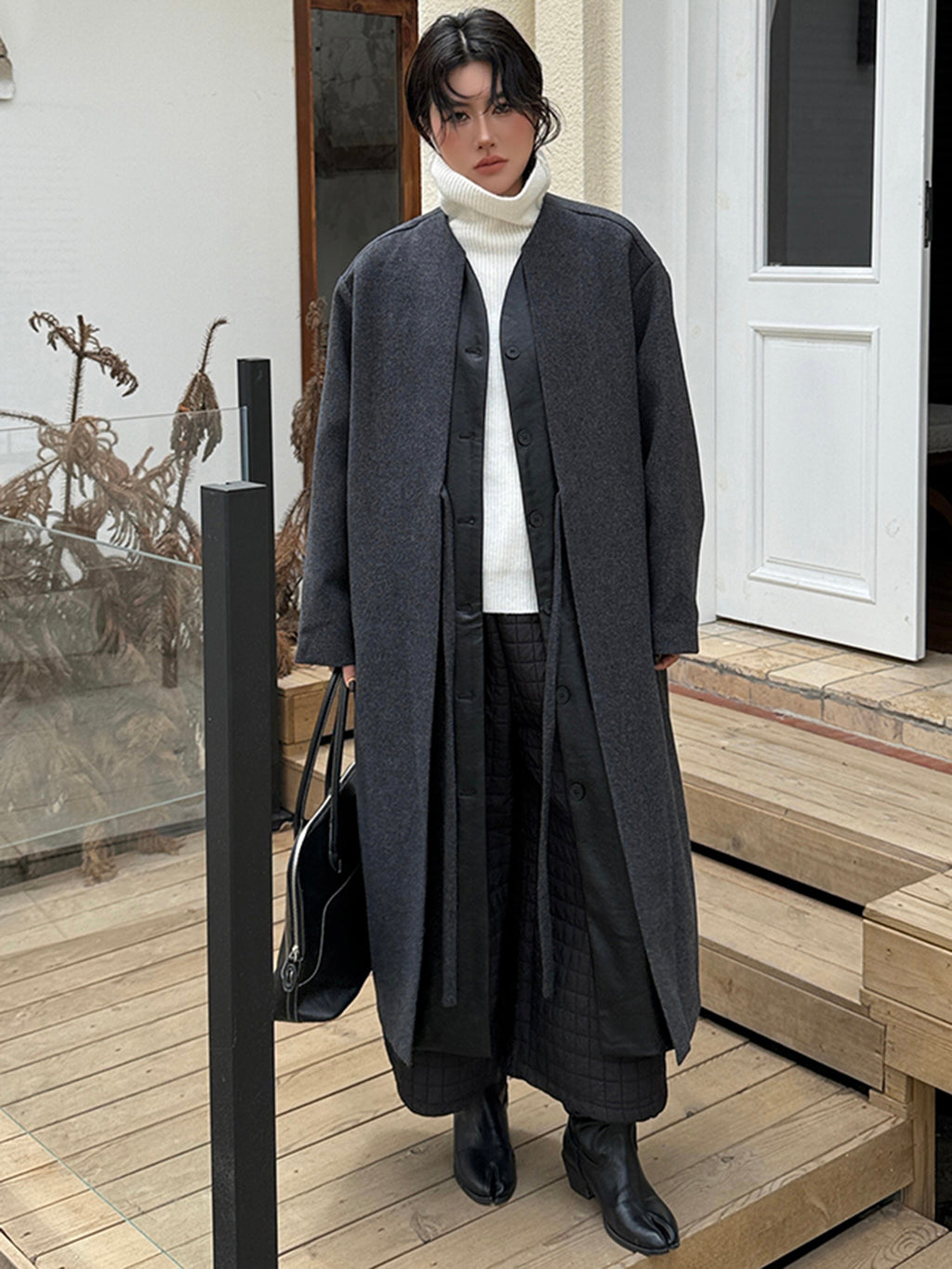 すっきりとしたノーカラーが印象的なロング丈コート。表面はウール調の起毛感を持ち、やわらかな質感が体を包み込むようにフィット。内側には光沢のある生地を配し、前合わせから覗くことでモード感のあるレイヤード風に仕上げている。ドロップショルダーのラグランスリーブにより肩回りはゆとりがあり、全体的にやや丸みを帯びたリラクシーなシルエット。重ね着にも適した余白感があり、日常のスタイルから都市的なモードコーデまで活用できる汎用性の高い一枚。