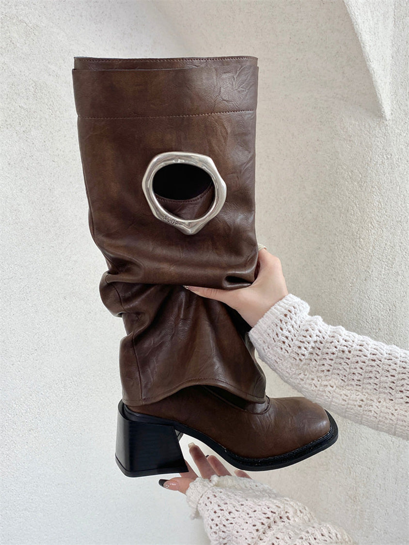 筒の側面に配置されたオーバルフォルムのメタルリングが視線を引き寄せ、無機質なアクセントとして全体の印象を引き締める構成。ややくったりとした質感のアッパーが自然なドレープを描き、直線的なフォルムに奥行きを与える。つま先は丸みを帯びたスクエア寄りのラインで、足元に柔らかな輪郭を添える設計。安定感のあるブロックヒールと厚みのあるアウトソールが歩行時のリズムを整え、全体の重心バランスを美しく保つ。
