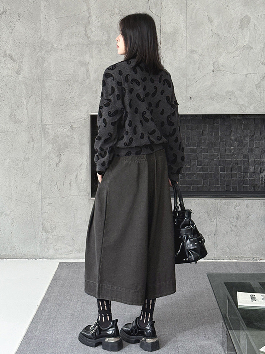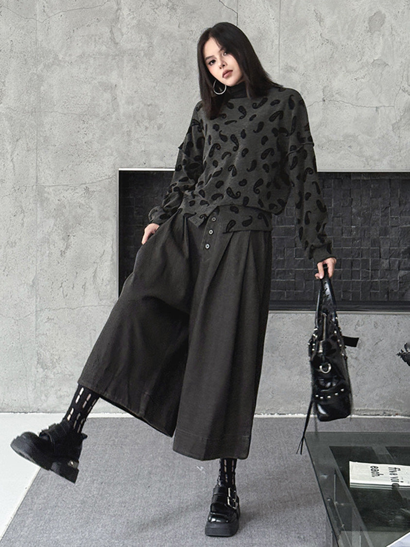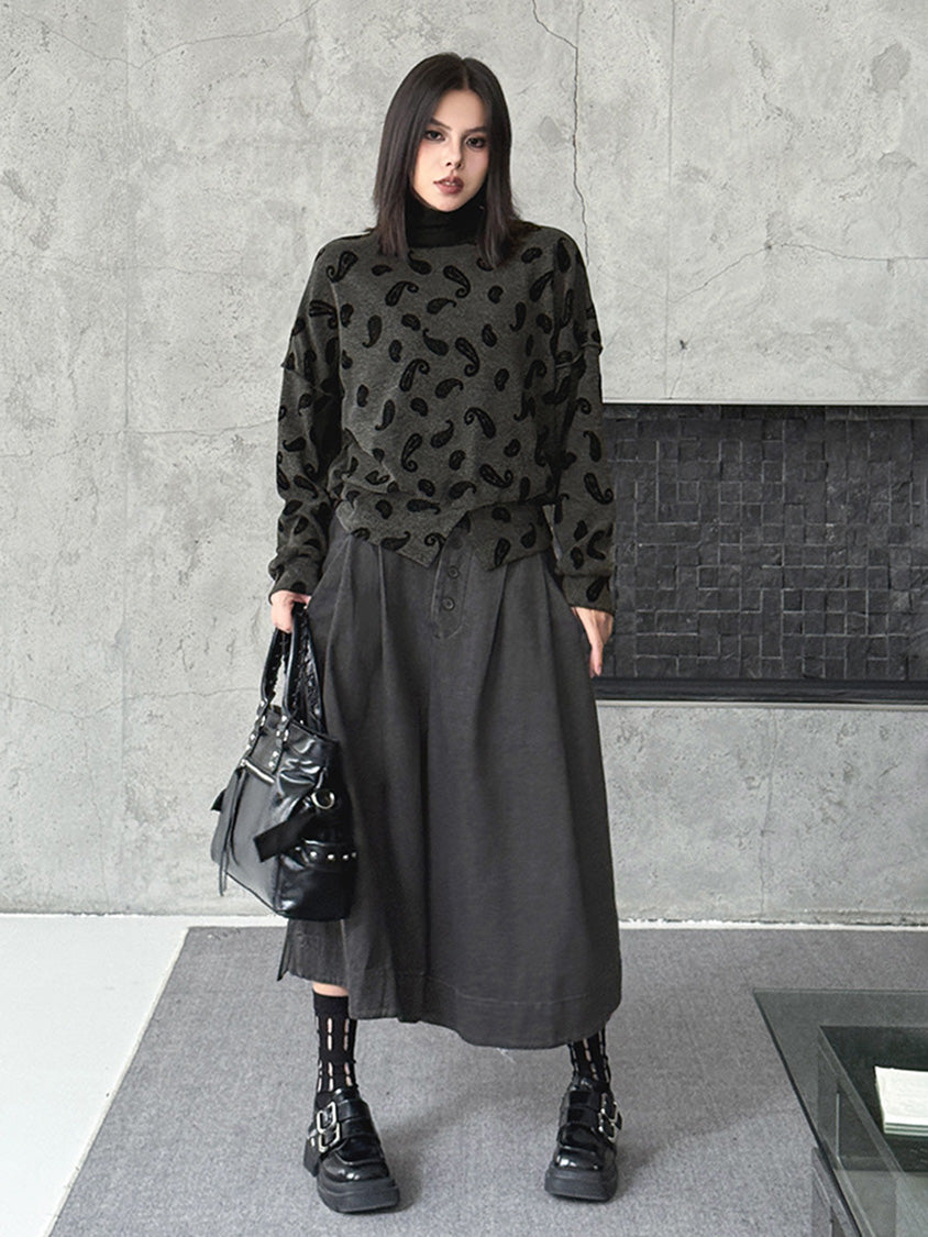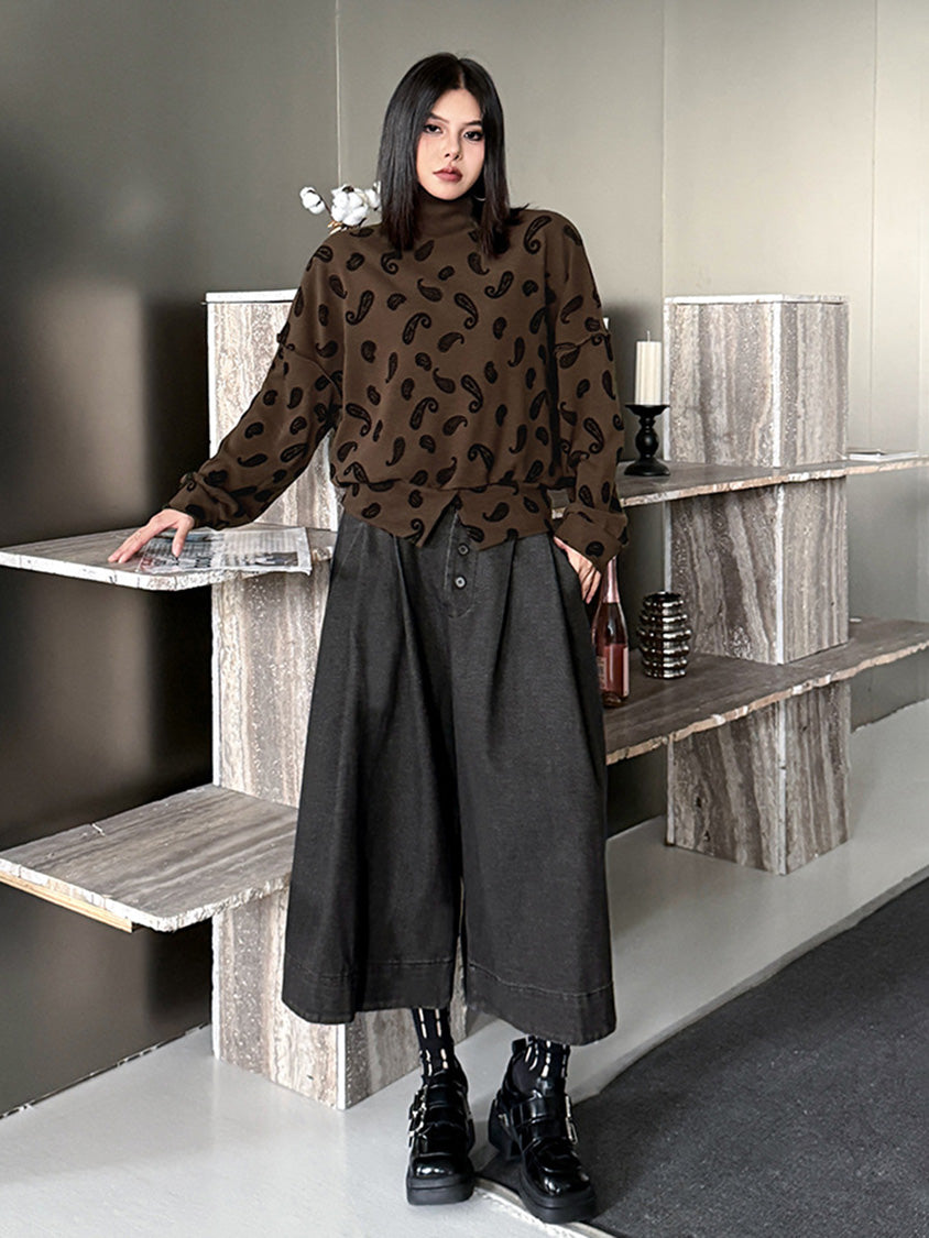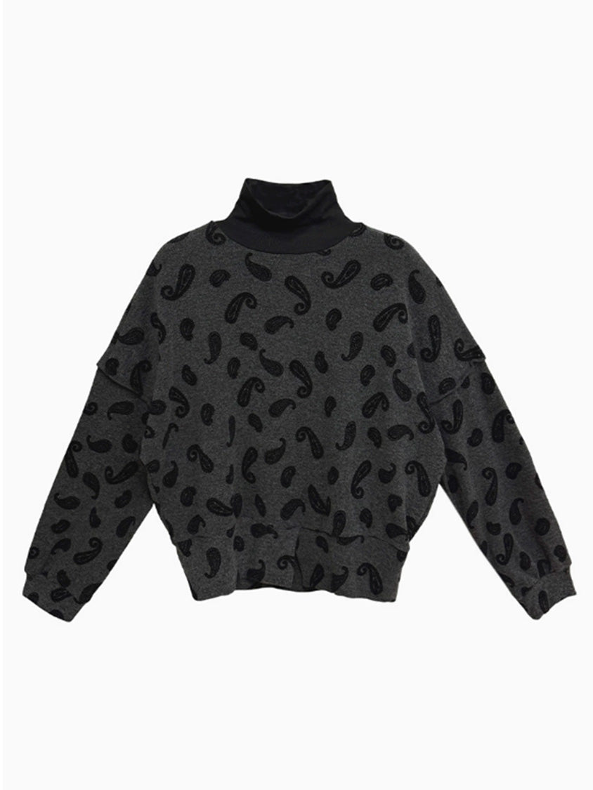 起毛感を抑えたコットン生地にペイズリー模様を重ね、柔らかい膨らみをもたせたモックネックトップと、広めのラインで構築されたワイドパンツの組み合わせ。トップは肩線を落としたゆとりあるフォルムで、裾まわりに自然な丸みが生まれる設計。パンツは深めのタックで立体感をつくり、ボリュームのあるシルエットを保ちながらも動きやすい構成。全体が重心を下げすぎず、緩やかなメリハリを生むシリーズ。