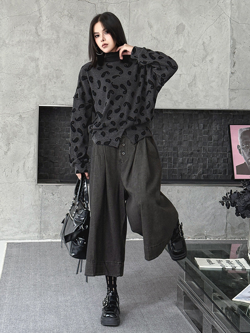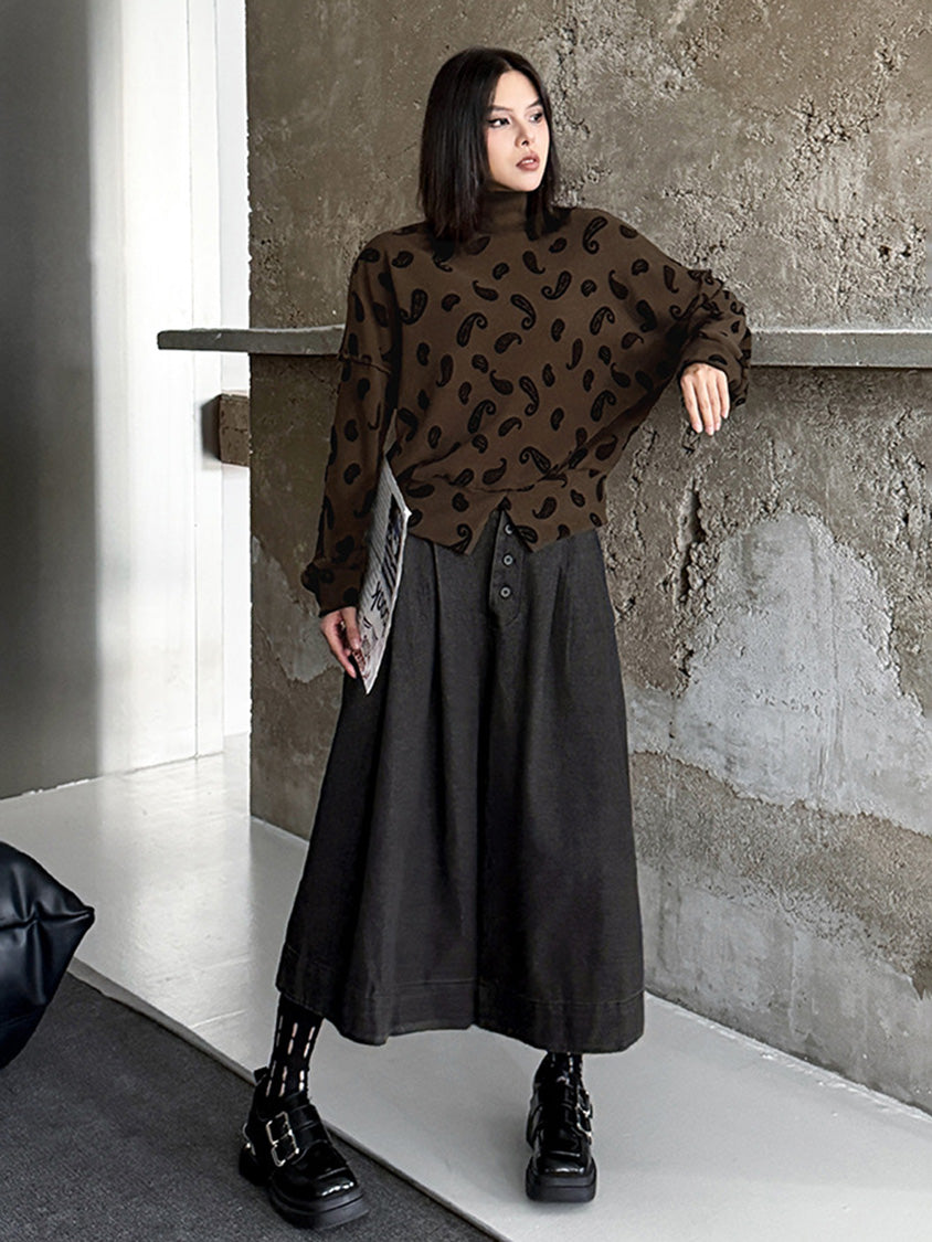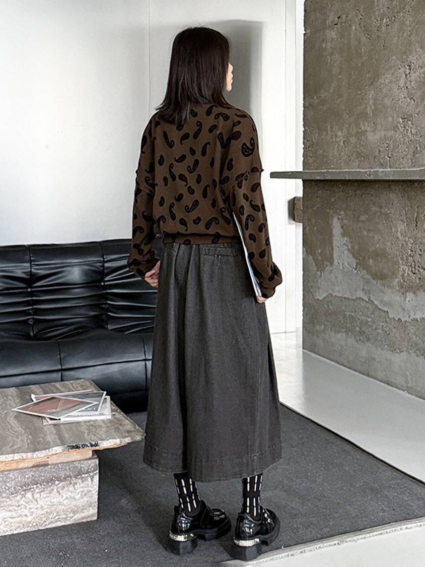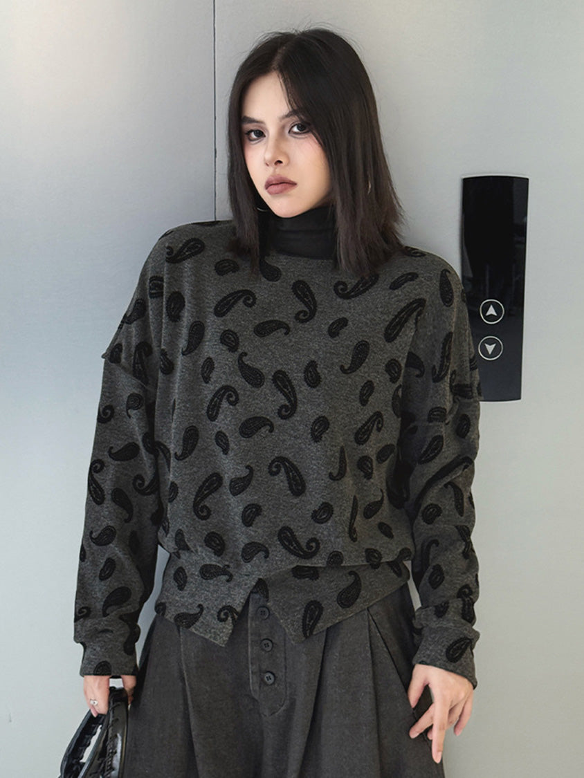 起毛感を抑えたコットン生地にペイズリー模様を重ね、柔らかい膨らみをもたせたモックネックトップと、広めのラインで構築されたワイドパンツの組み合わせ。トップは肩線を落としたゆとりあるフォルムで、裾まわりに自然な丸みが生まれる設計。パンツは深めのタックで立体感をつくり、ボリュームのあるシルエットを保ちながらも動きやすい構成。全体が重心を下げすぎず、緩やかなメリハリを生むシリーズ。