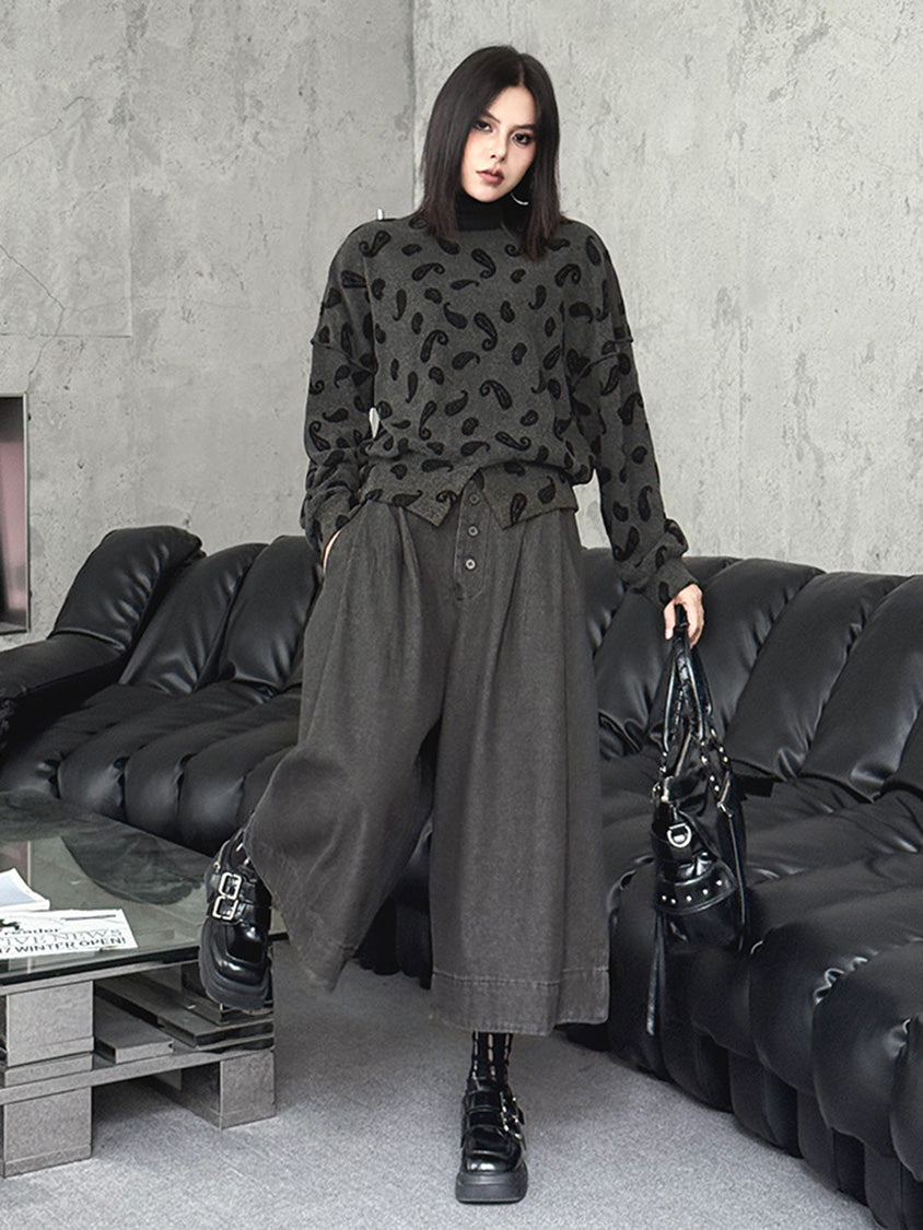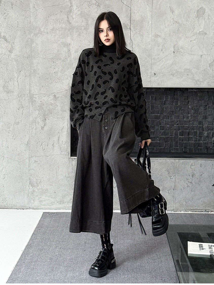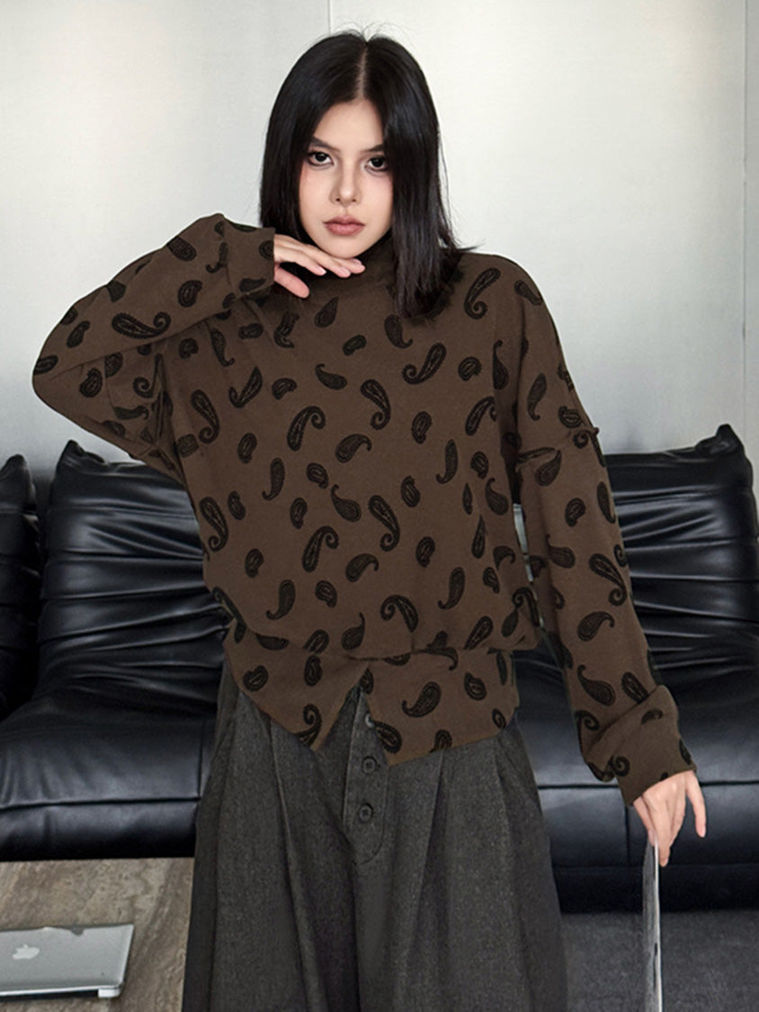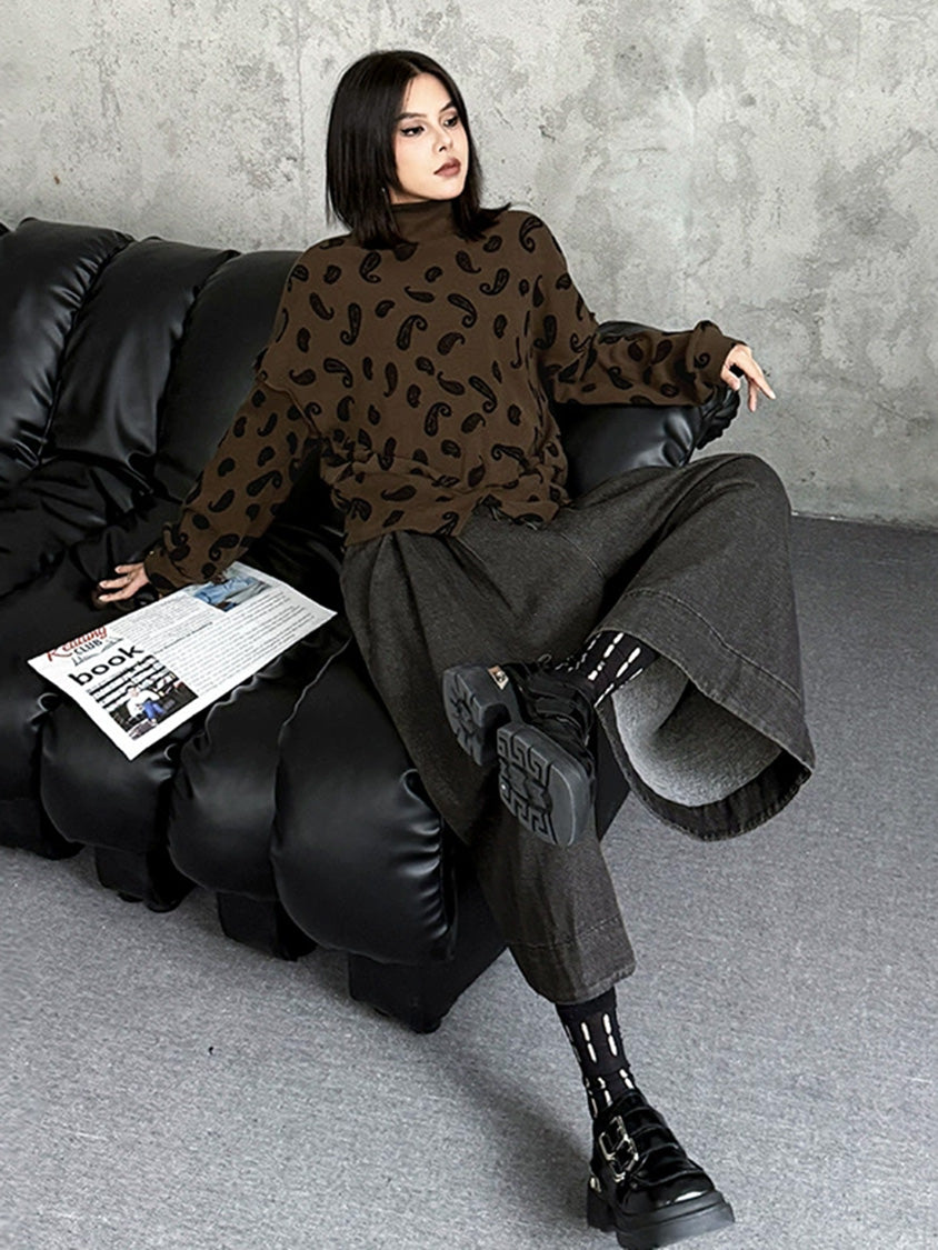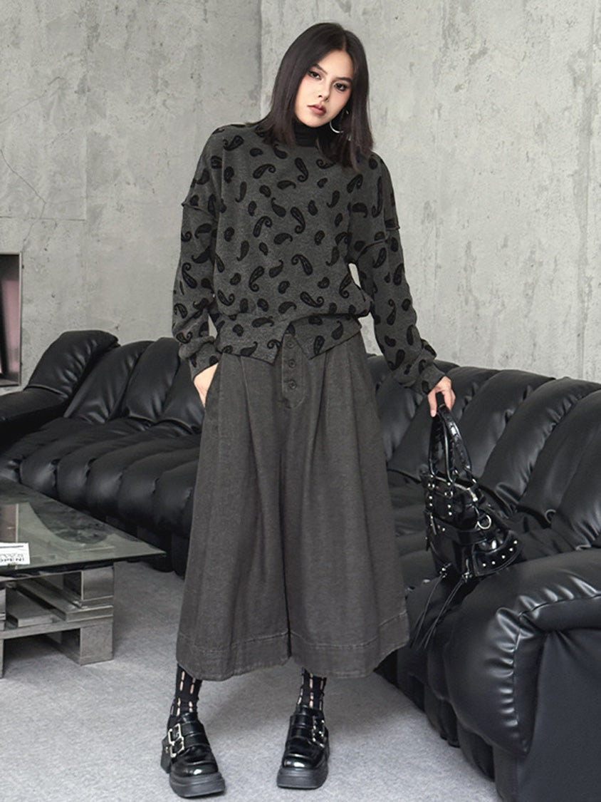 起毛感を抑えたコットン生地にペイズリー模様を重ね、柔らかい膨らみをもたせたモックネックトップと、広めのラインで構築されたワイドパンツの組み合わせ。トップは肩線を落としたゆとりあるフォルムで、裾まわりに自然な丸みが生まれる設計。パンツは深めのタックで立体感をつくり、ボリュームのあるシルエットを保ちながらも動きやすい構成。全体が重心を下げすぎず、緩やかなメリハリを生むシリーズ。