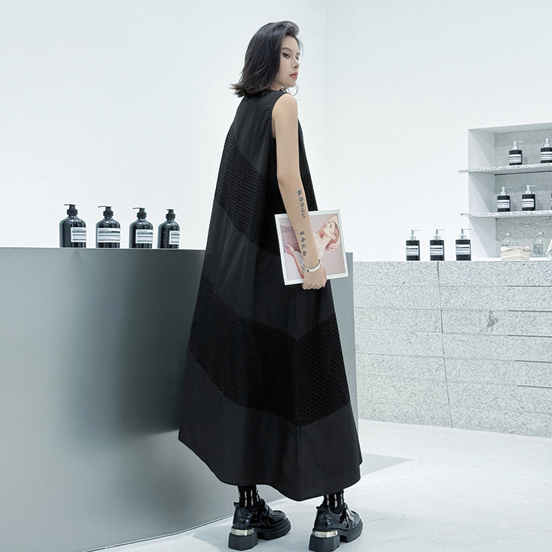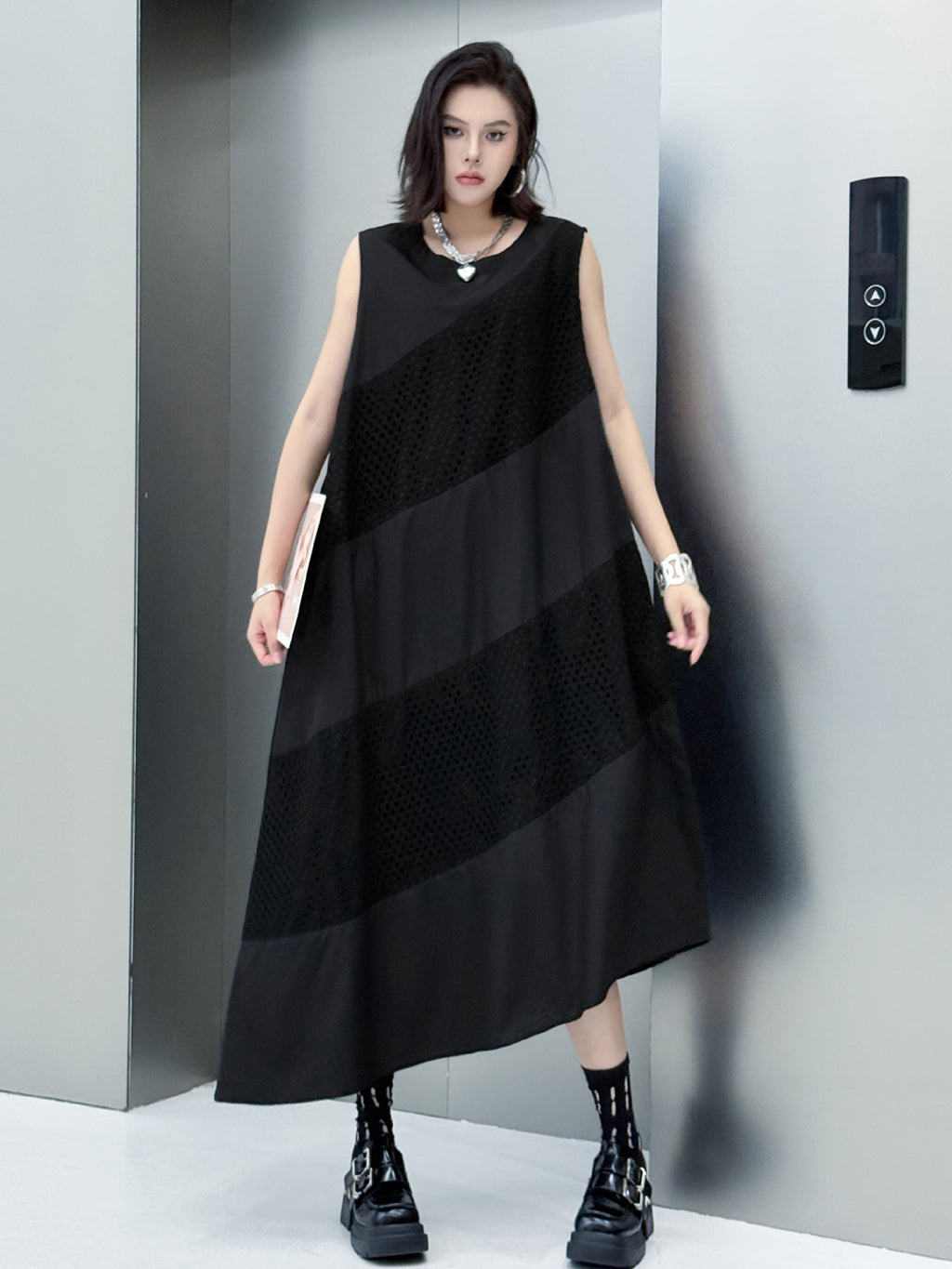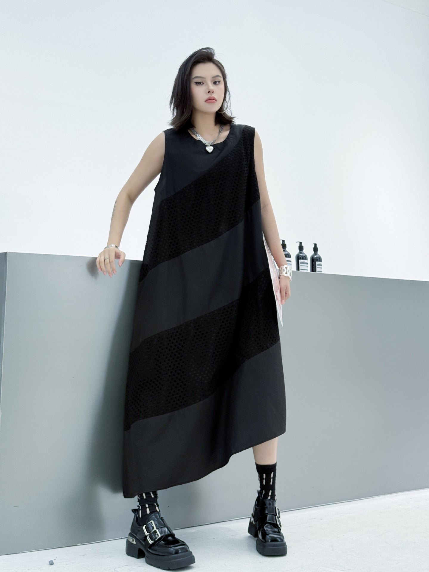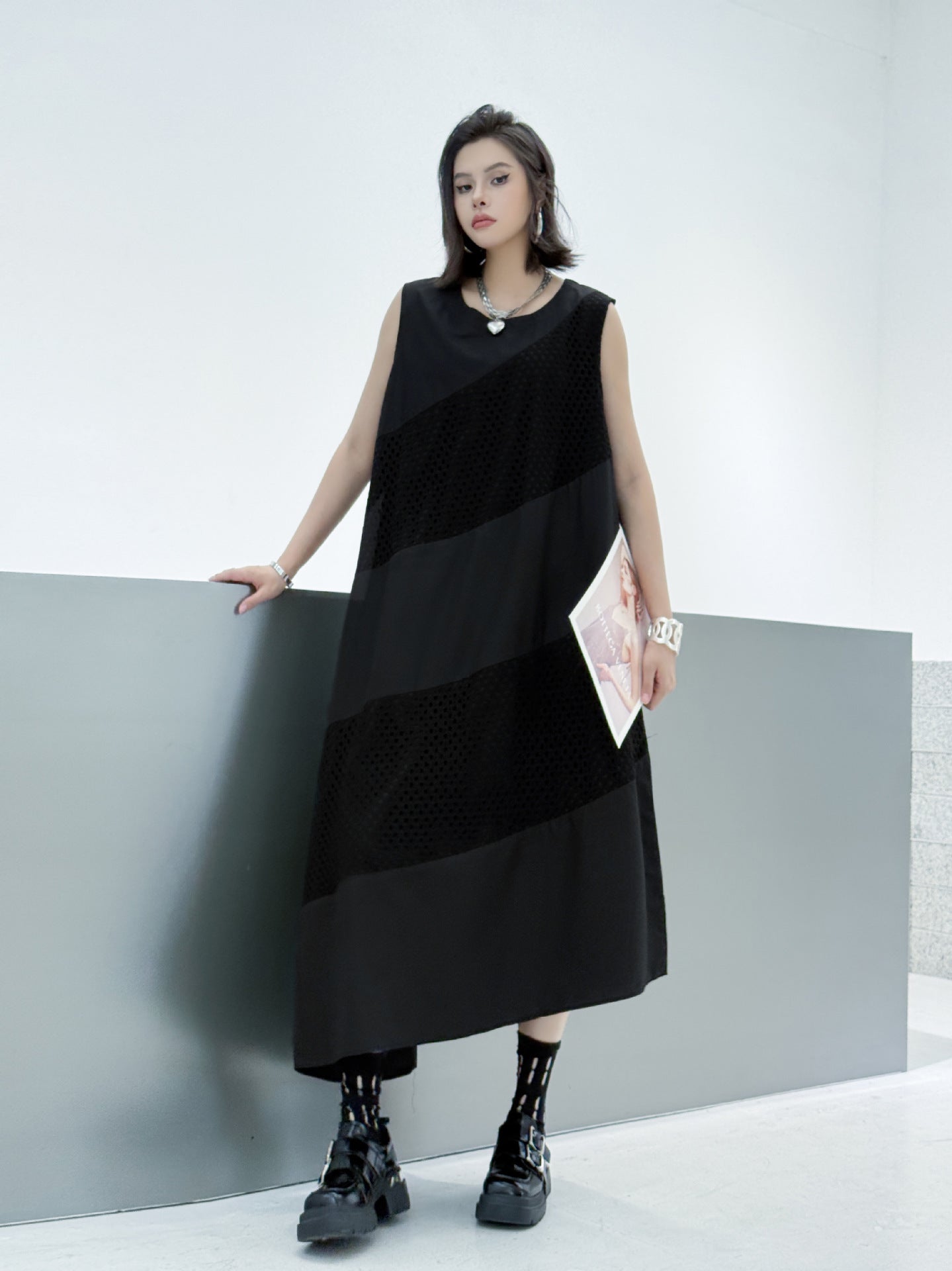 艶を抑えた布帛とドット状のメッシュ素材を斜めに切り替えたコンビネーションデザインが目を引くロングドレス。全体はIライン寄りのAラインシルエットで、ほどよいボリュームがありながらもすっきりとした印象を保つ。アームホールやネックラインはミニマルに処理され、構築的な切り替えラインが視覚的に縦長のラインを強調。フラットシューズから厚底まで幅広く合わせられるデザインで、都会的でエッジの効いた着こなしが完成する。