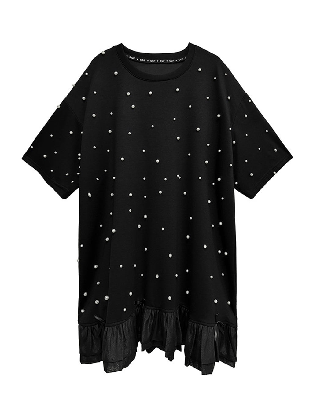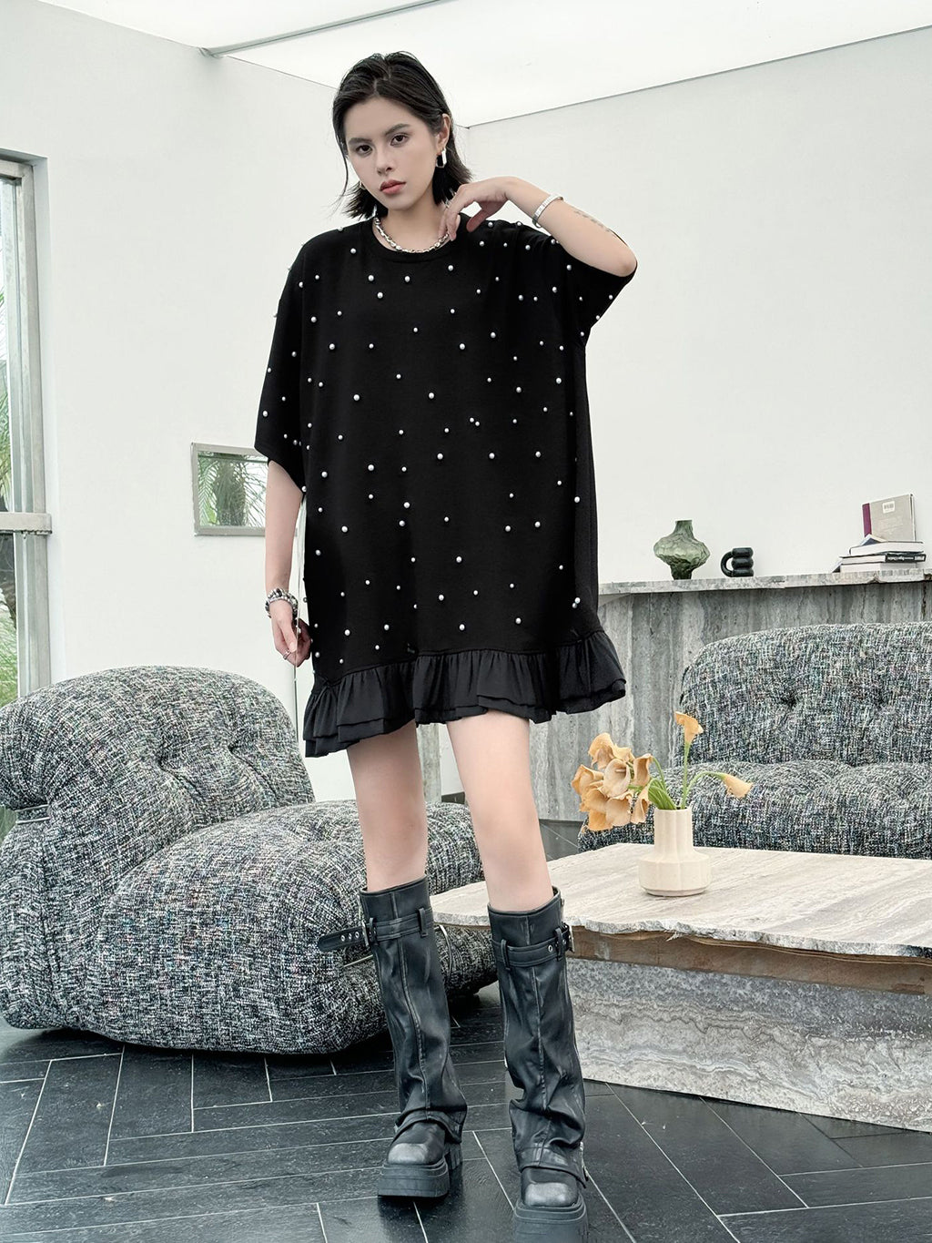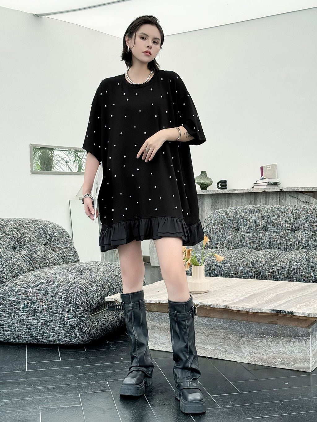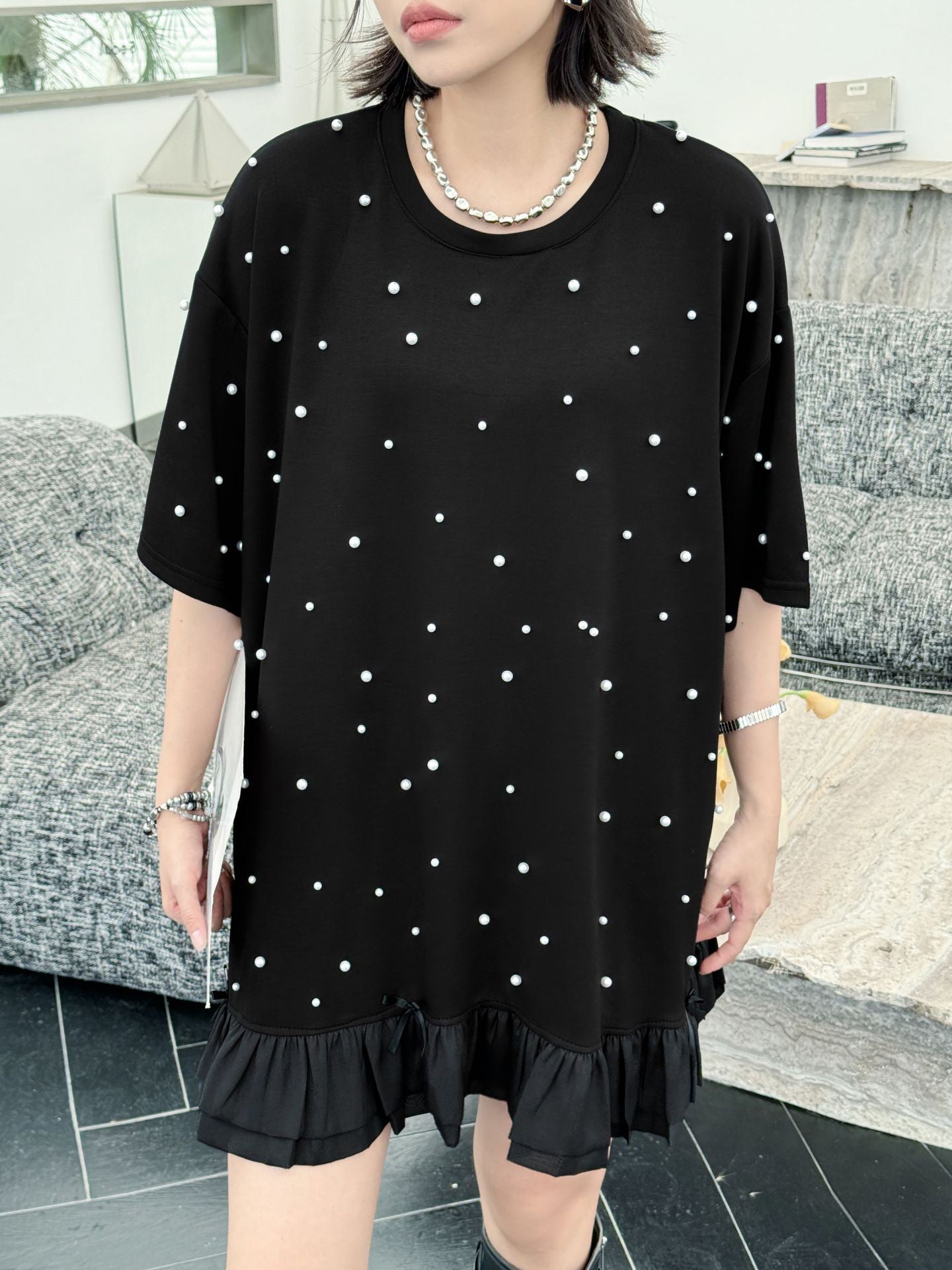しっかりとした厚みのあるブラック生地に、大小のパールを散りばめたインパクトのあるデザイン。ゆったりとしたシルエットで体のラインを拾いにくく、裾のティアード風フリルが軽やかさを演出。上品な光沢のあるディテールとリラクシーな着心地のバランスが印象的。パールの立体感がシンプルなワンカラーに奥行きを加え、アクセ要らずでもスタイルが完成する一着。