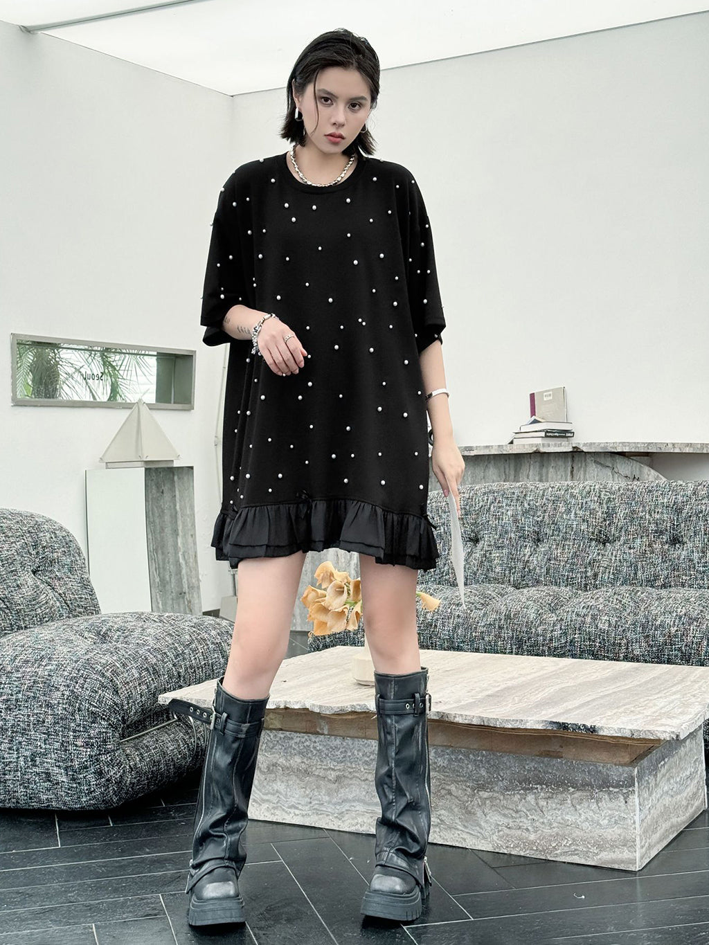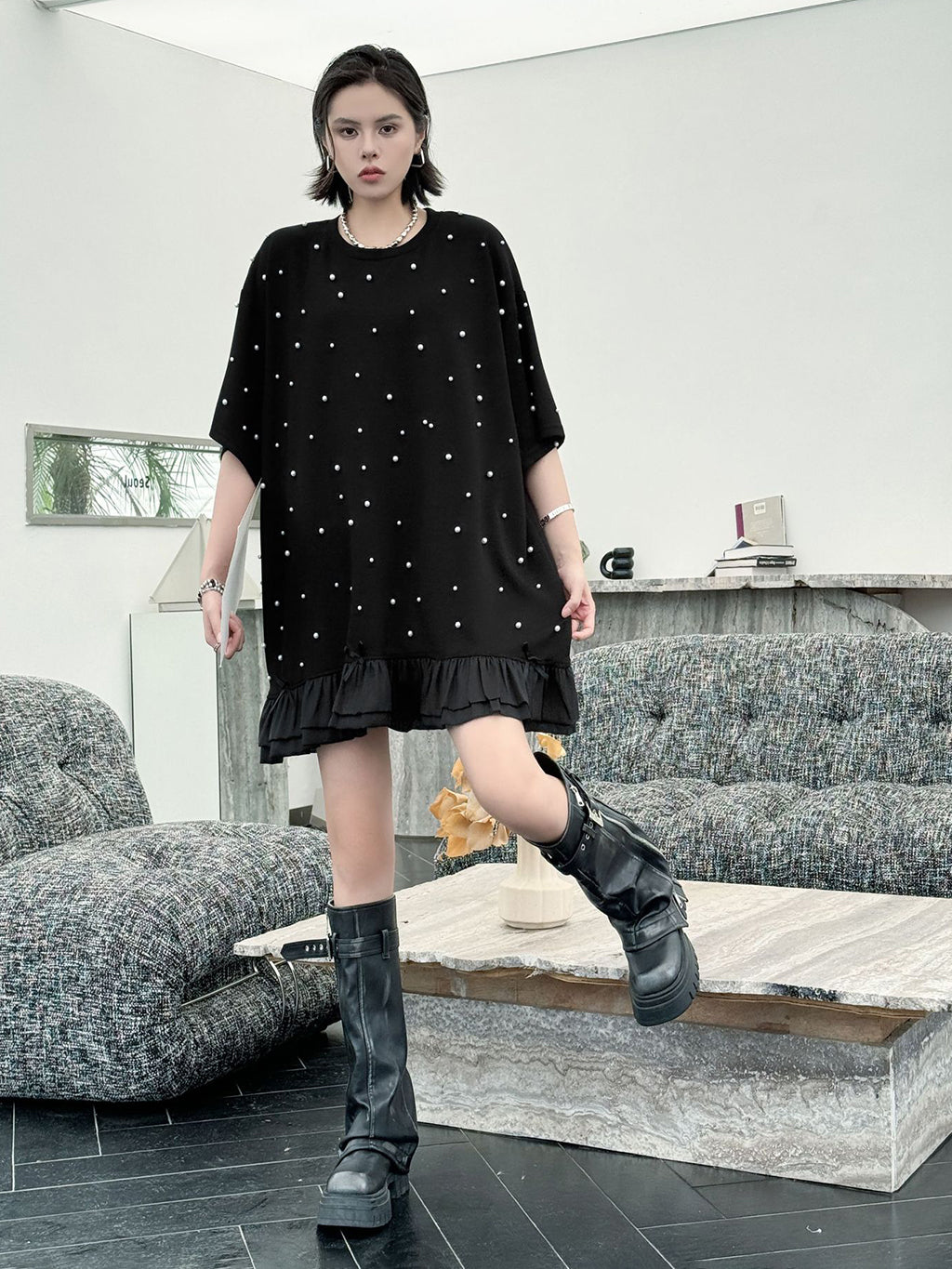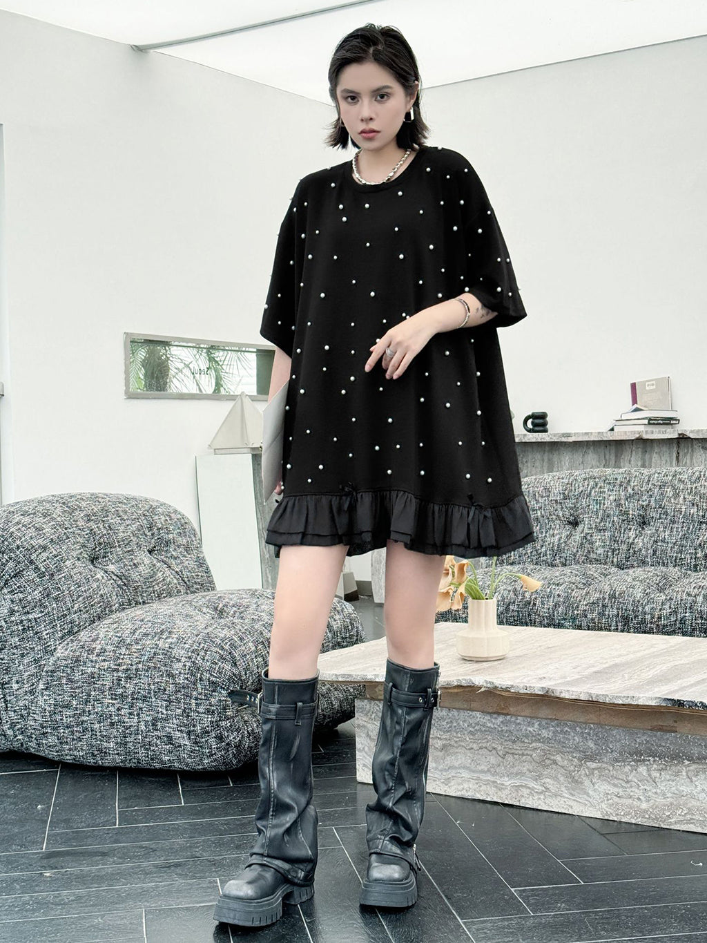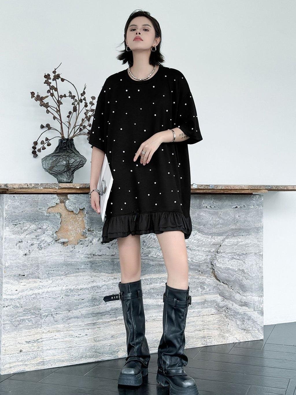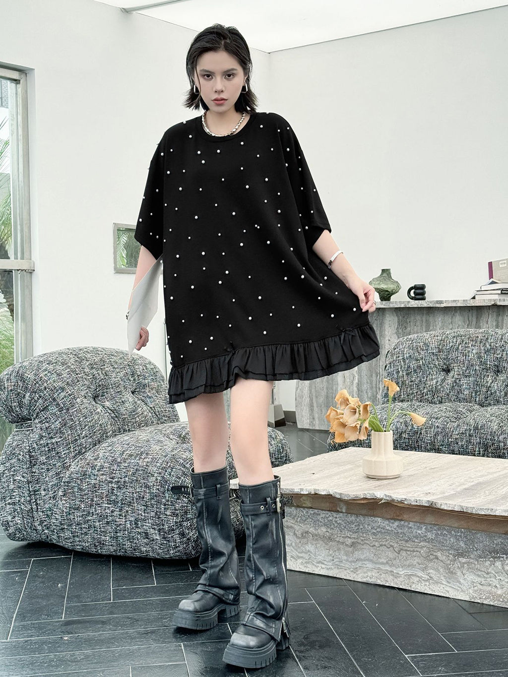 しっかりとした厚みのあるブラック生地に、大小のパールを散りばめたインパクトのあるデザイン。ゆったりとしたシルエットで体のラインを拾いにくく、裾のティアード風フリルが軽やかさを演出。上品な光沢のあるディテールとリラクシーな着心地のバランスが印象的。パールの立体感がシンプルなワンカラーに奥行きを加え、アクセ要らずでもスタイルが完成する一着。