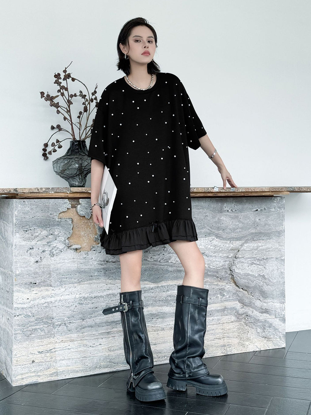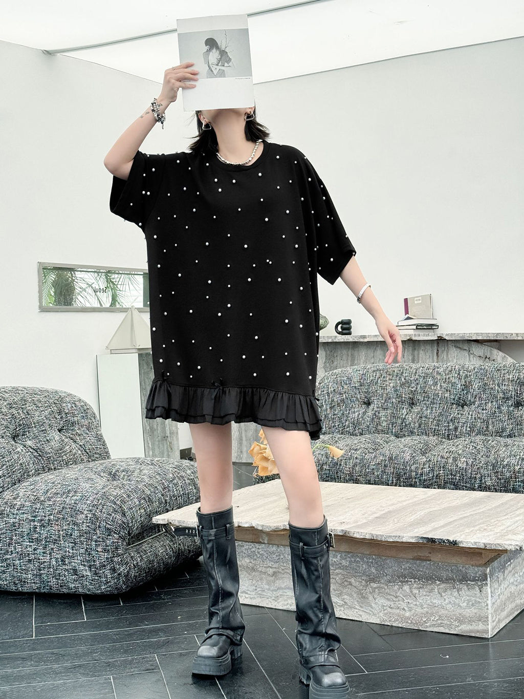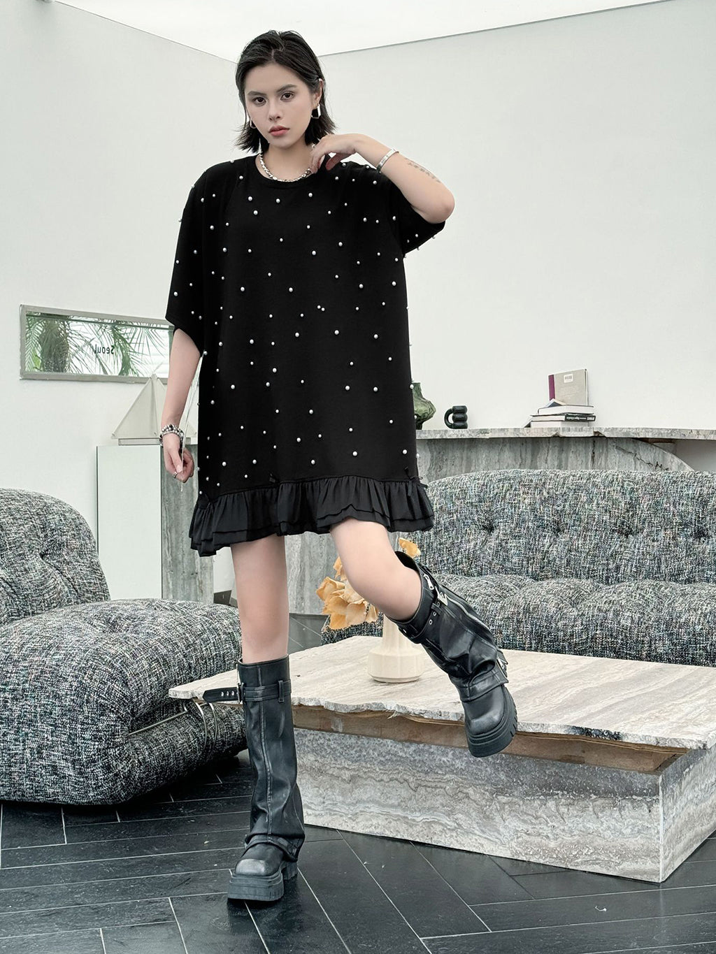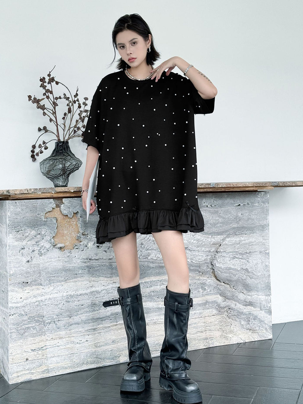 しっかりとした厚みのあるブラック生地に、大小のパールを散りばめたインパクトのあるデザイン。ゆったりとしたシルエットで体のラインを拾いにくく、裾のティアード風フリルが軽やかさを演出。上品な光沢のあるディテールとリラクシーな着心地のバランスが印象的。パールの立体感がシンプルなワンカラーに奥行きを加え、アクセ要らずでもスタイルが完成する一着。
