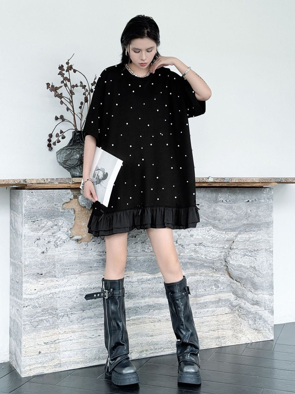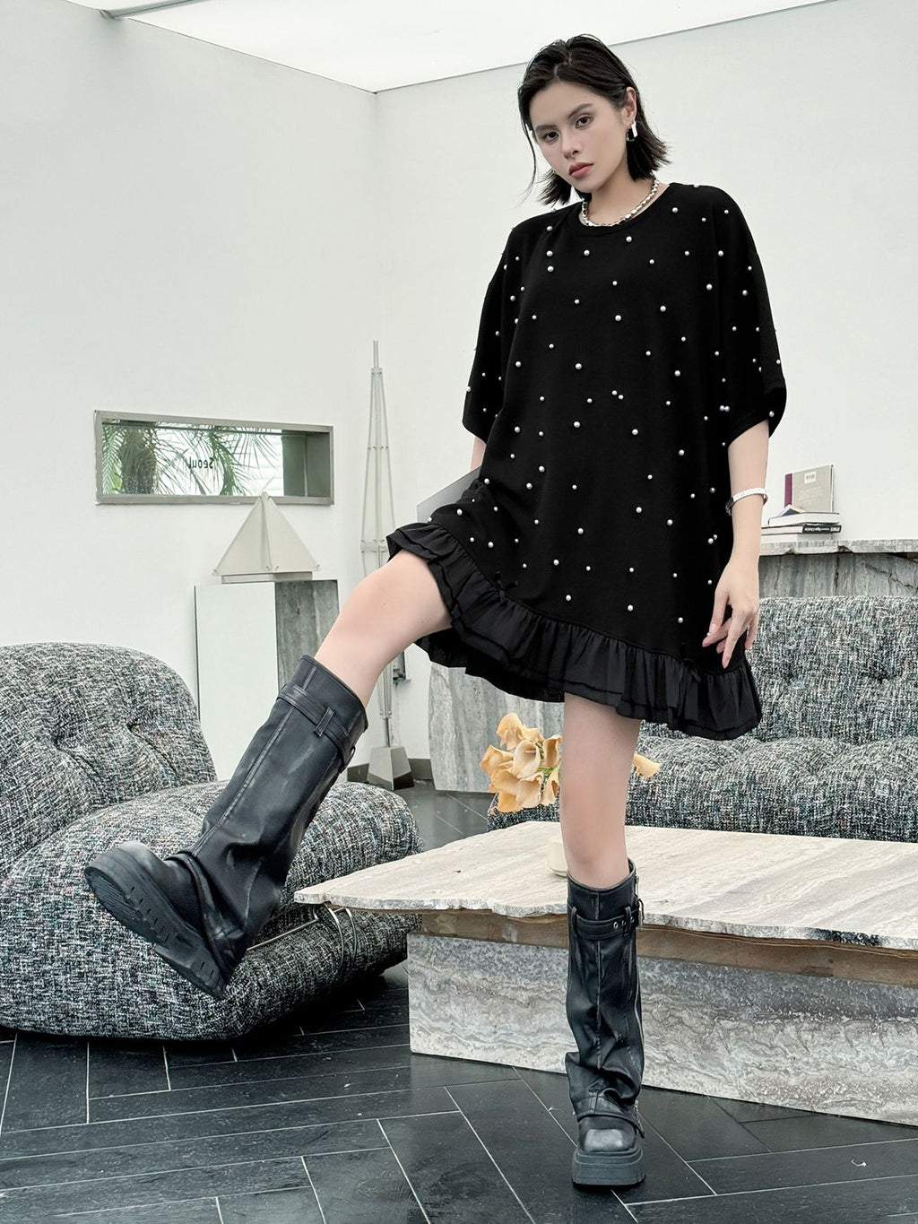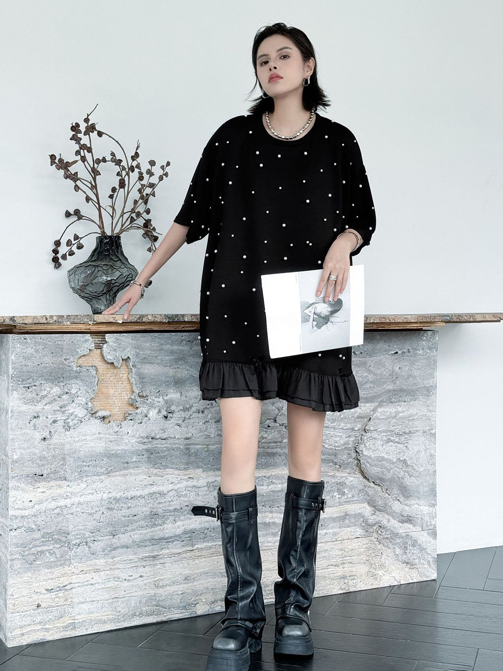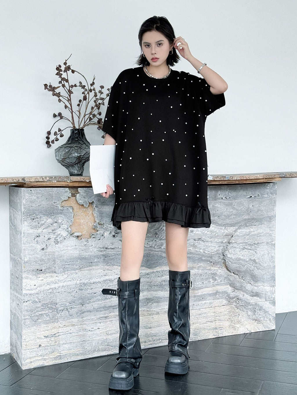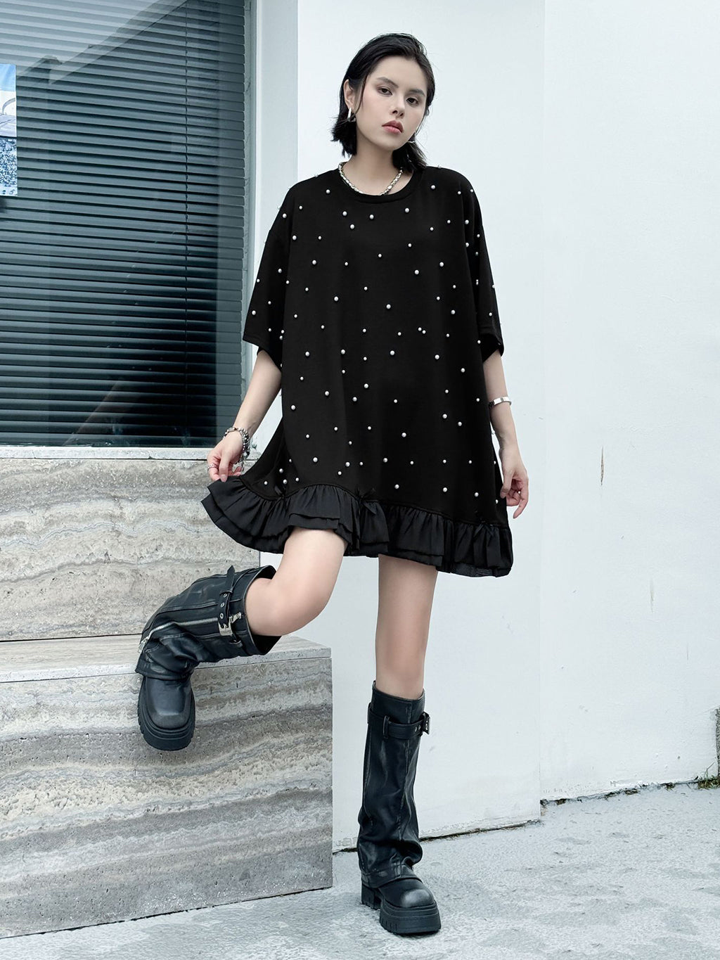 しっかりとした厚みのあるブラック生地に、大小のパールを散りばめたインパクトのあるデザイン。ゆったりとしたシルエットで体のラインを拾いにくく、裾のティアード風フリルが軽やかさを演出。上品な光沢のあるディテールとリラクシーな着心地のバランスが印象的。パールの立体感がシンプルなワンカラーに奥行きを加え、アクセ要らずでもスタイルが完成する一着。