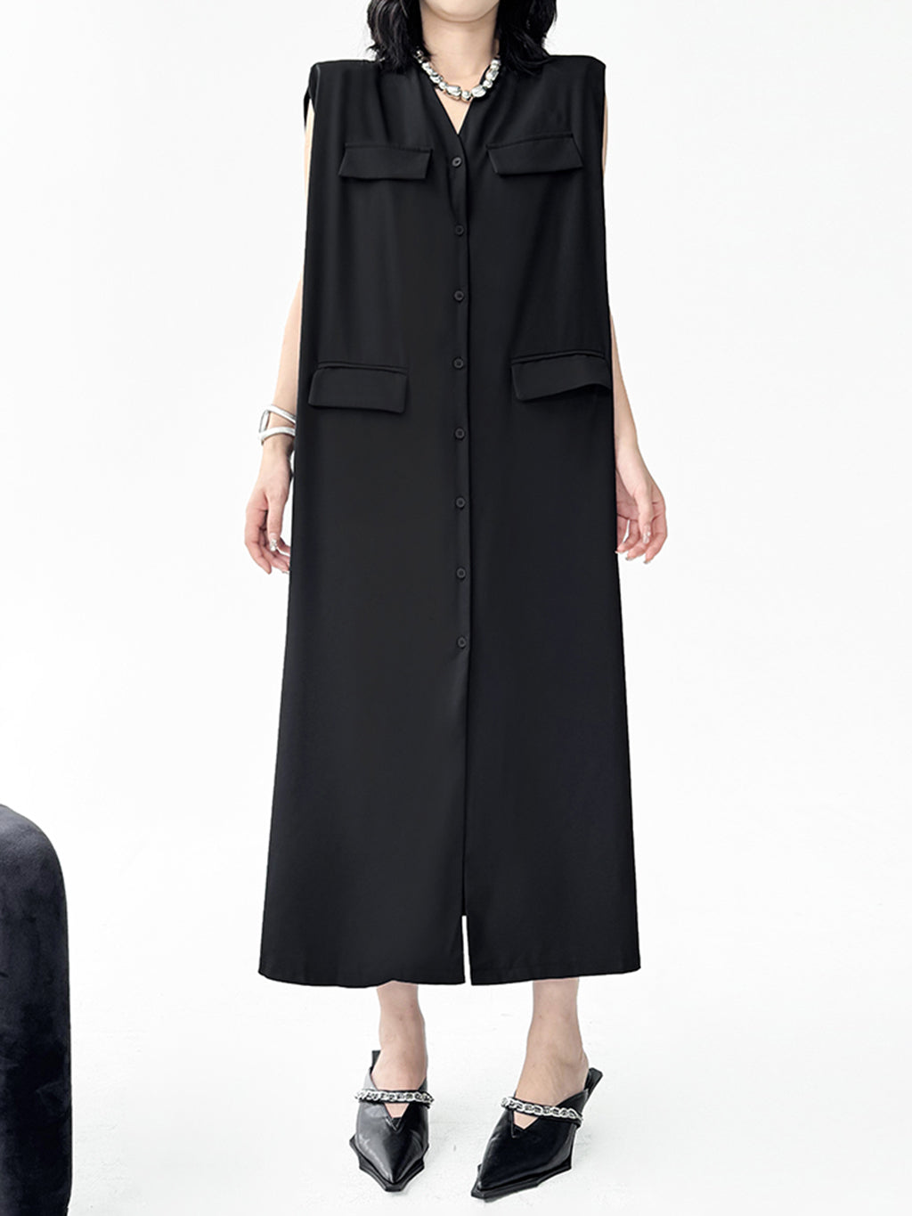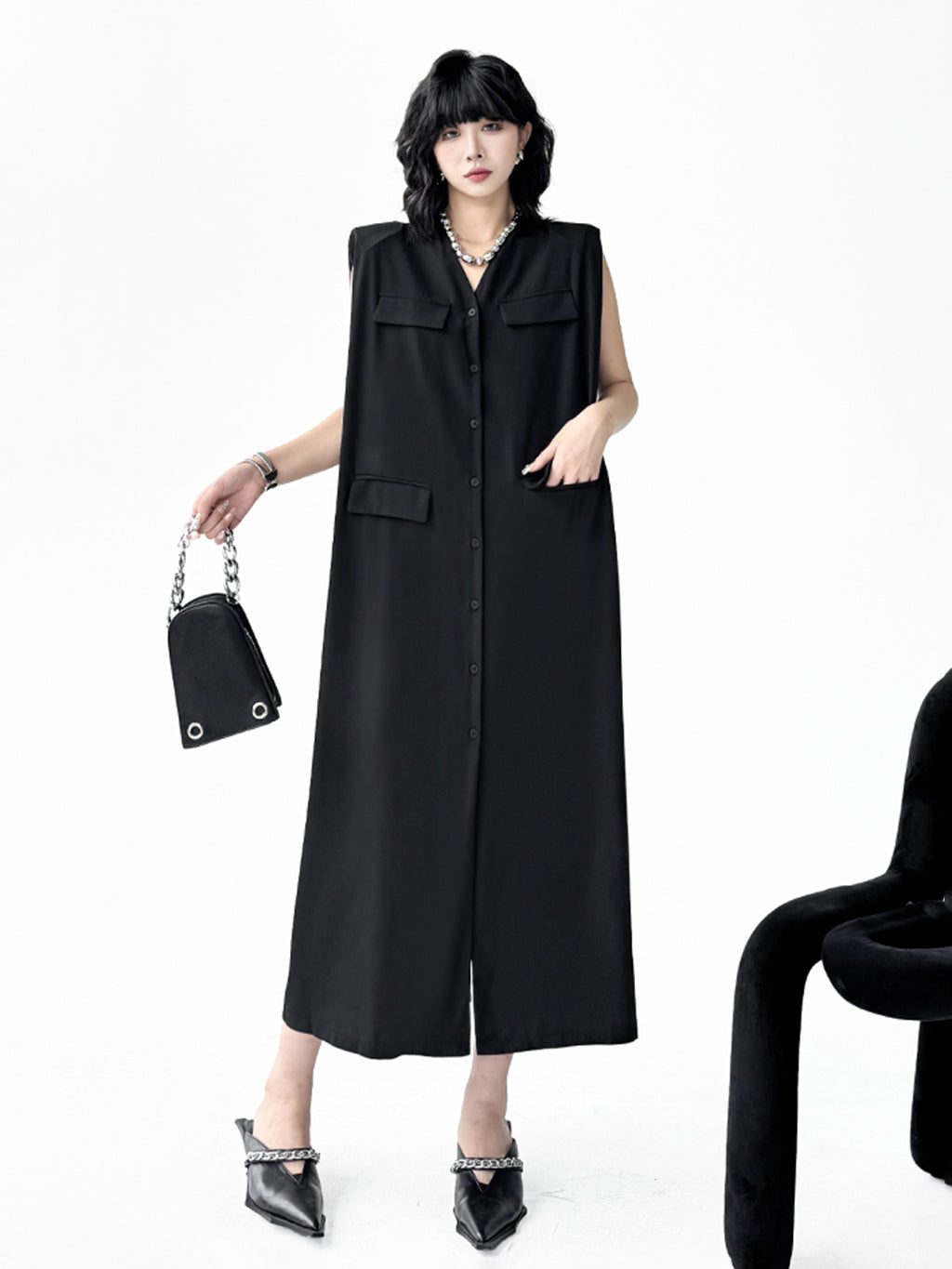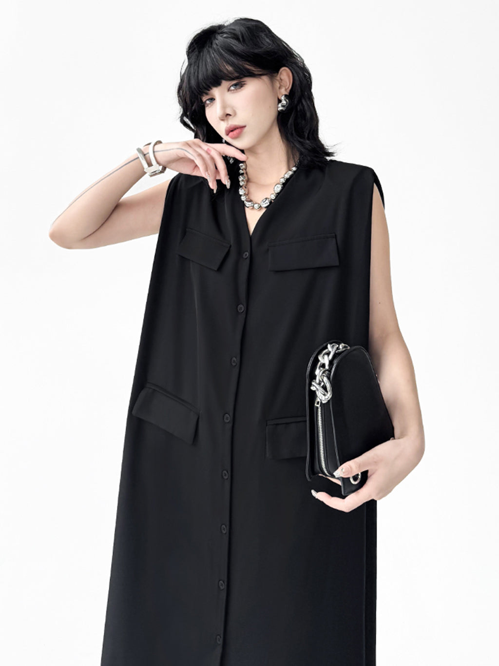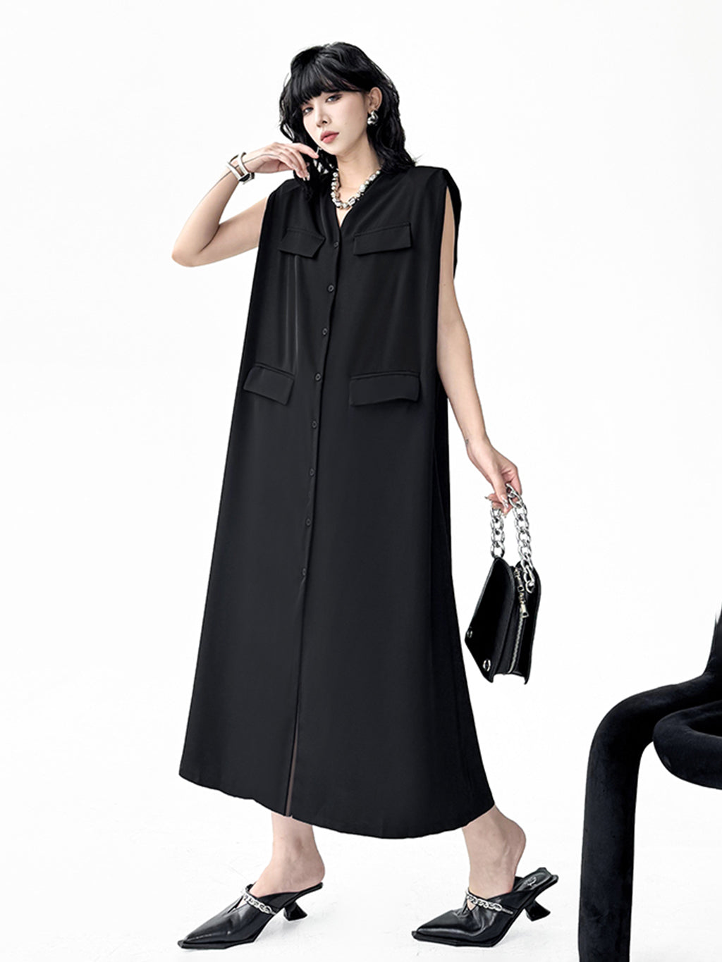 フロントに施された4つのフラップポケットが特徴的なロングジレドレス。肩に沿ってストンと落ちる直線的なシルエットは、体のラインを拾わず、エレガントな雰囲気を演出する。フロントボタンはトップから裾まで配され、さりげない縦のラインを強調。やや光沢感のある軽やかな生地が、モードな印象を引き立てる。