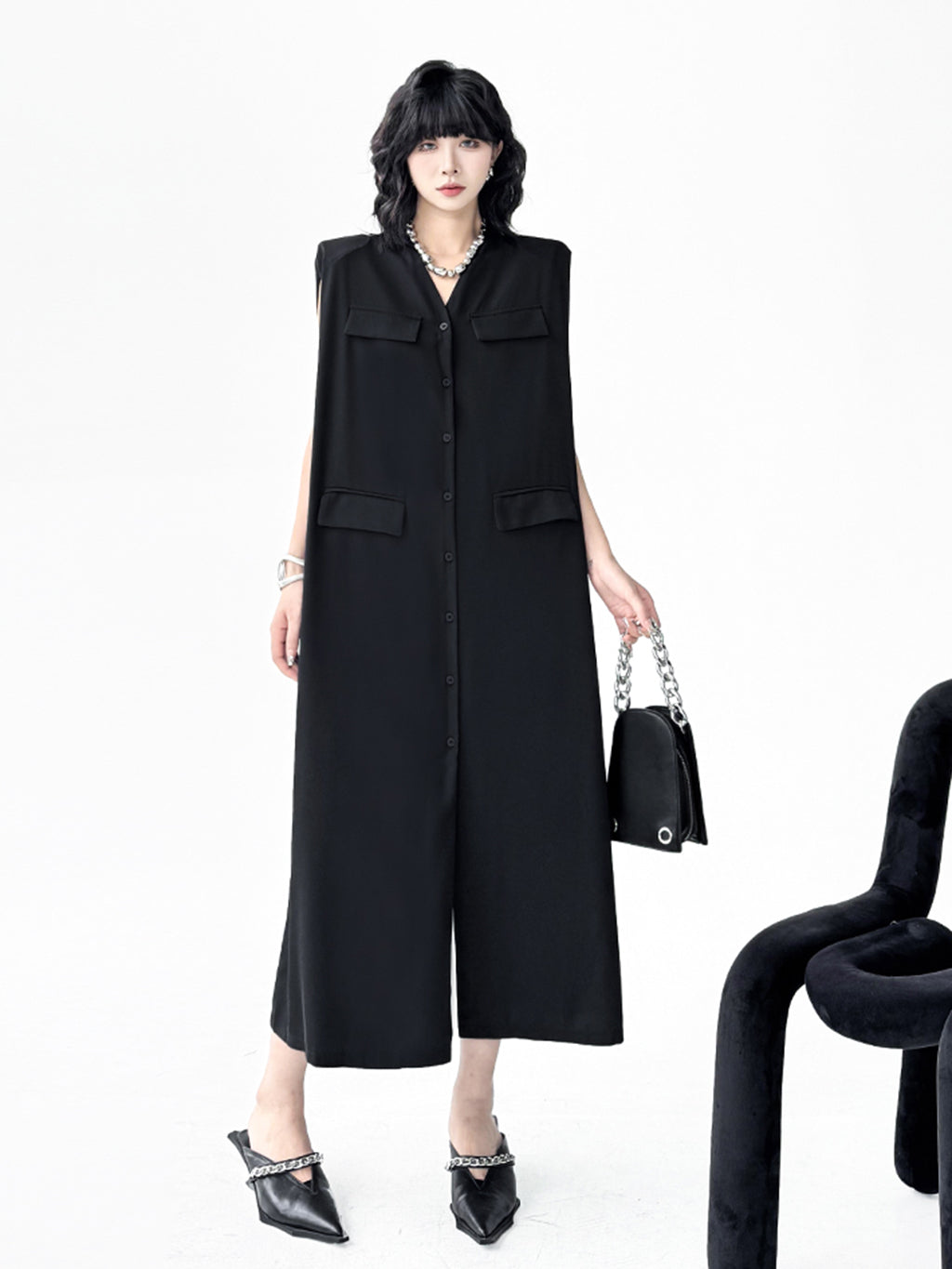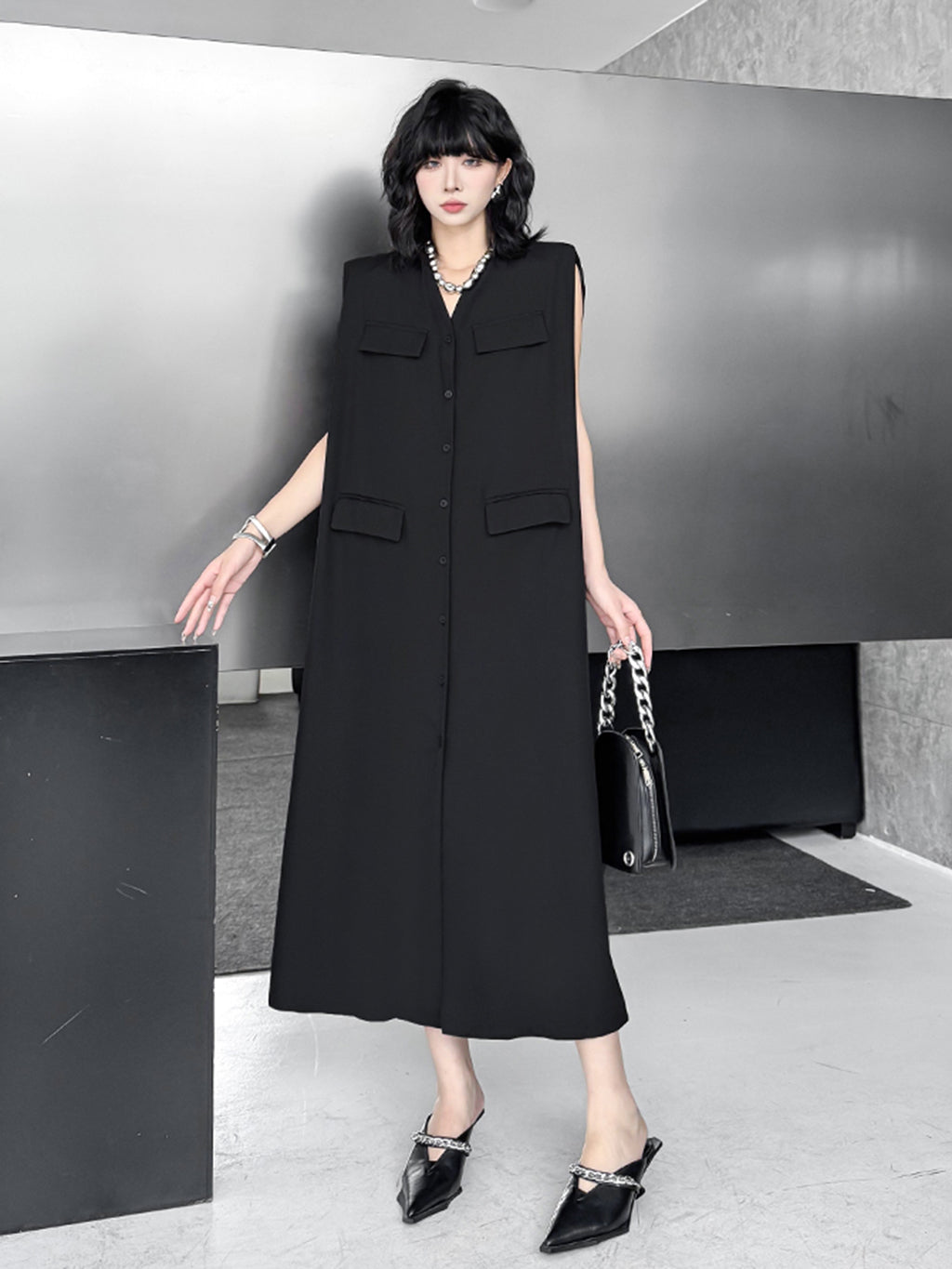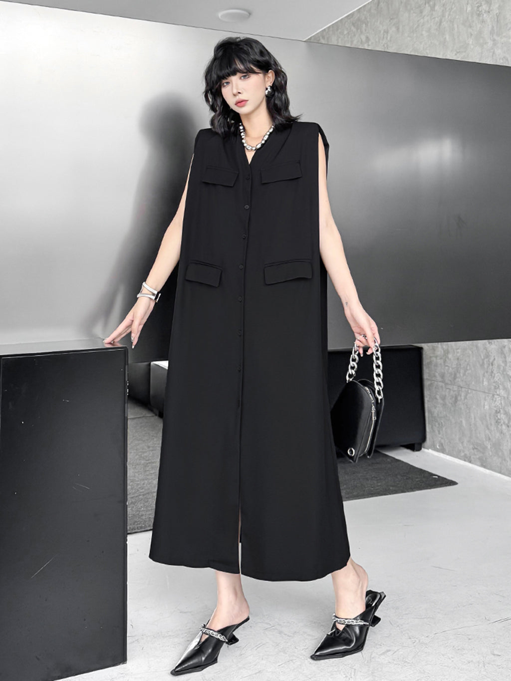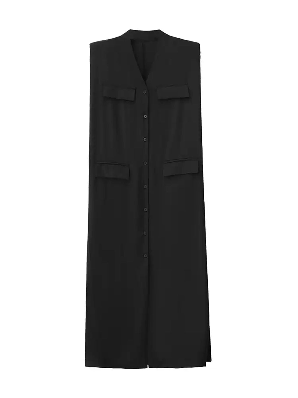 フロントに施された4つのフラップポケットが特徴的なロングジレドレス。肩に沿ってストンと落ちる直線的なシルエットは、体のラインを拾わず、エレガントな雰囲気を演出する。フロントボタンはトップから裾まで配され、さりげない縦のラインを強調。やや光沢感のある軽やかな生地が、モードな印象を引き立てる。
