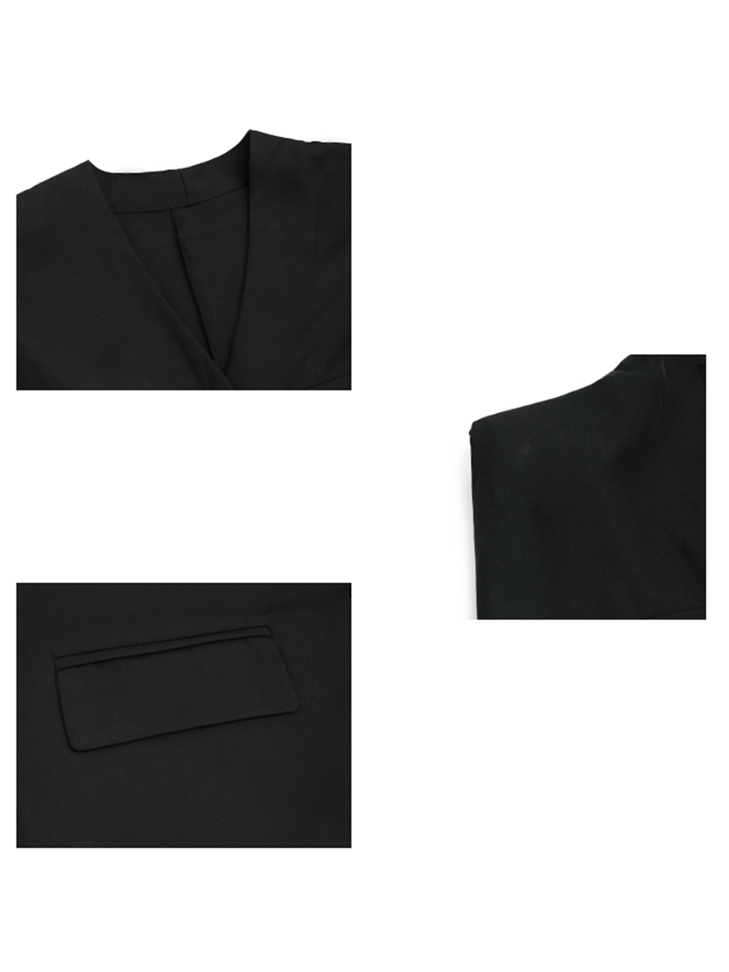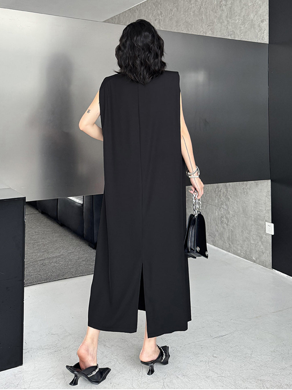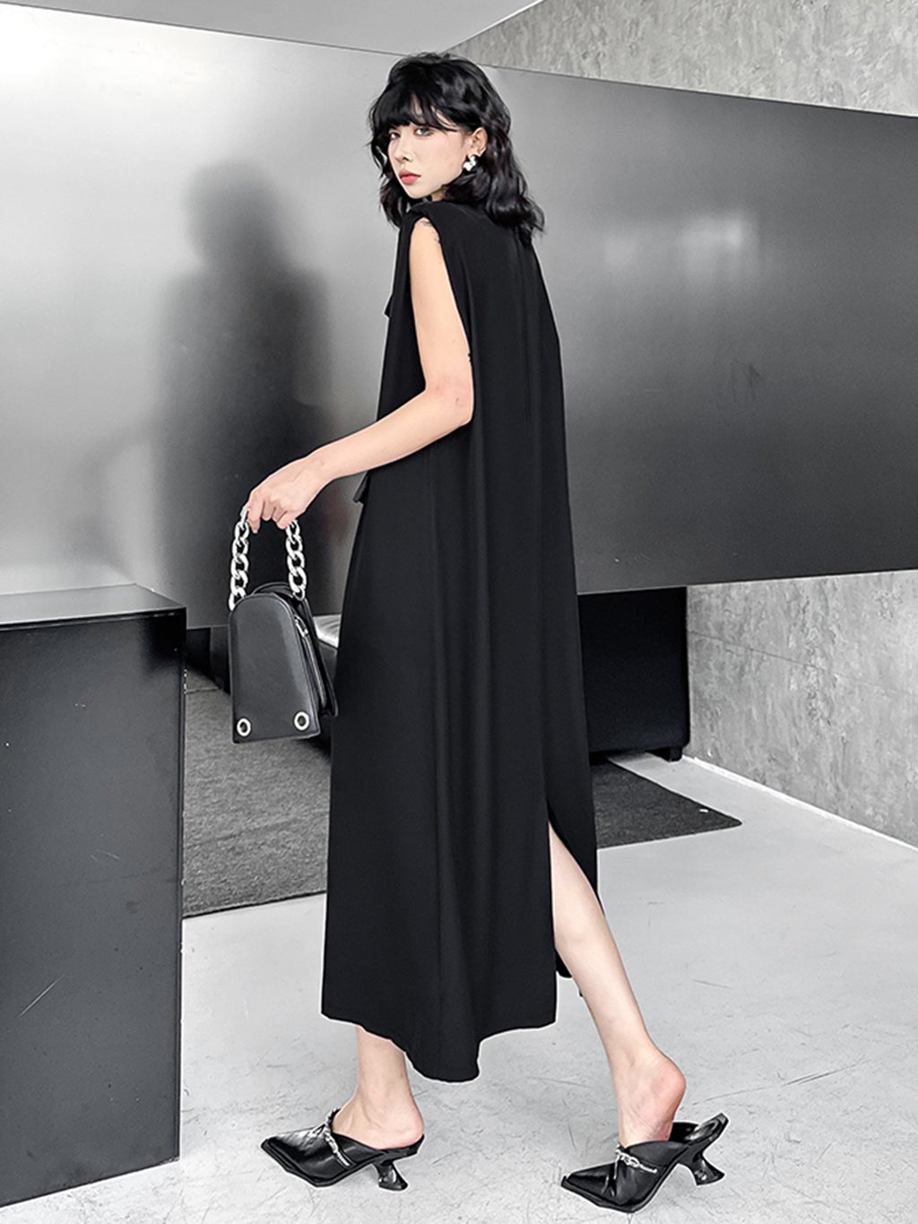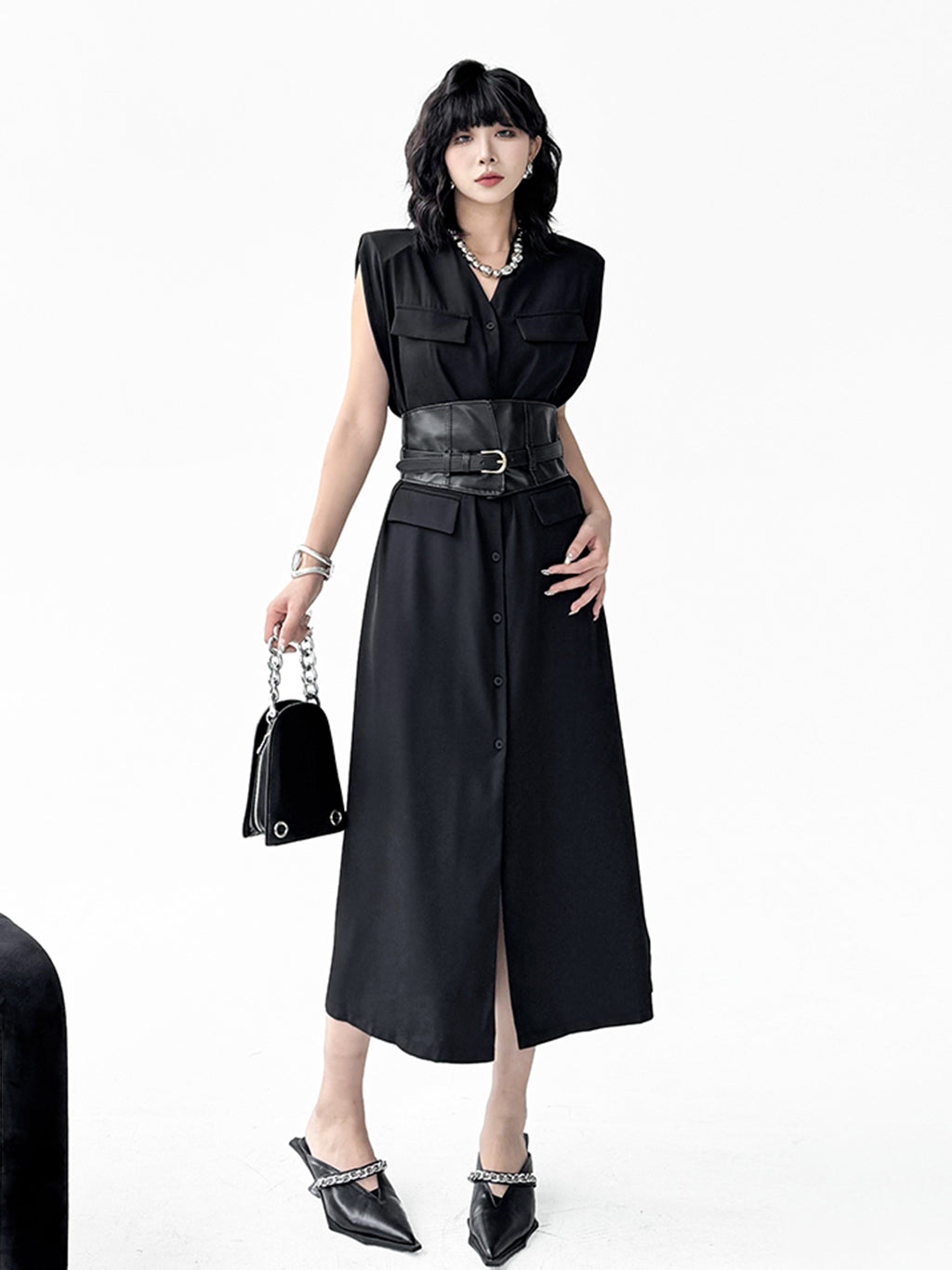 フロントに施された4つのフラップポケットが特徴的なロングジレドレス。肩に沿ってストンと落ちる直線的なシルエットは、体のラインを拾わず、エレガントな雰囲気を演出する。フロントボタンはトップから裾まで配され、さりげない縦のラインを強調。やや光沢感のある軽やかな生地が、モードな印象を引き立てる。