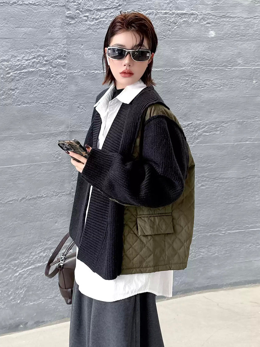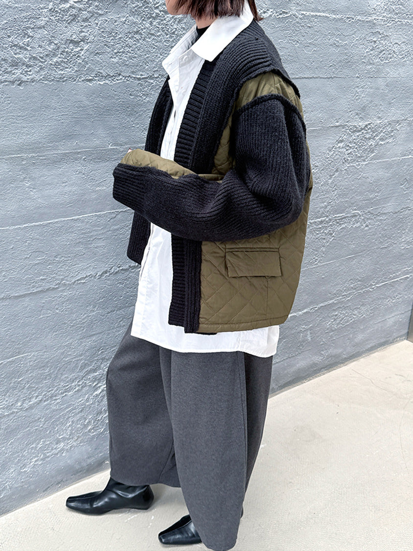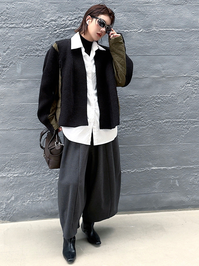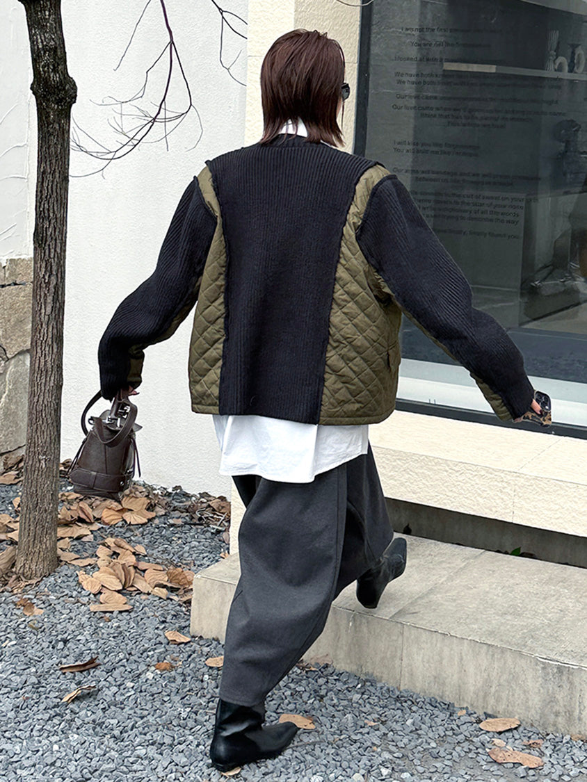 キルト生地とリブニットを切り替えた構成が特徴のジャケット。軽い膨らみを持つキルト面が輪郭に柔らかな陰影を与え、リブの縦方向ラインが全体のバランスを引き締める印象をつくる。肩から袖にかけてのゆるい落ち感が抜けを生み、インナーとの重なりで奥行きのあるスタイリングが組み上がる。バック面も切り替えが連続し、後ろ姿までニュアンスを保つ構成にまとまる。