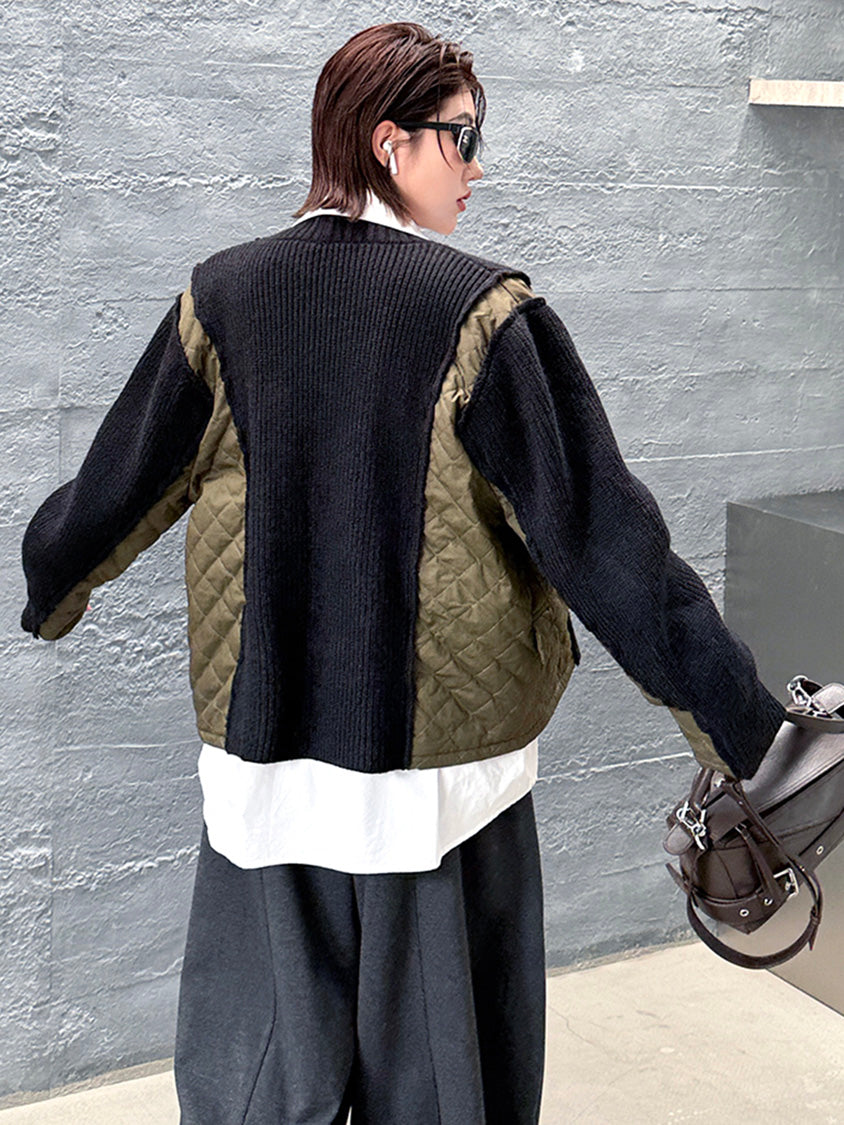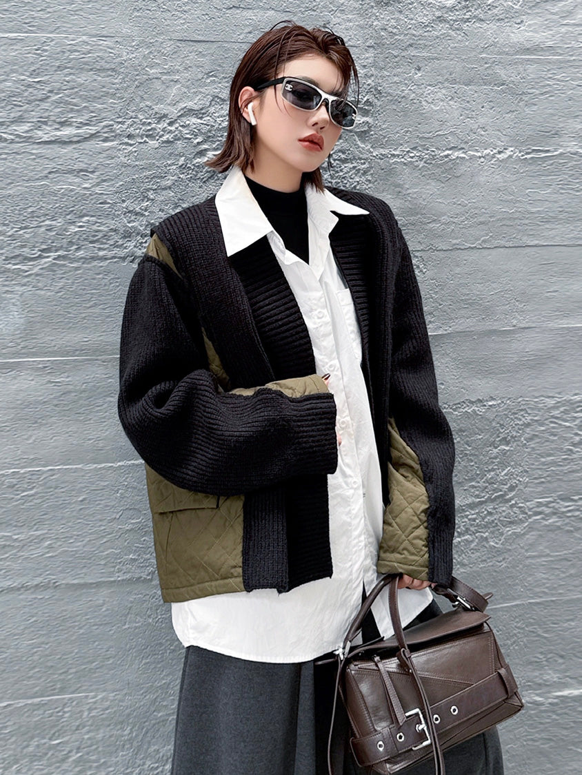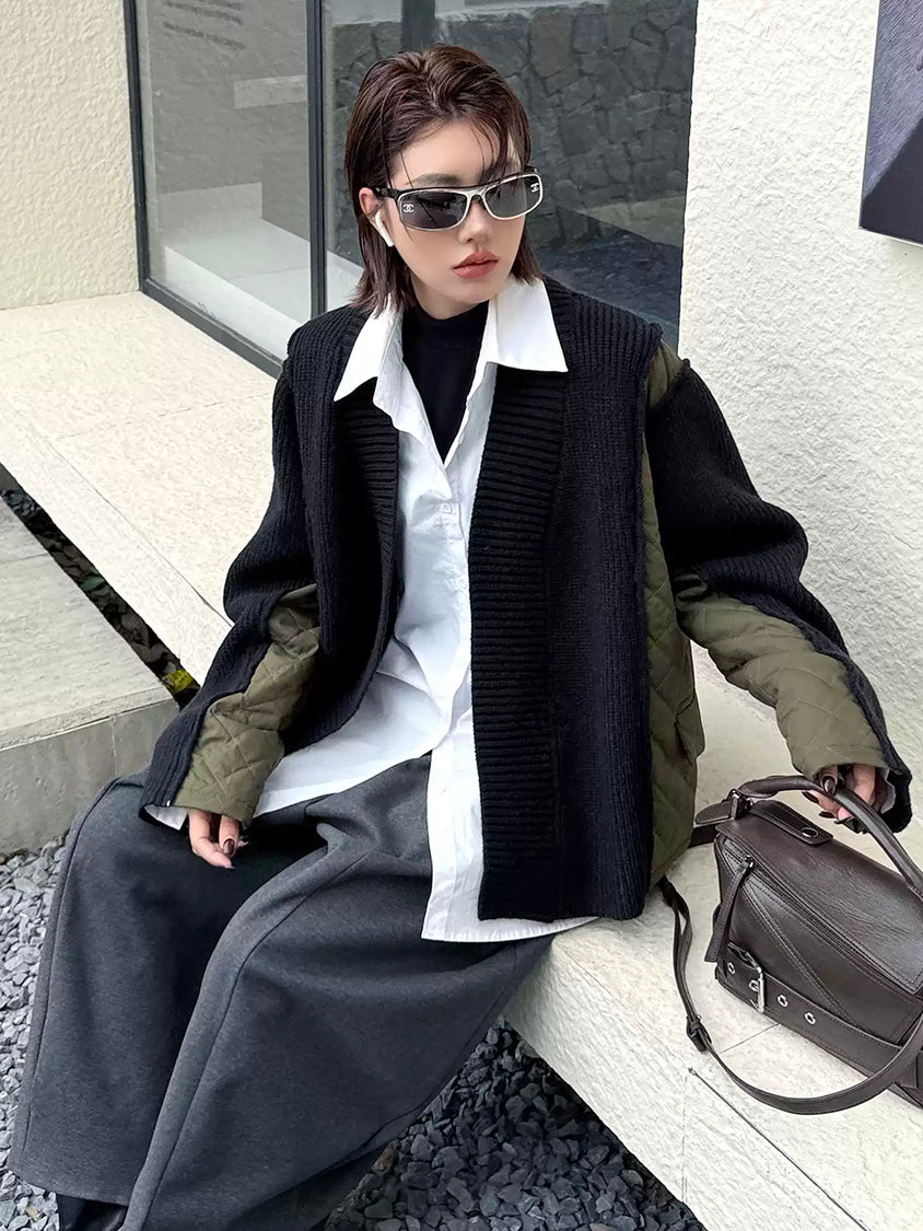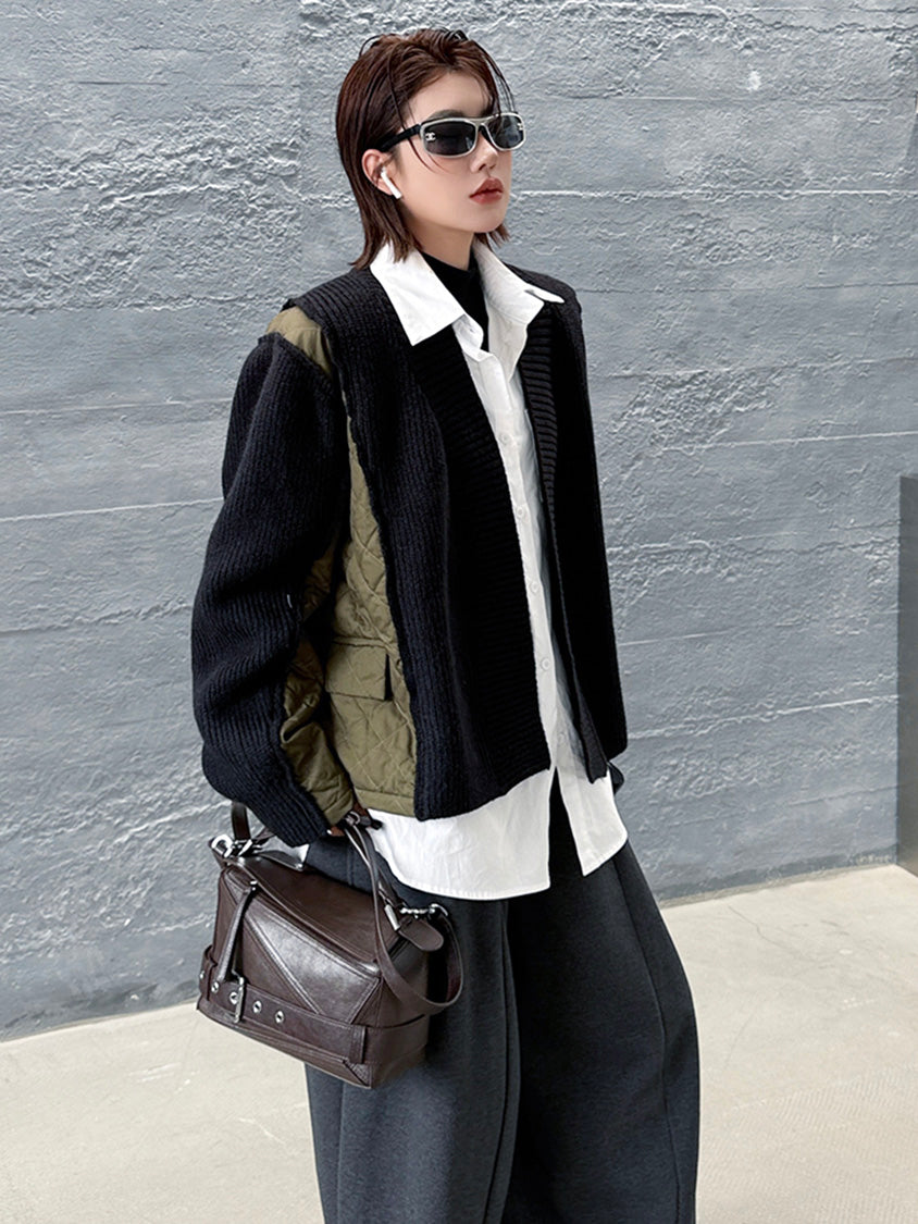 キルト生地とリブニットを切り替えた構成が特徴のジャケット。軽い膨らみを持つキルト面が輪郭に柔らかな陰影を与え、リブの縦方向ラインが全体のバランスを引き締める印象をつくる。肩から袖にかけてのゆるい落ち感が抜けを生み、インナーとの重なりで奥行きのあるスタイリングが組み上がる。バック面も切り替えが連続し、後ろ姿までニュアンスを保つ構成にまとまる。