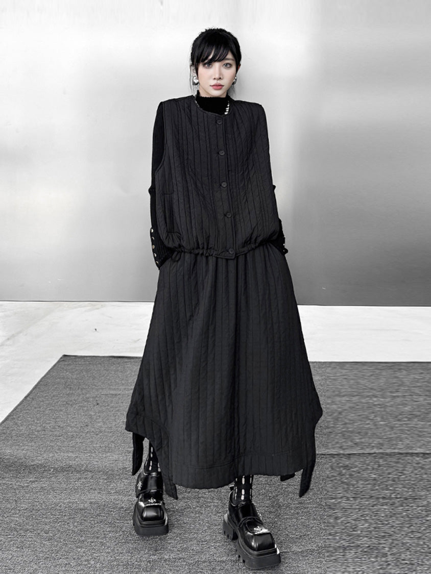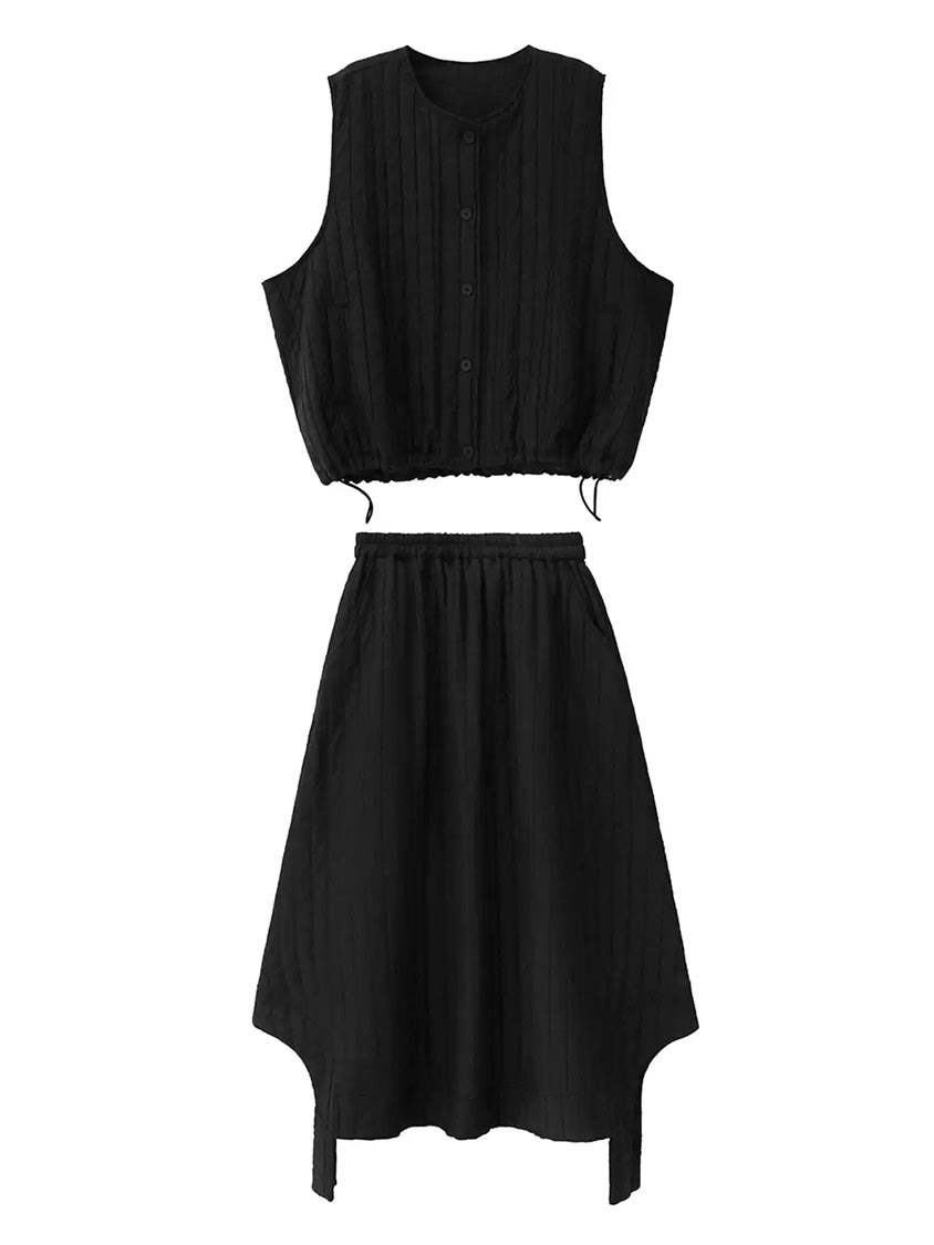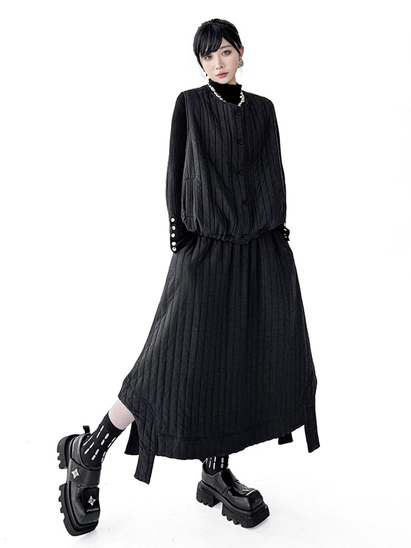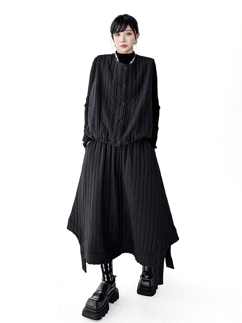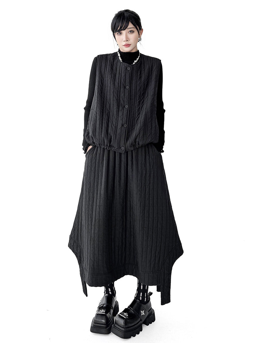 繊細なキルティングステッチが縦に走るベストとスカートのシリーズ。トップは程よいボリュームをもたせたショート丈で、裾のドローストリングによりシルエットを調整可能。スカートは流れるようなAラインに仕立てられ、裾の段差カットが動きに表情を与える。セットでの着用はもちろん、単品でもスタイリングに奥行きを生む。軽さと構築性を兼ね備えたデザイン。