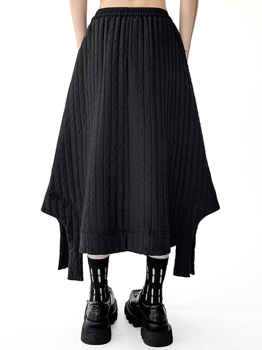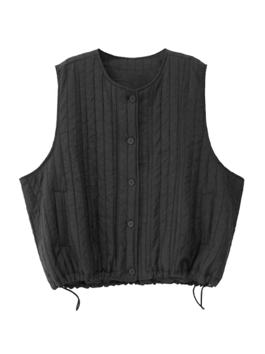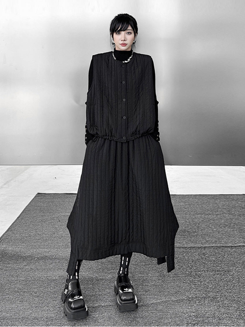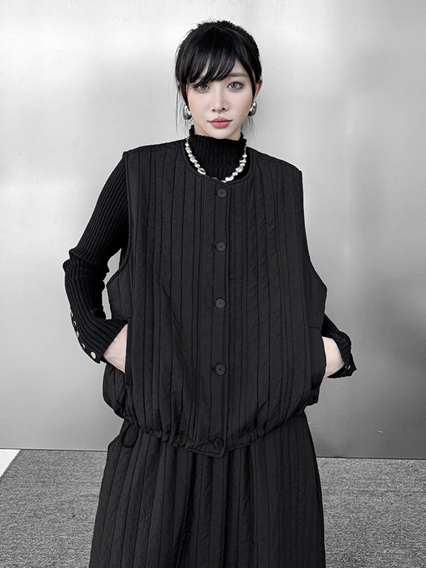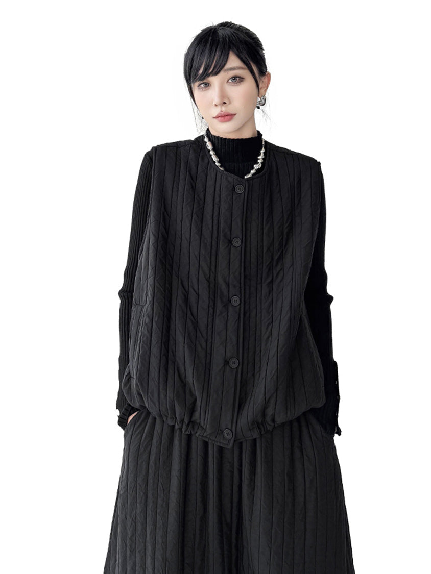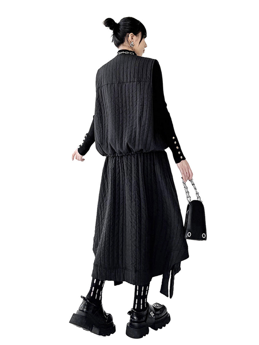 繊細なキルティングステッチが縦に走るベストとスカートのシリーズ。トップは程よいボリュームをもたせたショート丈で、裾のドローストリングによりシルエットを調整可能。スカートは流れるようなAラインに仕立てられ、裾の段差カットが動きに表情を与える。セットでの着用はもちろん、単品でもスタイリングに奥行きを生む。軽さと構築性を兼ね備えたデザイン。