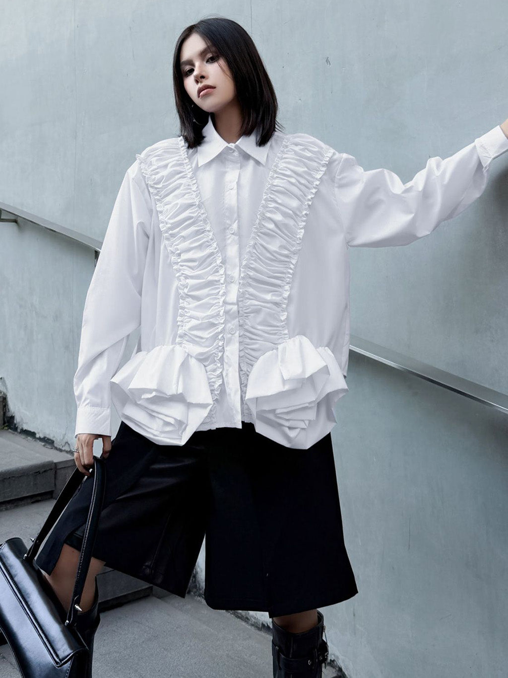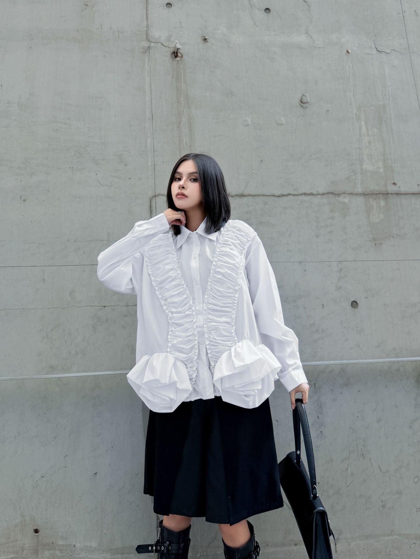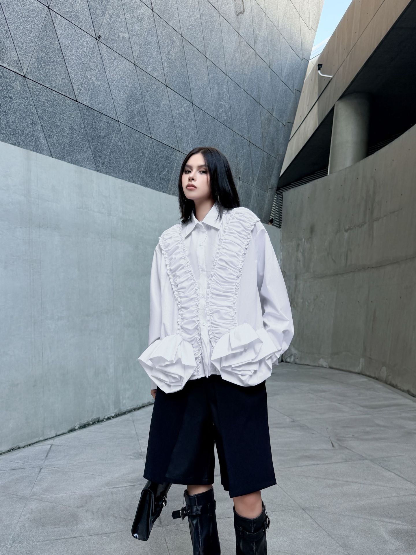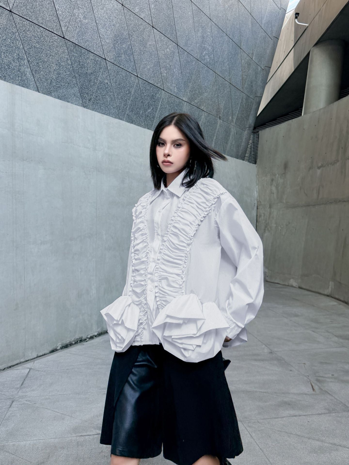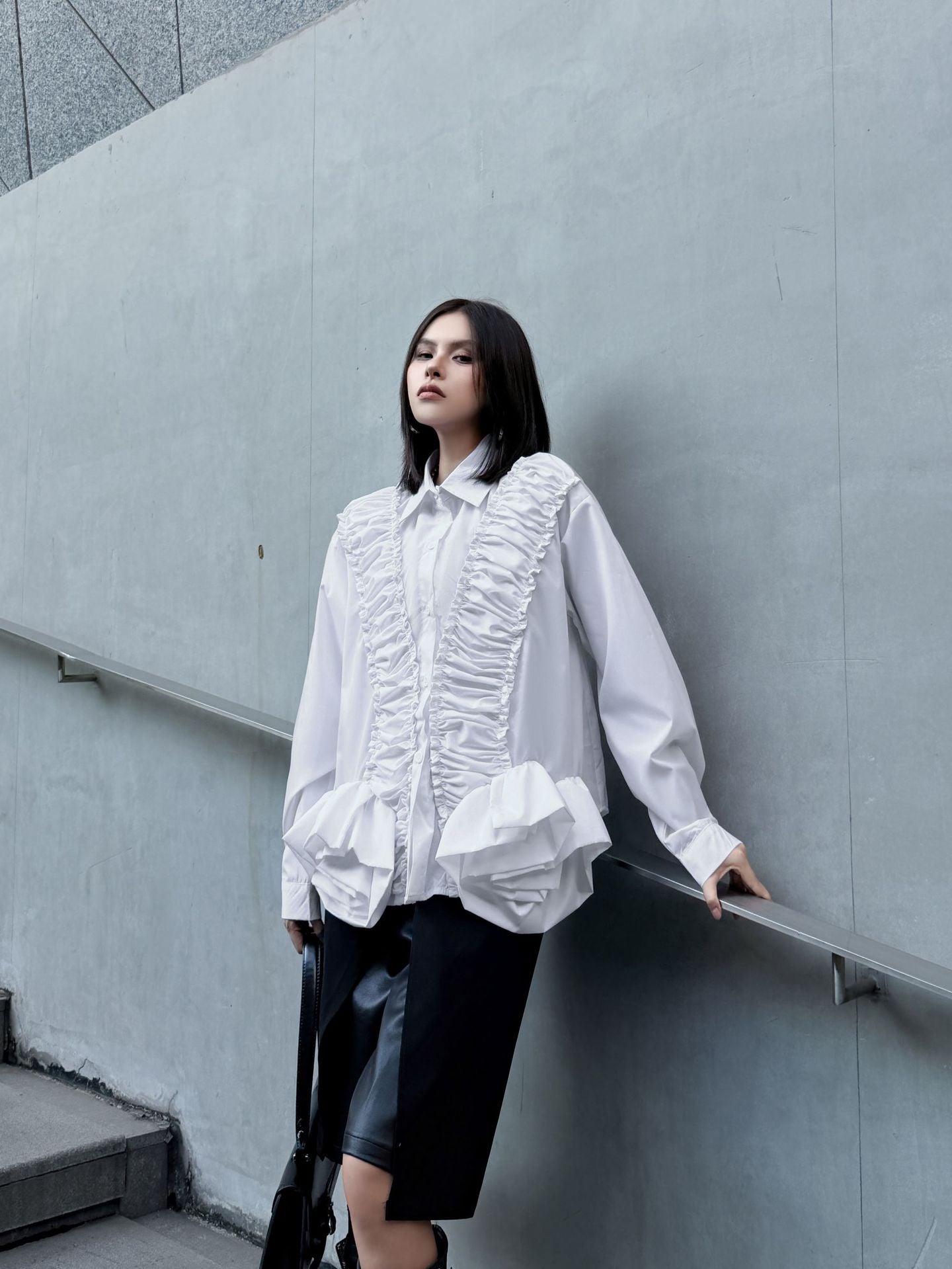 フロント全体にギャザーを寄せたラッフルを大胆に配置したブラウス。ウエストラインにはボリュームのあるペプラムを重ね、構築的なシルエットを形成。軽やかなシャツコットン素材がふんわりとした膨らみを生み、動きに合わせて立体的な陰影を描く。クラシックなシャツカラーとボタンフロントのバランスが、フェミニンとモードを融合させた印象を与える。