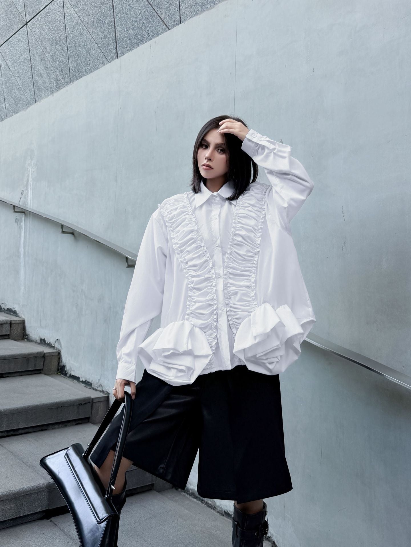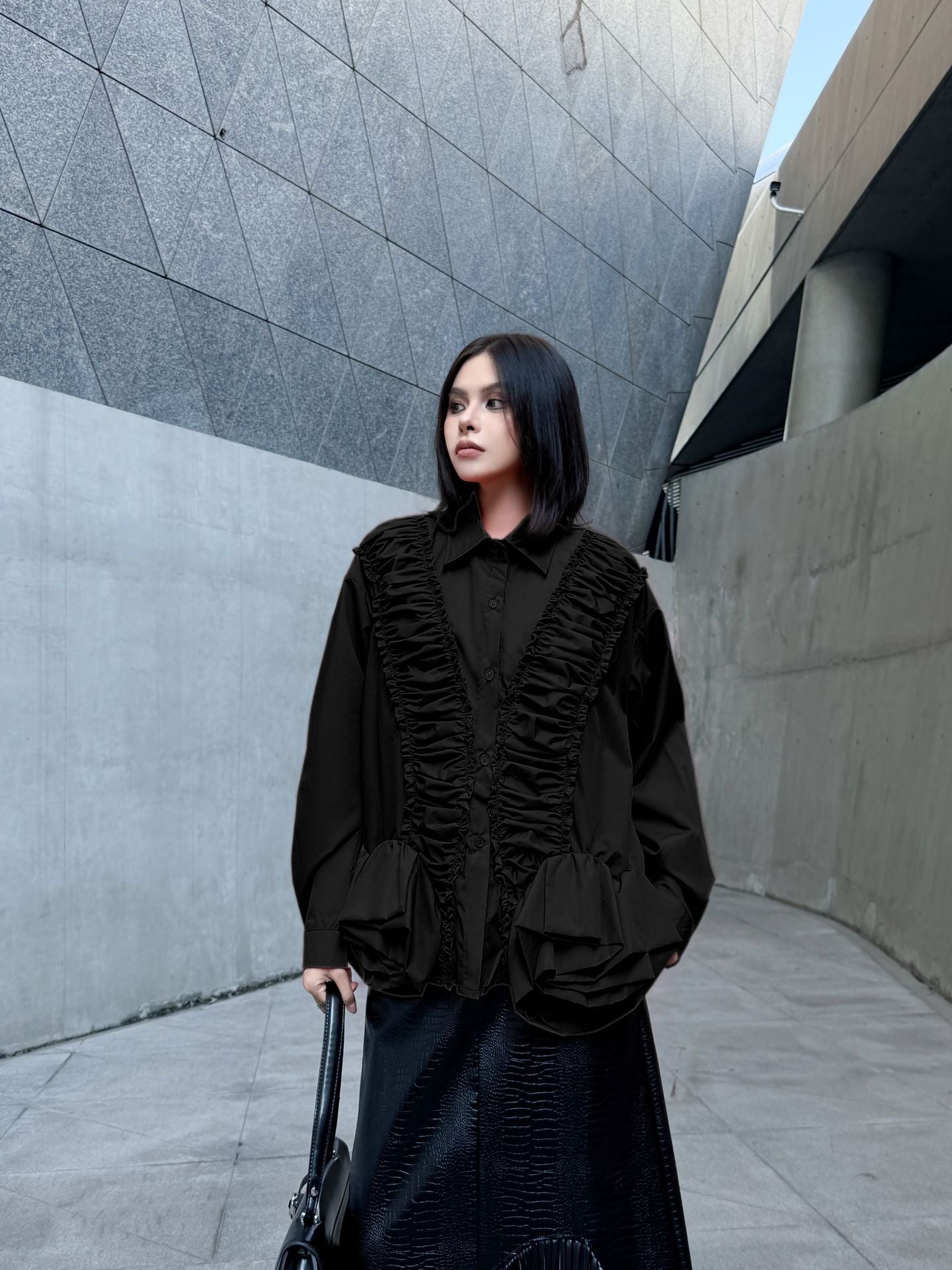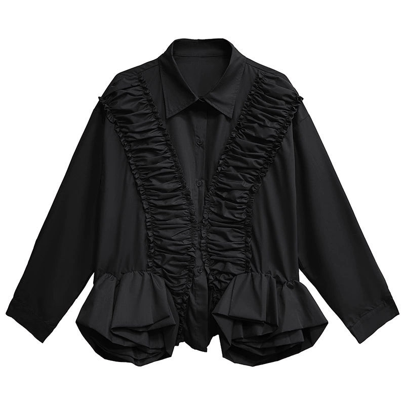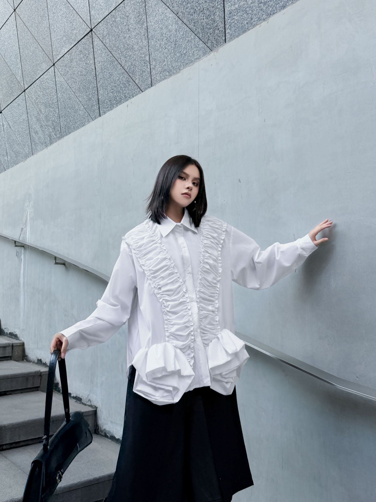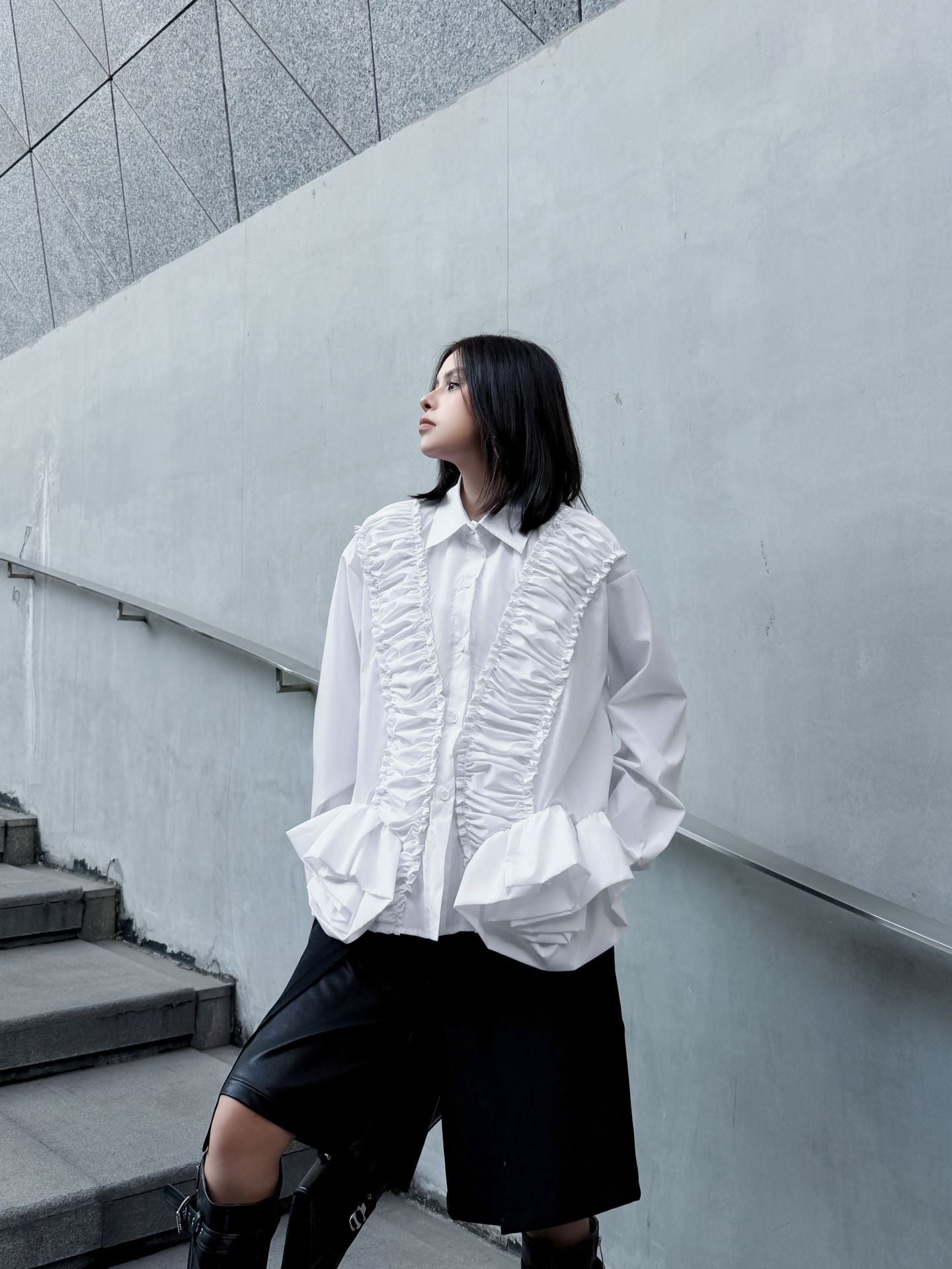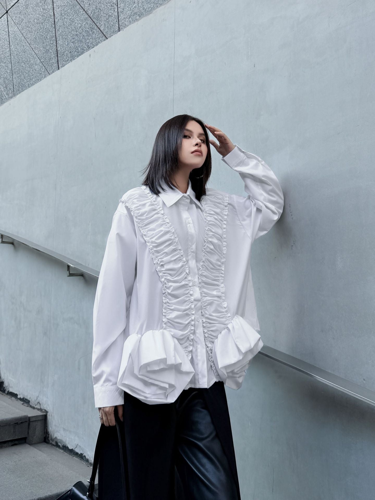 フロント全体にギャザーを寄せたラッフルを大胆に配置したブラウス。ウエストラインにはボリュームのあるペプラムを重ね、構築的なシルエットを形成。軽やかなシャツコットン素材がふんわりとした膨らみを生み、動きに合わせて立体的な陰影を描く。クラシックなシャツカラーとボタンフロントのバランスが、フェミニンとモードを融合させた印象を与える。