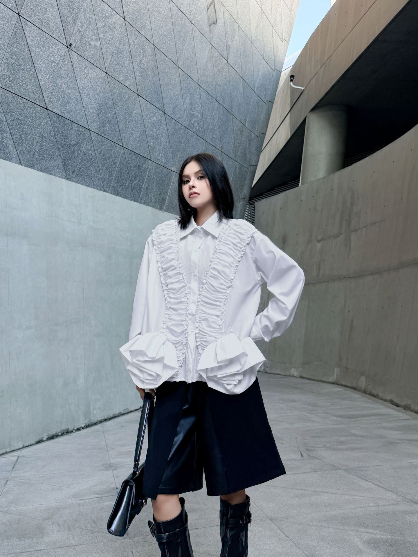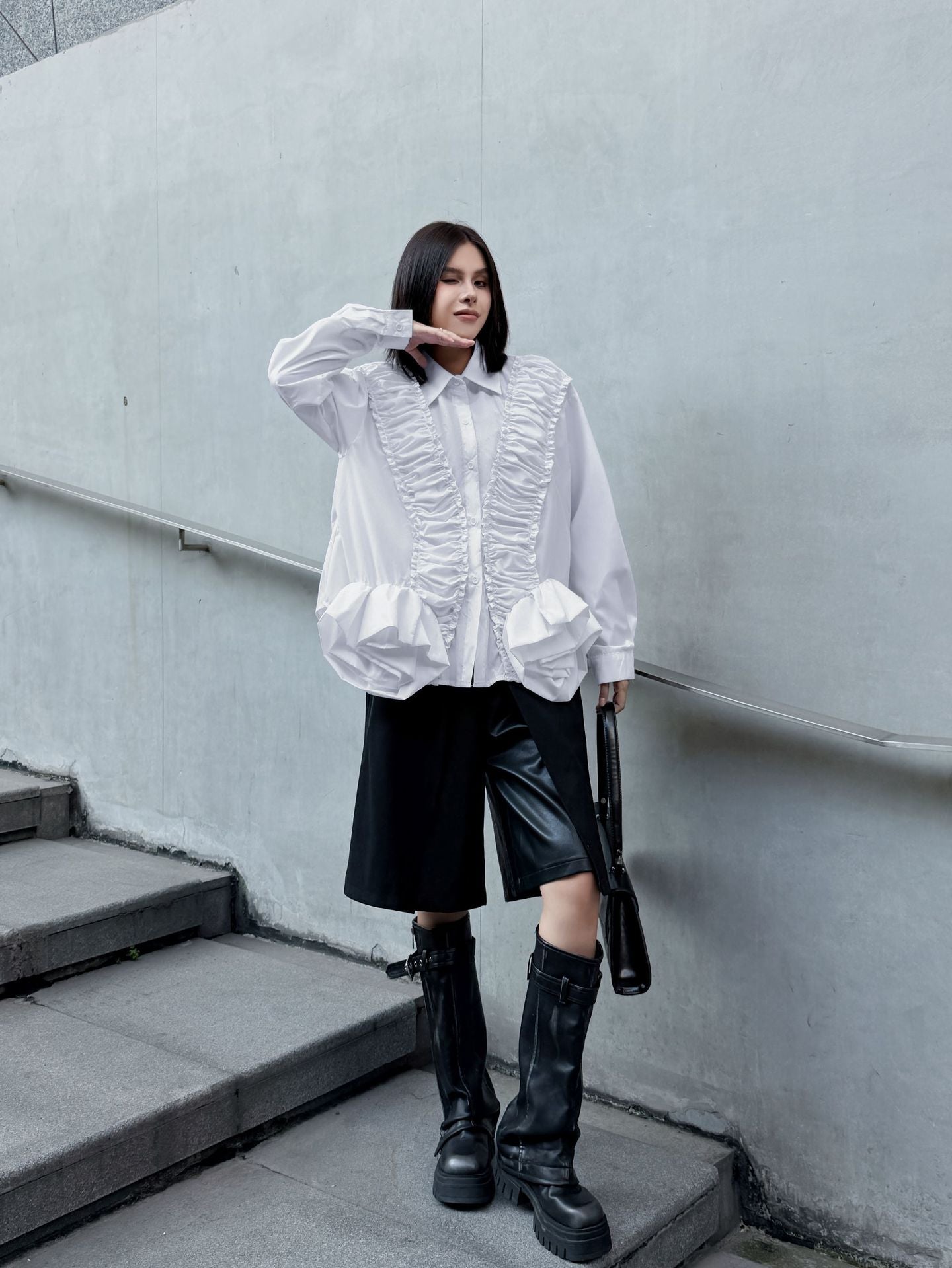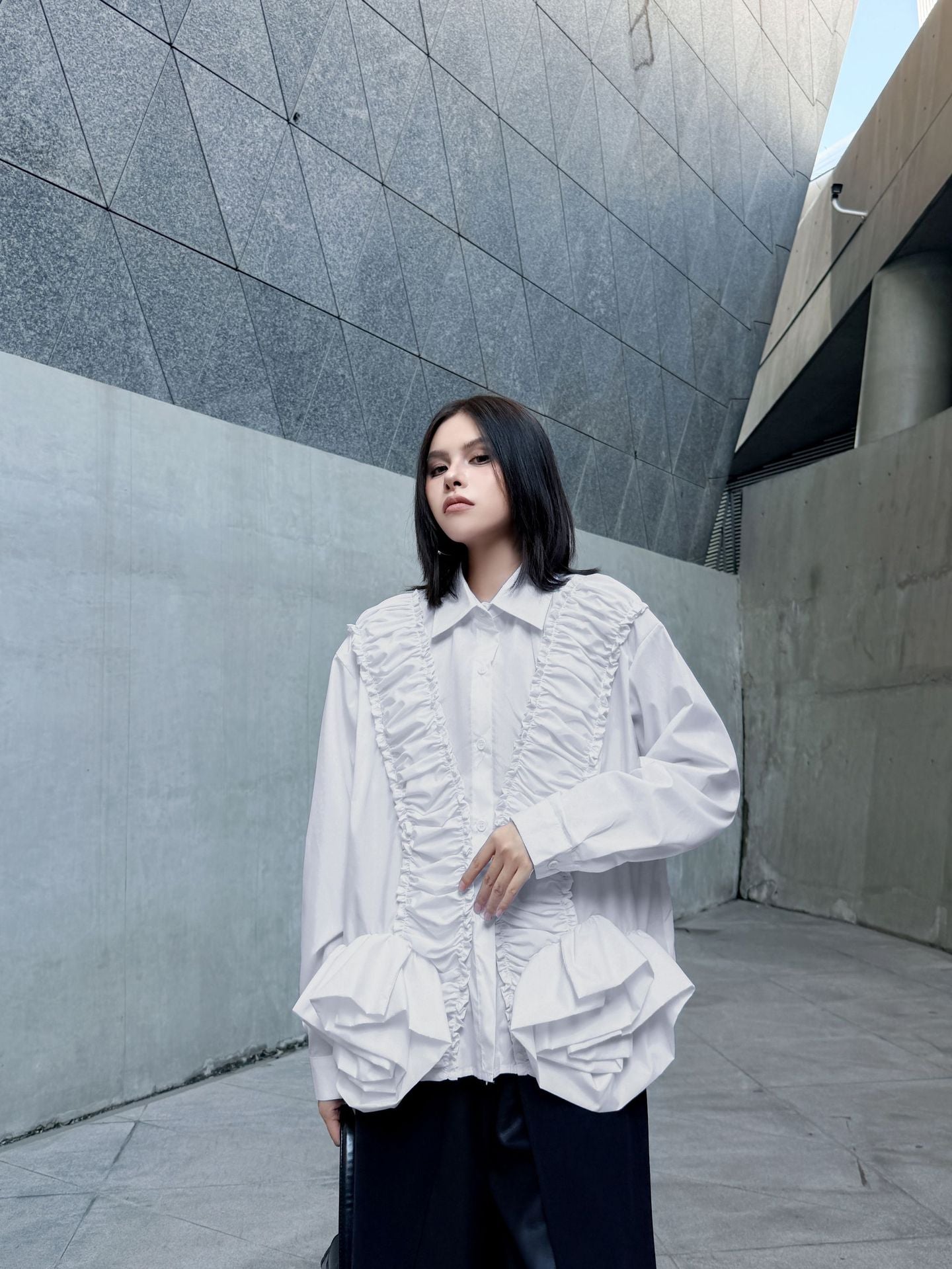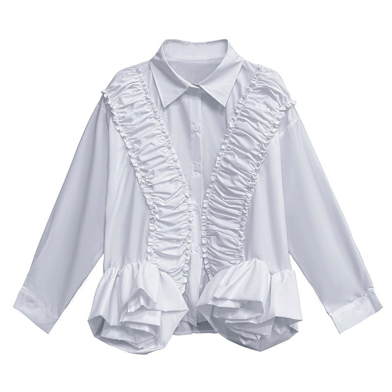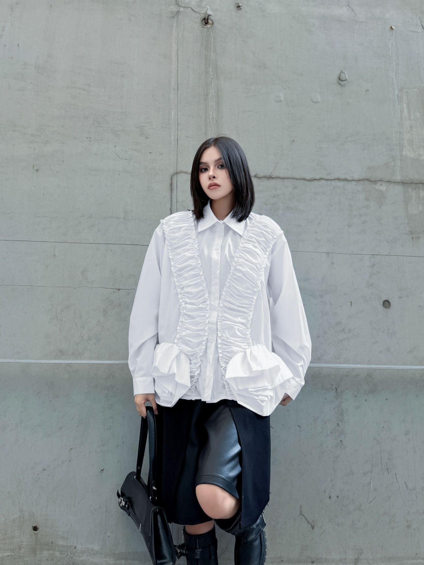フロント全体にギャザーを寄せたラッフルを大胆に配置したブラウス。ウエストラインにはボリュームのあるペプラムを重ね、構築的なシルエットを形成。軽やかなシャツコットン素材がふんわりとした膨らみを生み、動きに合わせて立体的な陰影を描く。クラシックなシャツカラーとボタンフロントのバランスが、フェミニンとモードを融合させた印象を与える。
