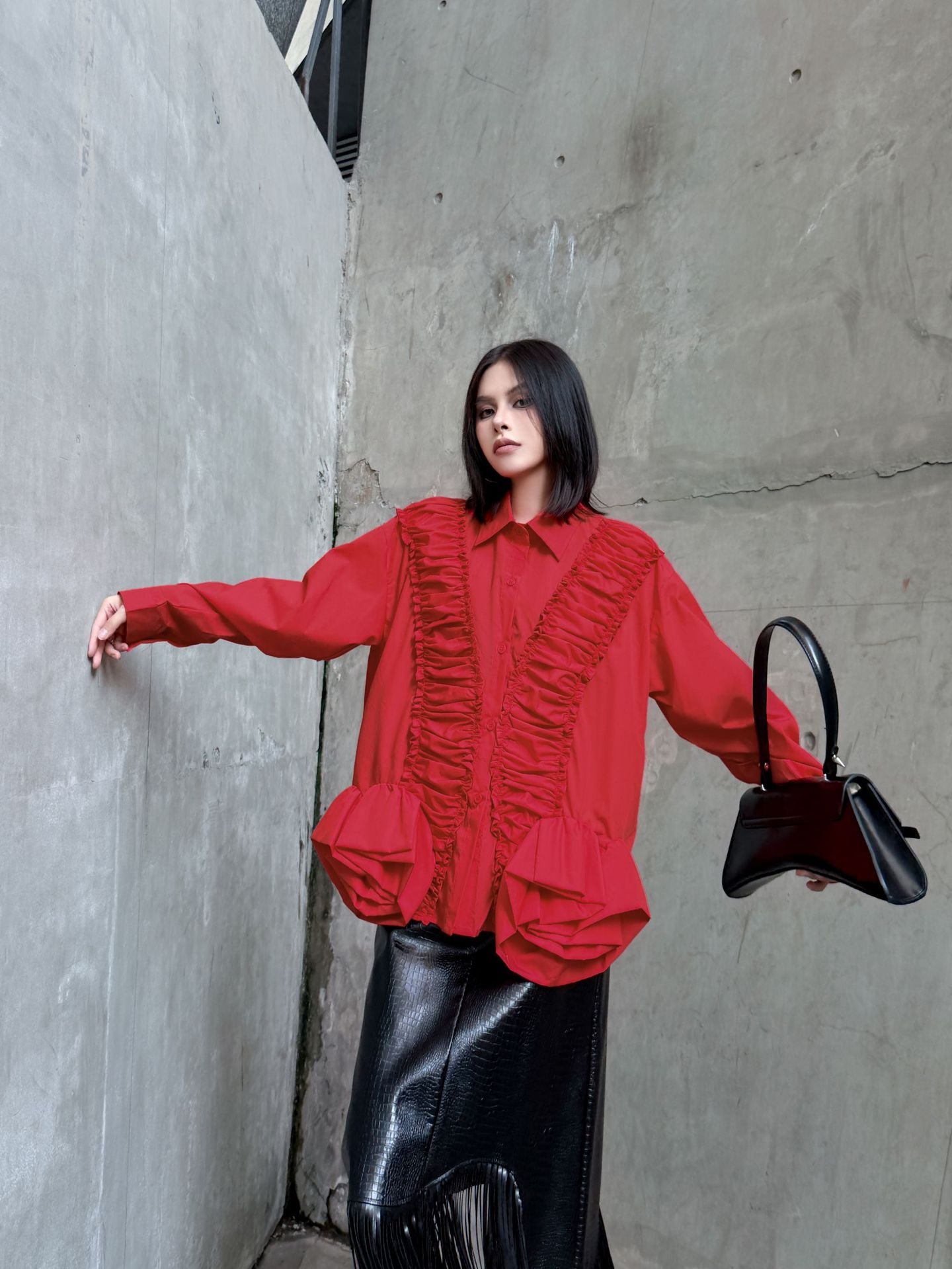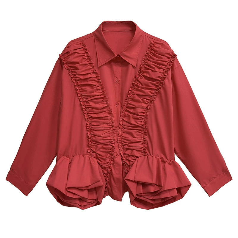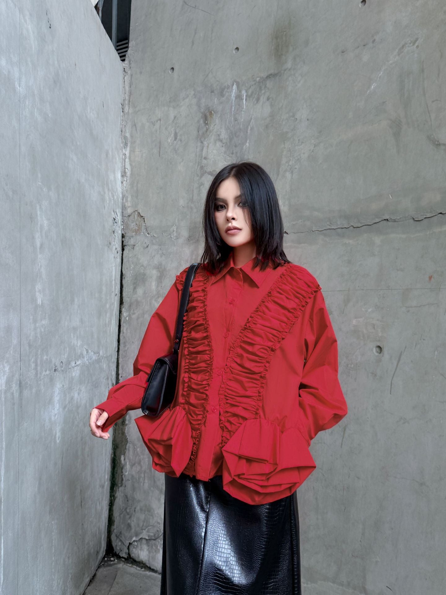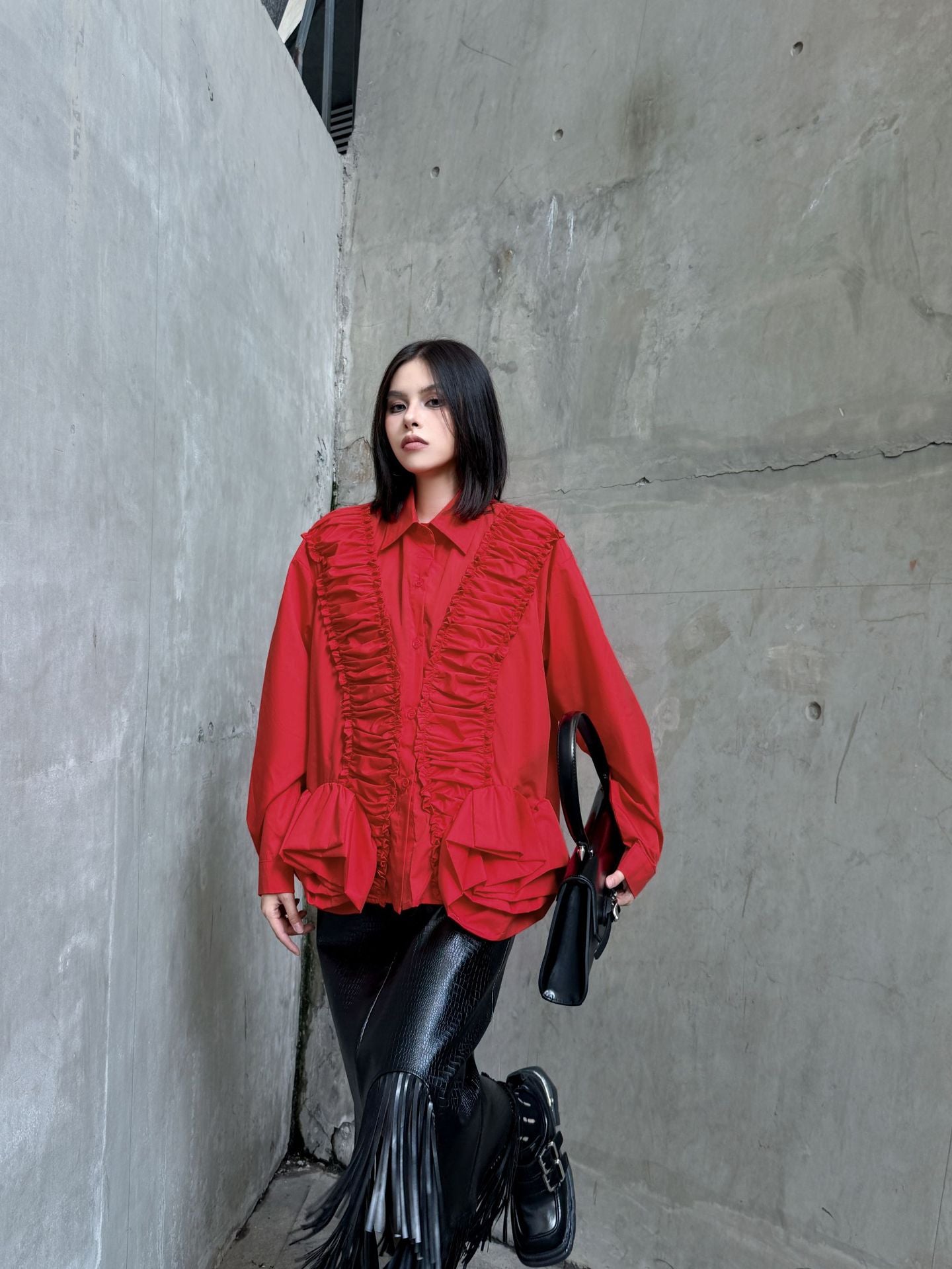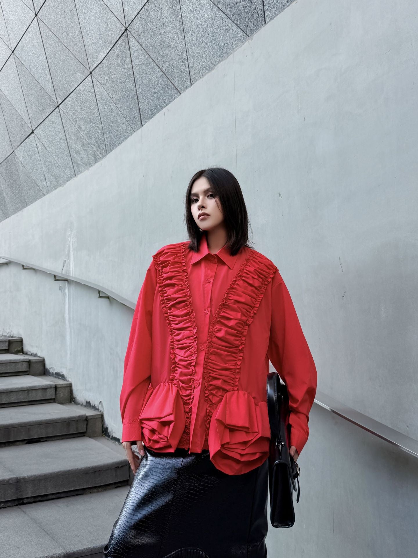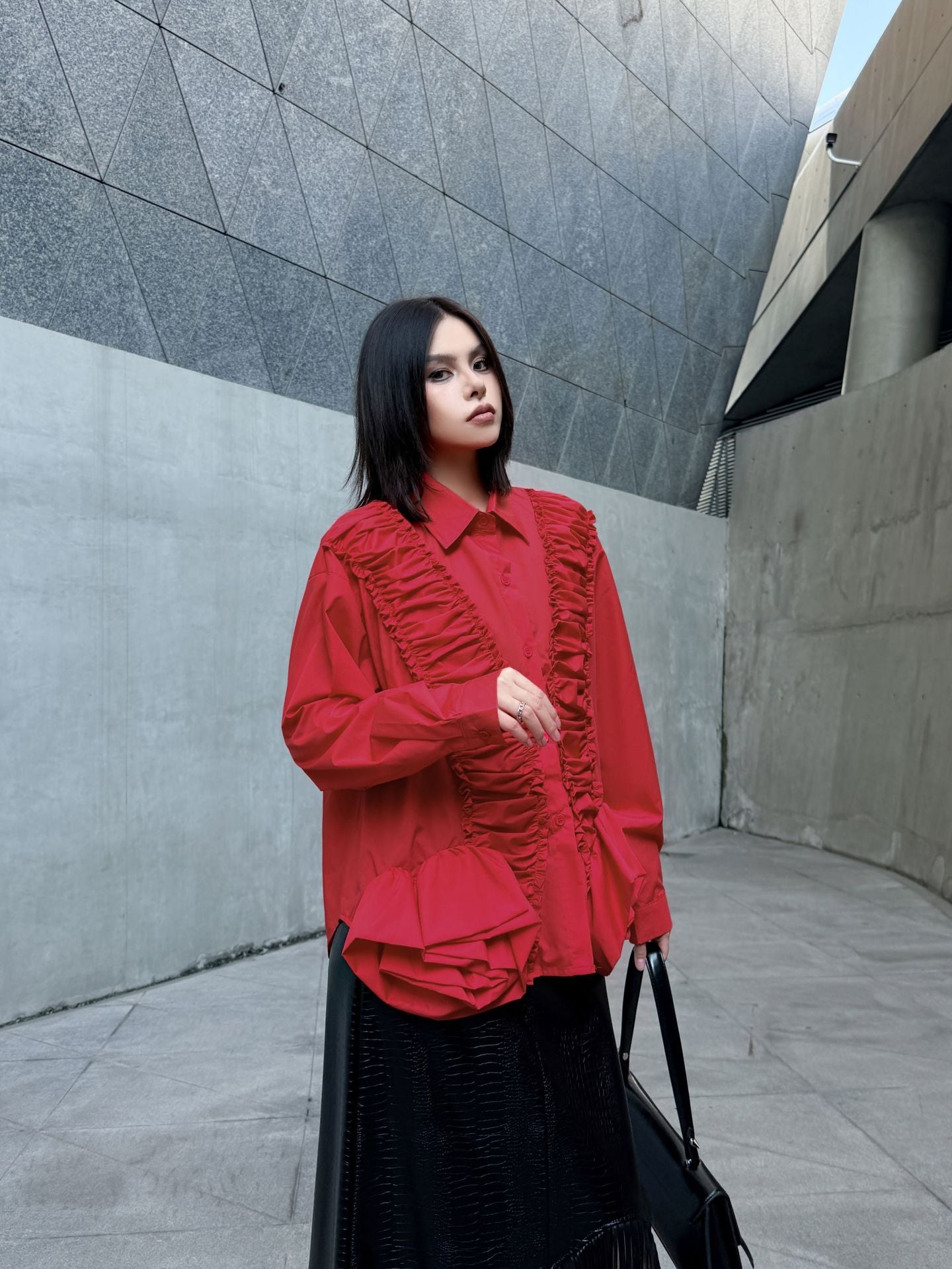 フロント全体にギャザーを寄せたラッフルを大胆に配置したブラウス。ウエストラインにはボリュームのあるペプラムを重ね、構築的なシルエットを形成。軽やかなシャツコットン素材がふんわりとした膨らみを生み、動きに合わせて立体的な陰影を描く。クラシックなシャツカラーとボタンフロントのバランスが、フェミニンとモードを融合させた印象を与える。