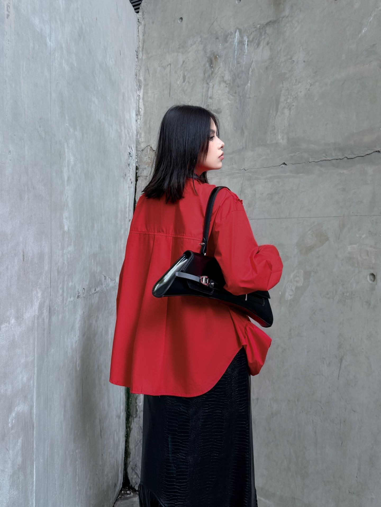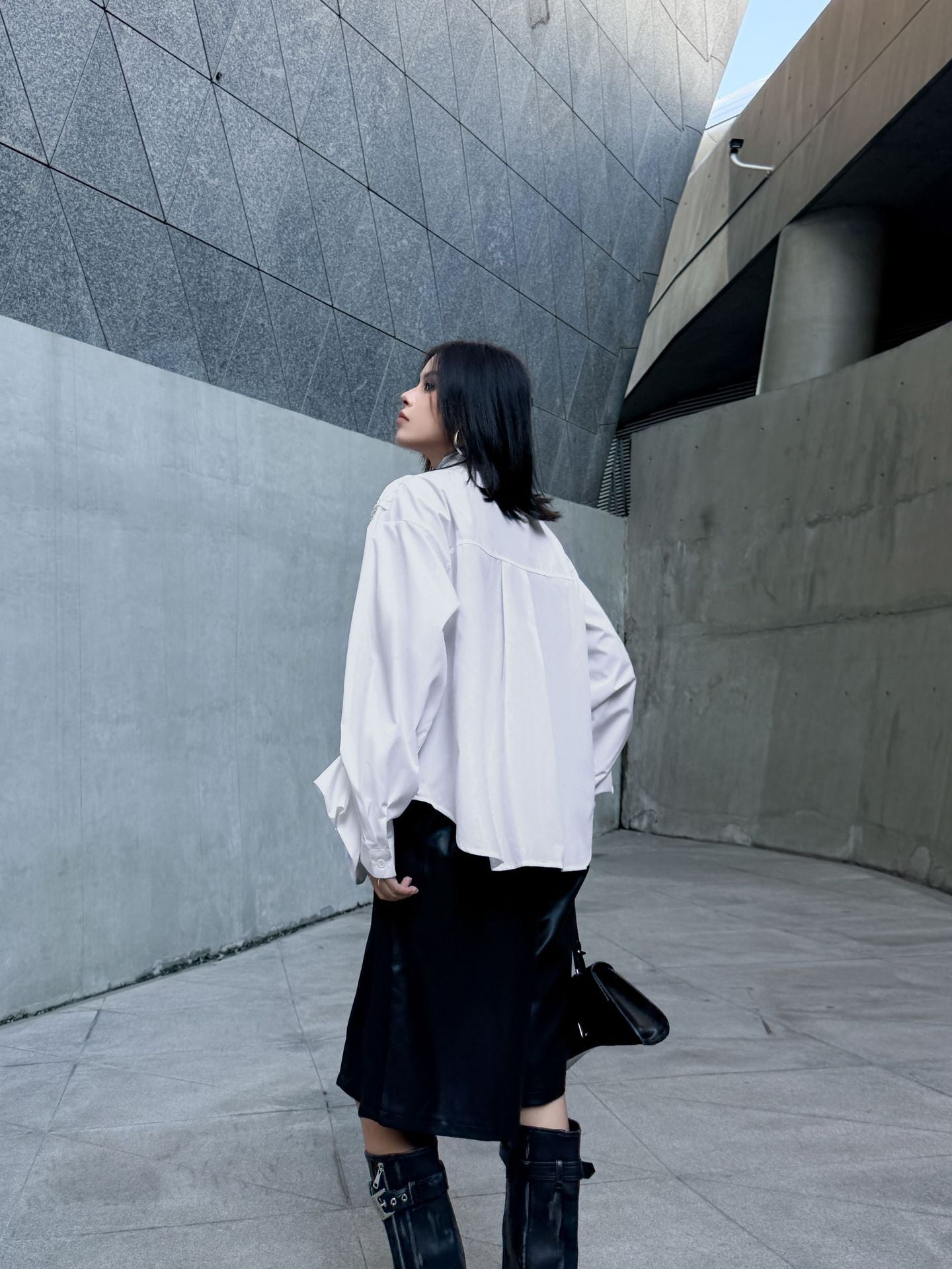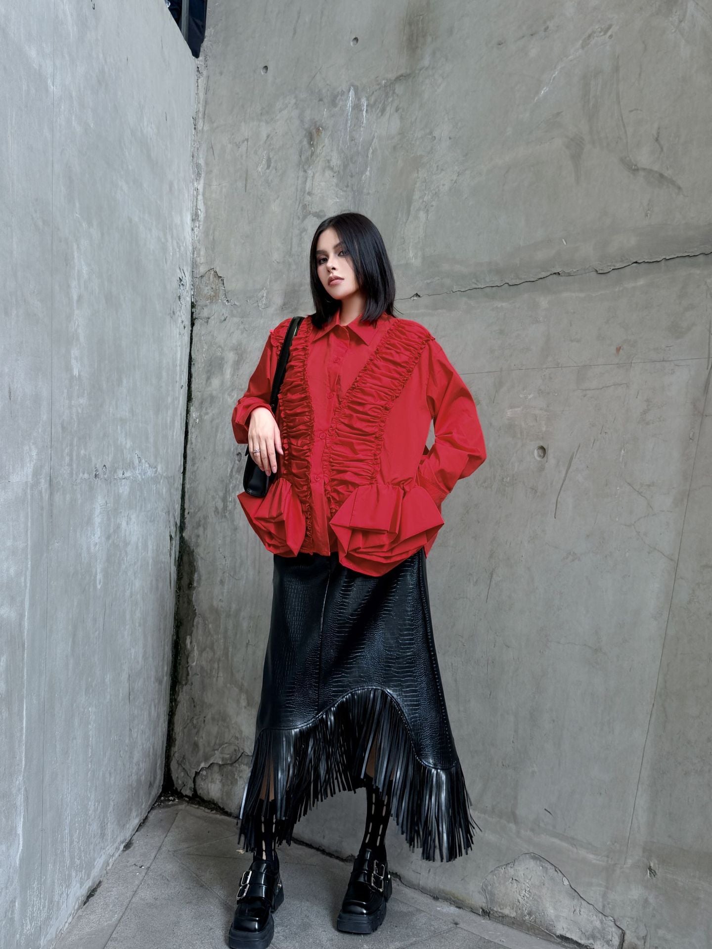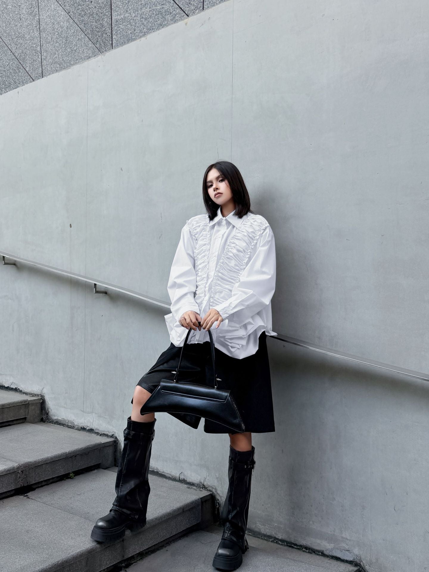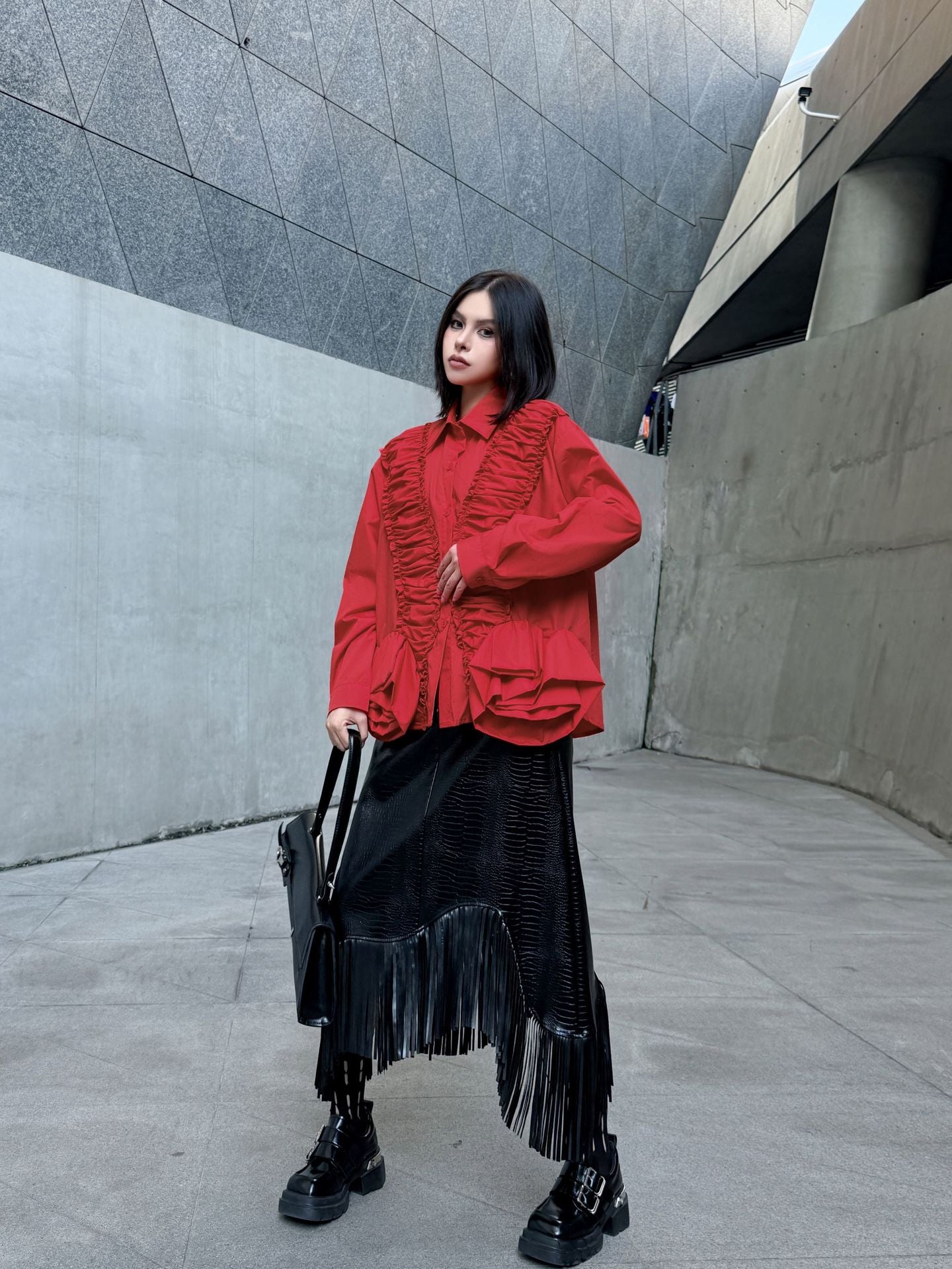 フロント全体にギャザーを寄せたラッフルを大胆に配置したブラウス。ウエストラインにはボリュームのあるペプラムを重ね、構築的なシルエットを形成。軽やかなシャツコットン素材がふんわりとした膨らみを生み、動きに合わせて立体的な陰影を描く。クラシックなシャツカラーとボタンフロントのバランスが、フェミニンとモードを融合させた印象を与える。