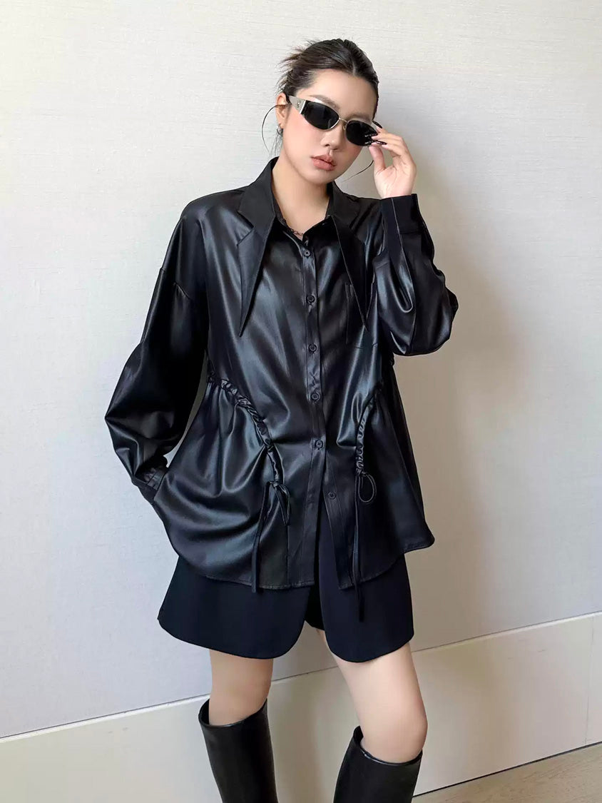 なめらかな表面感をもつサテンライク素材をベースに、フロントボタン仕様とワイドカラーを組み合わせた構成。ウエスト位置にはドローコードを内蔵し、自然なギャザーラインと奥行きのあるフォルムを形成する設計。ドロップショルダーとゆとりのある身幅により、抜け感とシャープさを併せ持つシルエットが完成する。ロングカフスとストレートヘムが縦のラインを強調し、モードな空気を引き立てる構成。