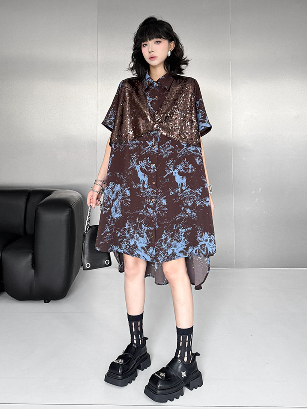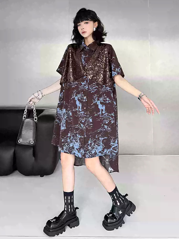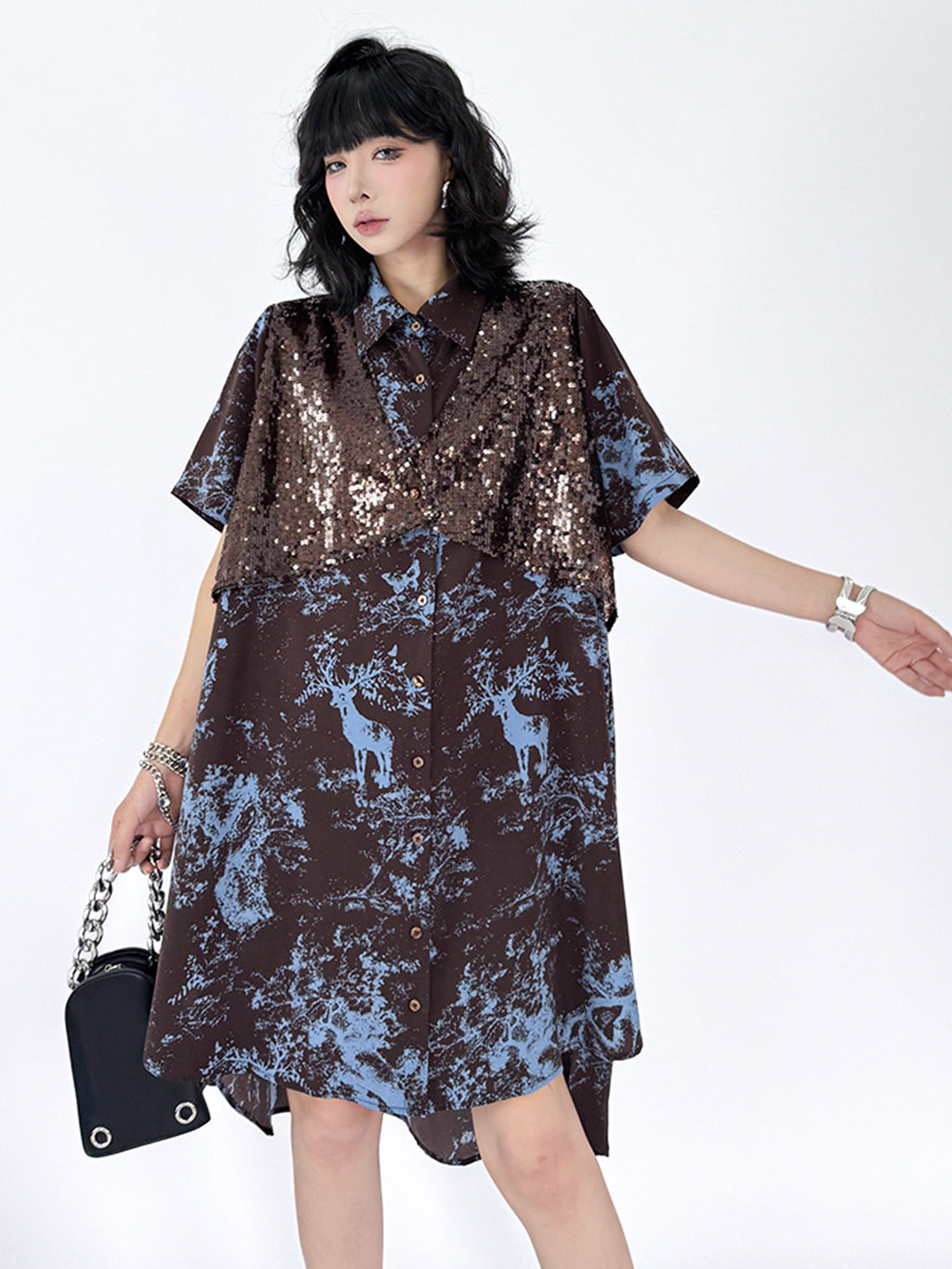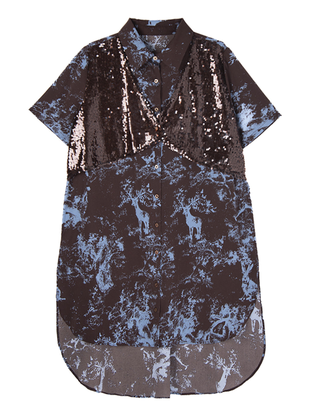 フロント上部にびっしりと敷き詰めたスパンコールが目を引く、シャツ仕立ての個性派ドレス。ブラウン地にブルーの鹿モチーフを散りばめたプリントが幻想的で、視覚的なインパクトを放つ。着丈に前後差をつけたシルエットが動きに立体感を与え、ボタン開閉のディテールとレイヤード風デザインがモードと抜け感のバランスを演出する。