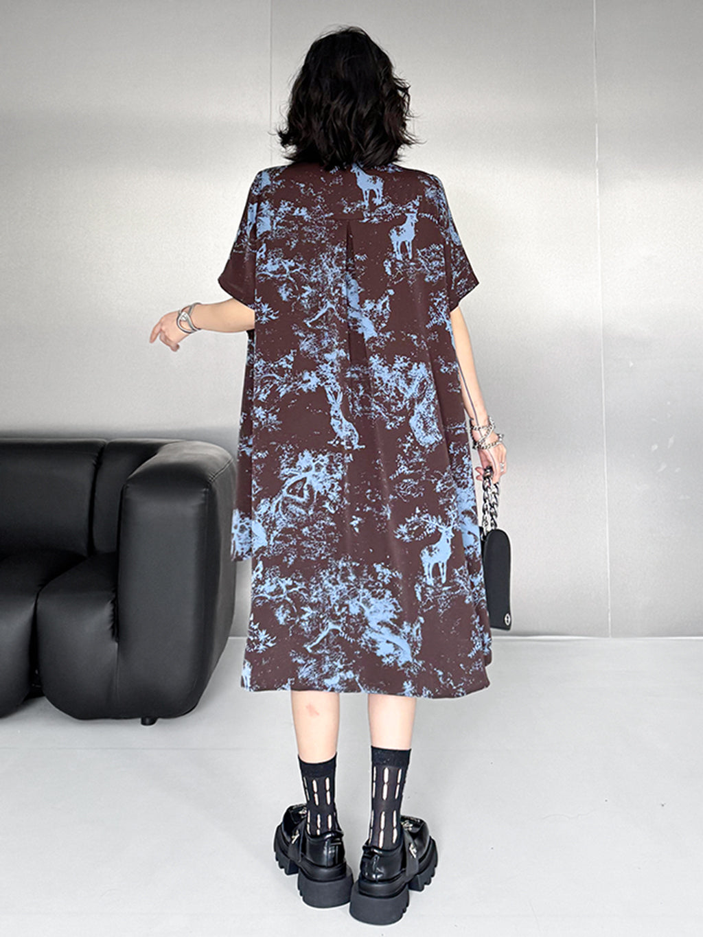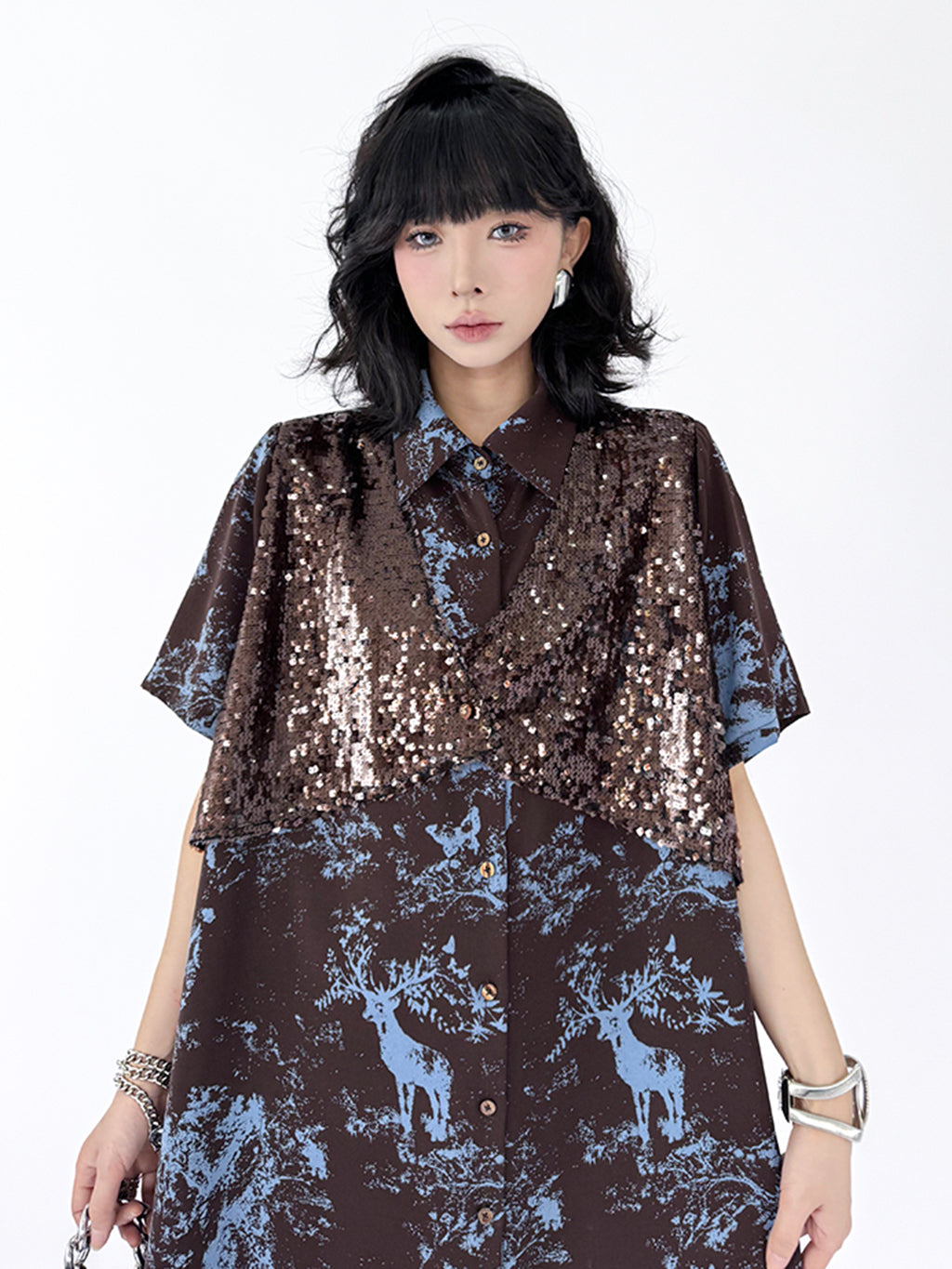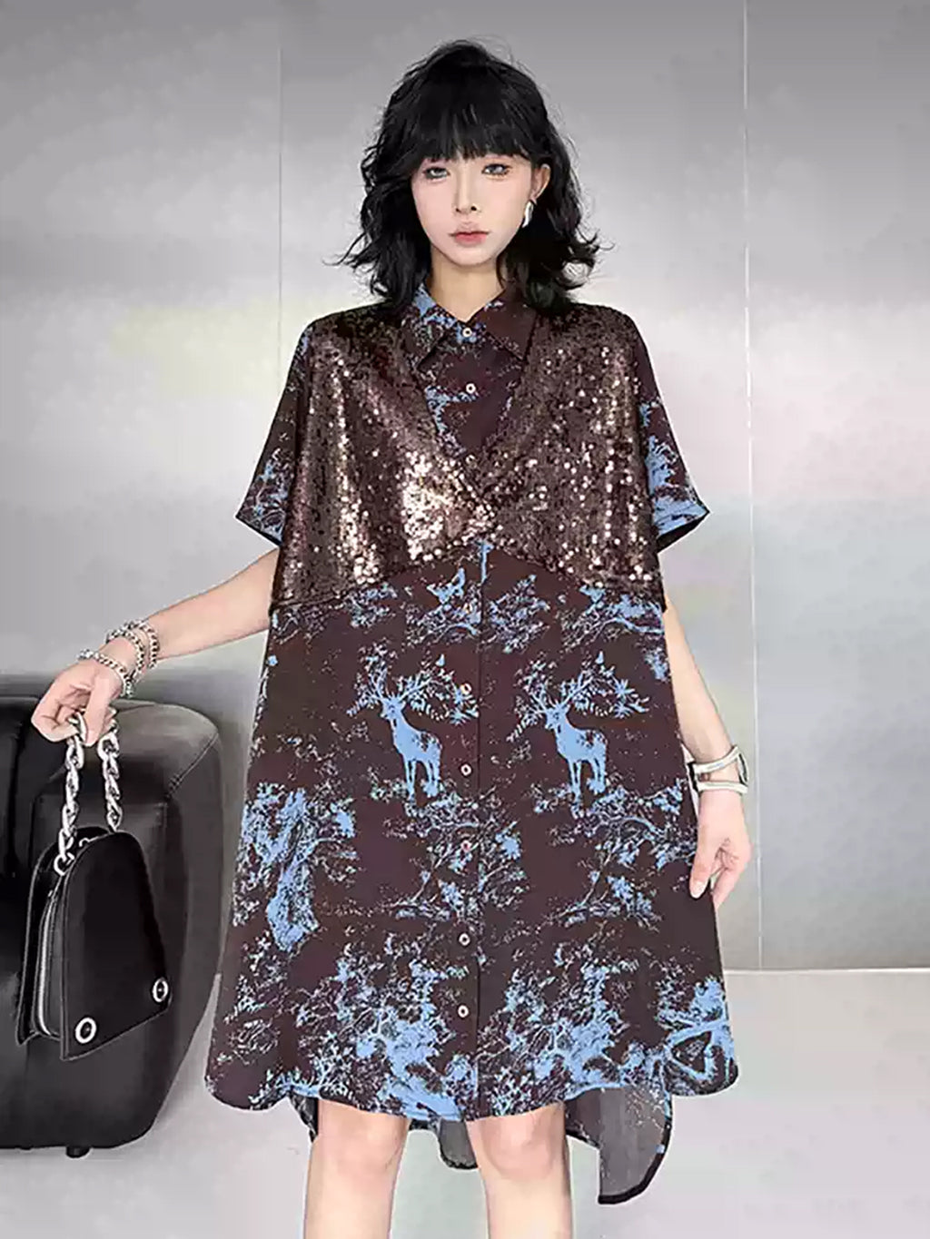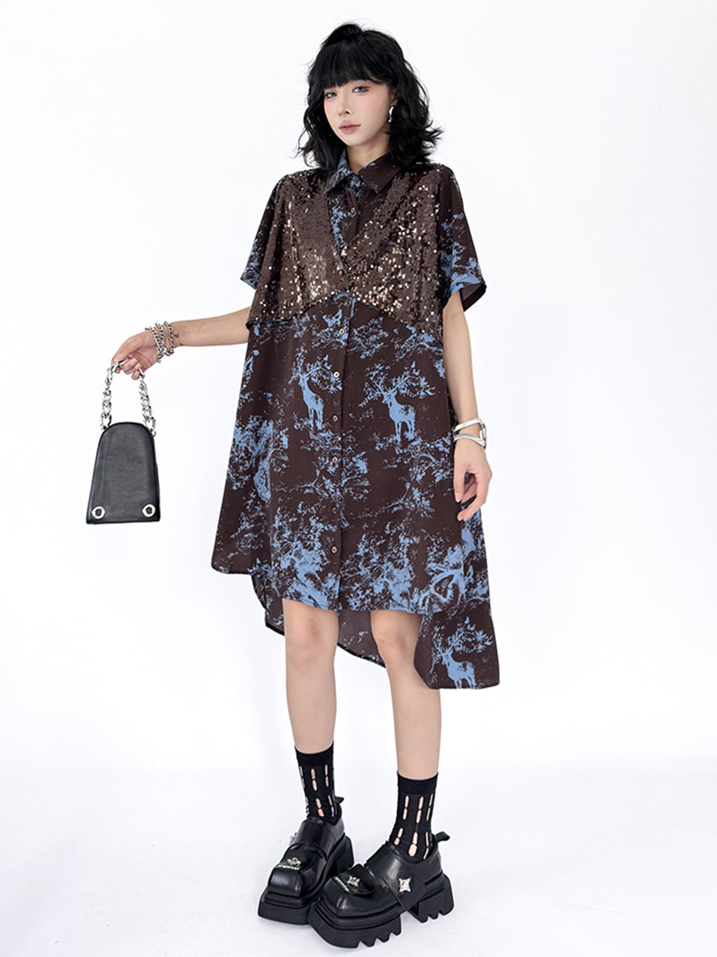 フロント上部にびっしりと敷き詰めたスパンコールが目を引く、シャツ仕立ての個性派ドレス。ブラウン地にブルーの鹿モチーフを散りばめたプリントが幻想的で、視覚的なインパクトを放つ。着丈に前後差をつけたシルエットが動きに立体感を与え、ボタン開閉のディテールとレイヤード風デザインがモードと抜け感のバランスを演出する。