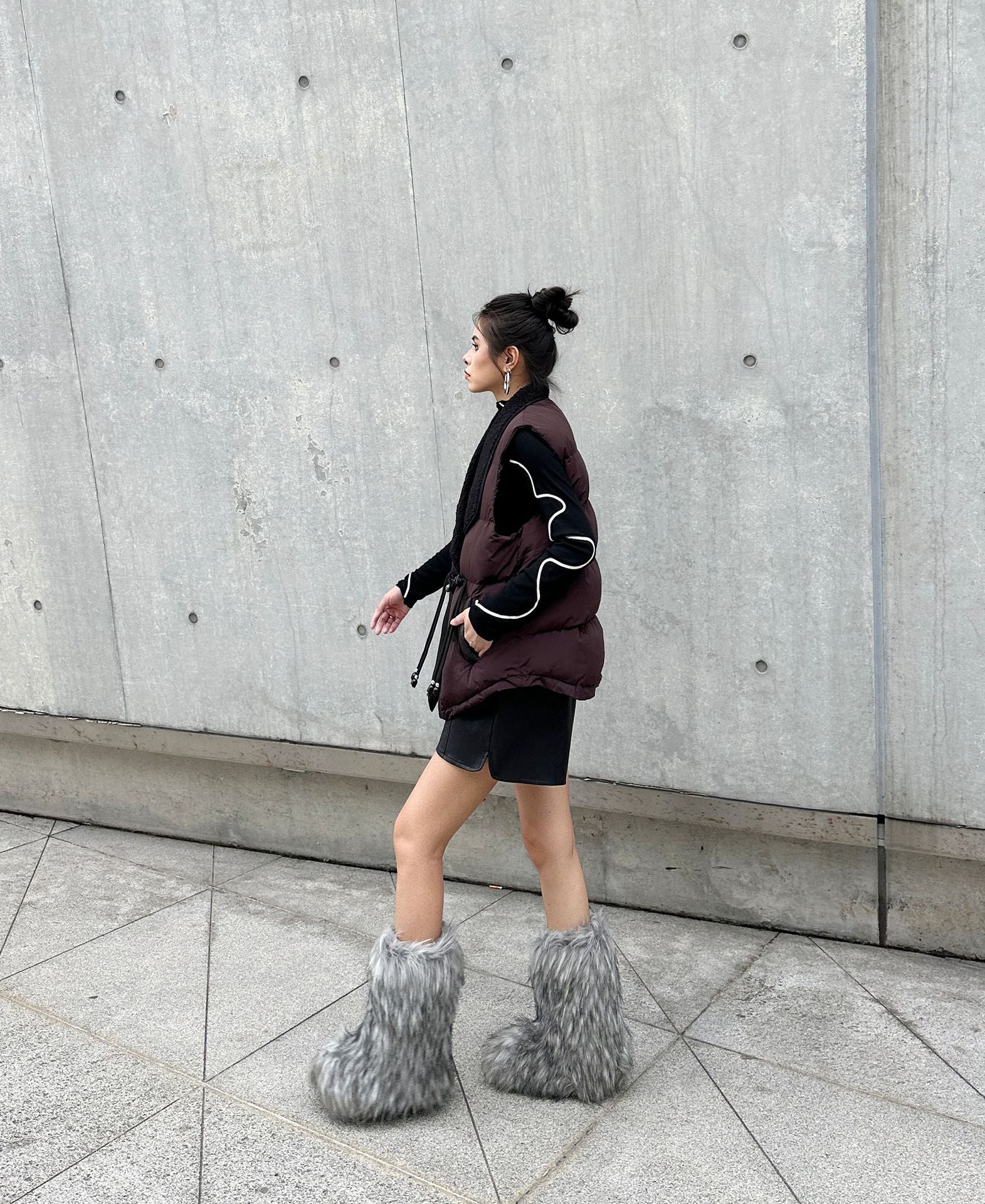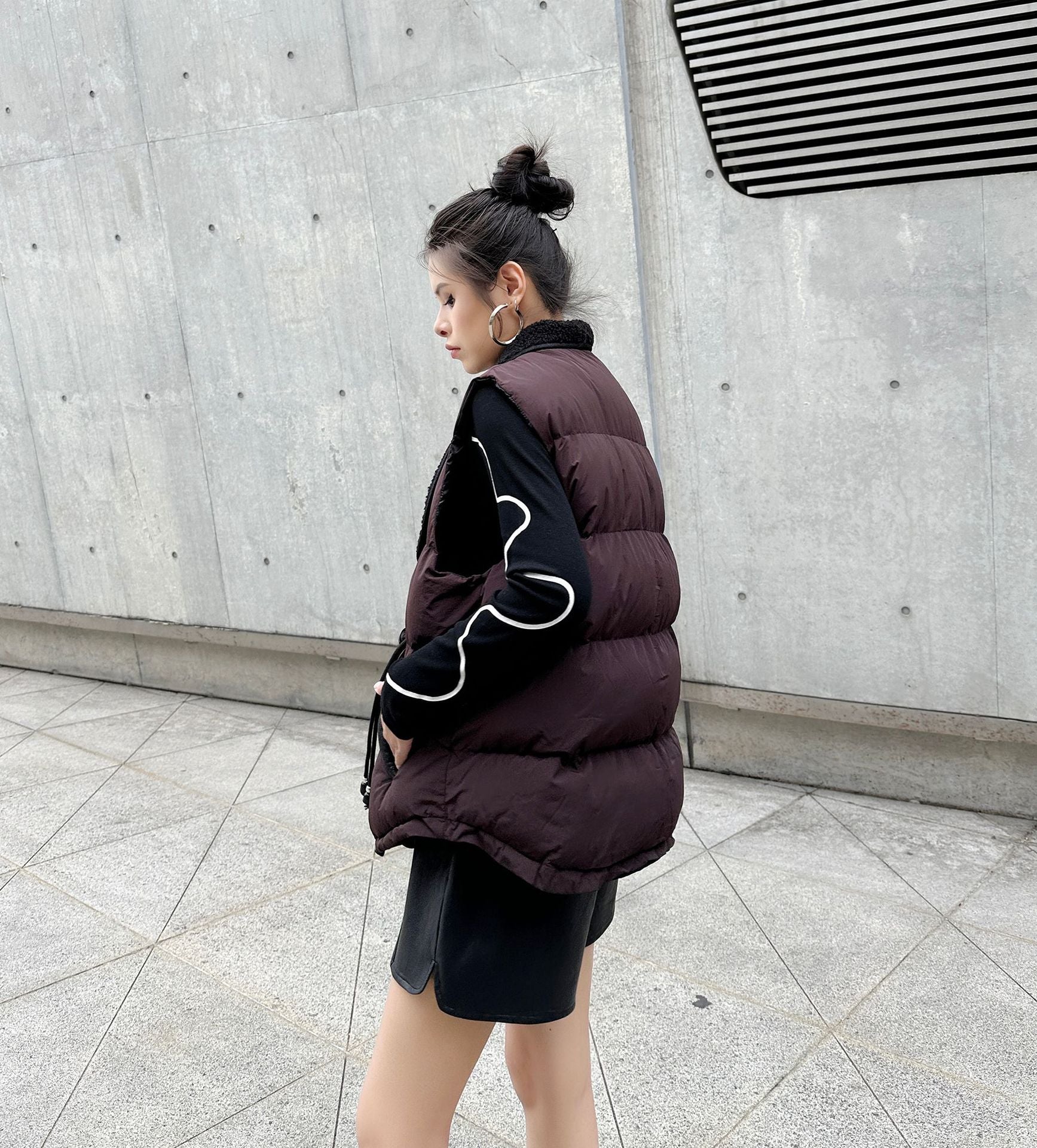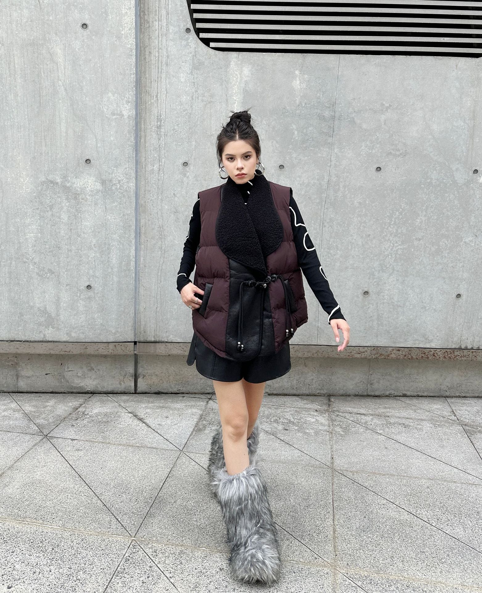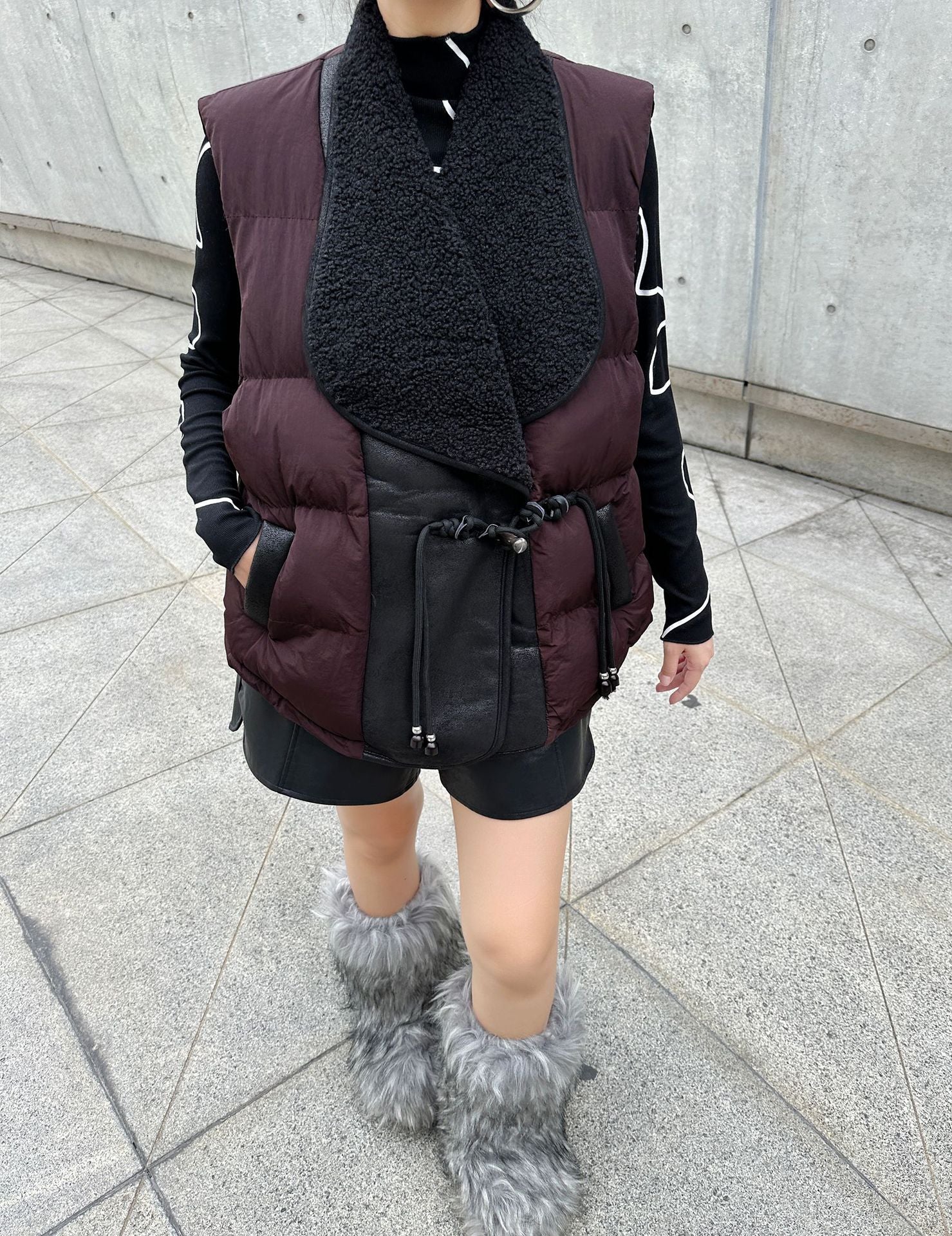 ふっくらとしたパフデザインに、内側のシープボアとスエード調素材を組み合わせた異素材構成のベスト。フロントにはドローストリングを配し、ウエストラインを自在に調整できる構造。ワイドなショールカラーが首元を包み込み、軽快さと温もりを両立。ミニマルなブラック×ディープブラウンの配色が都会的なムードを演出し、モードなコーディネートに深みを加える。