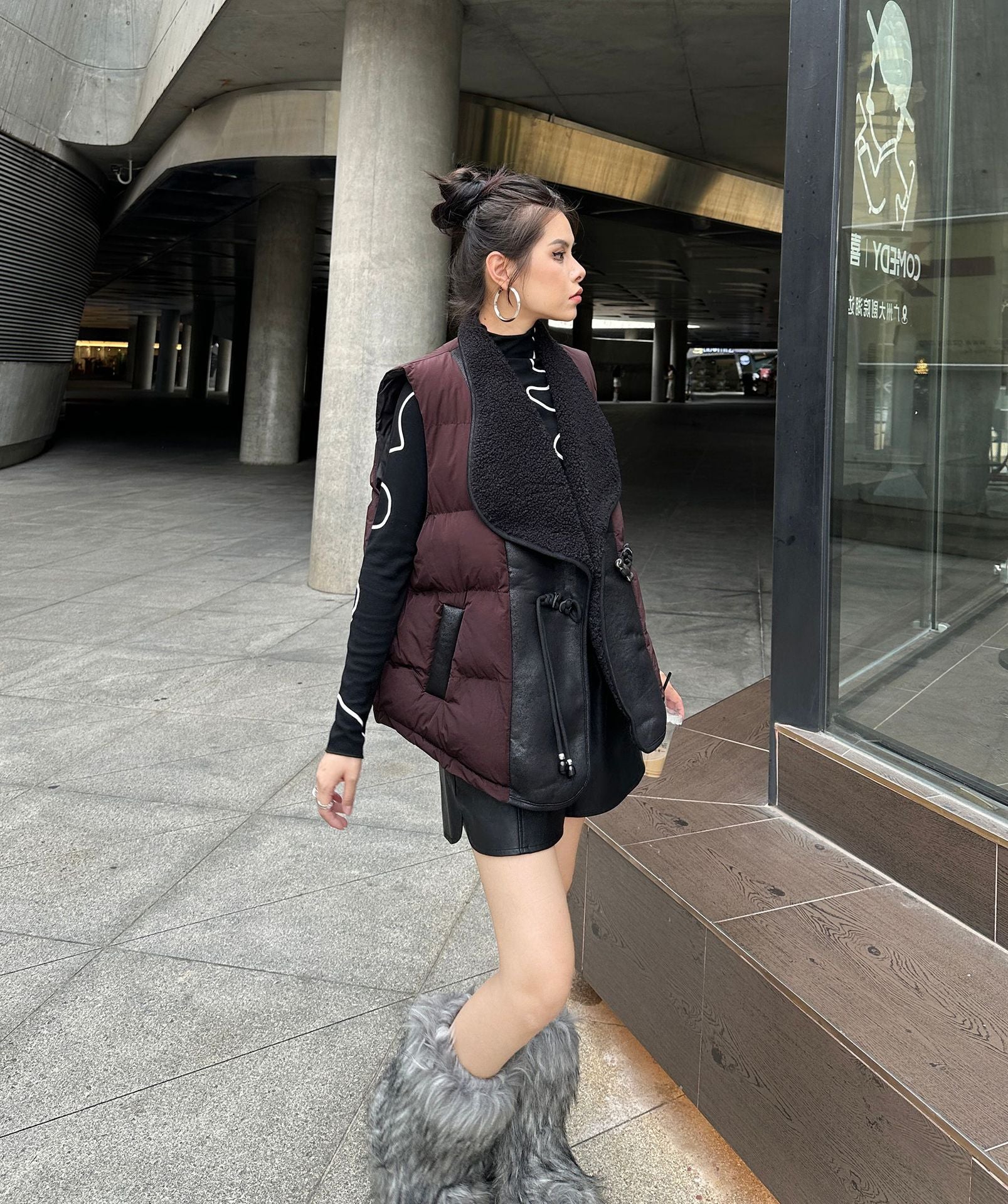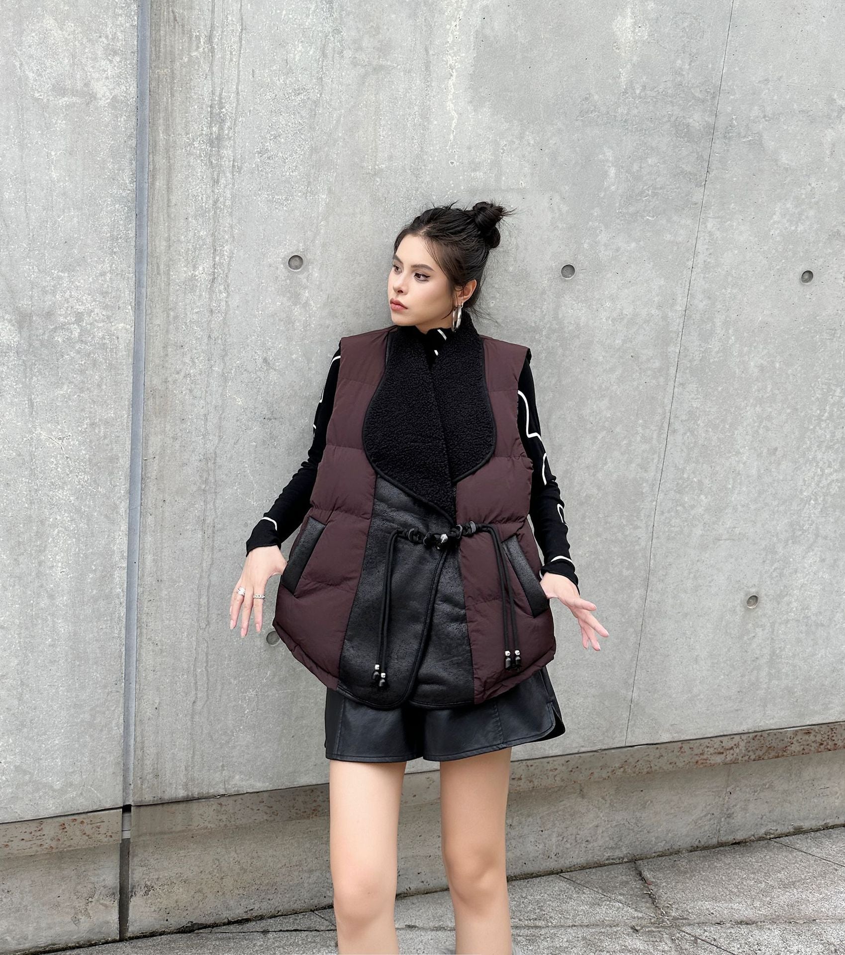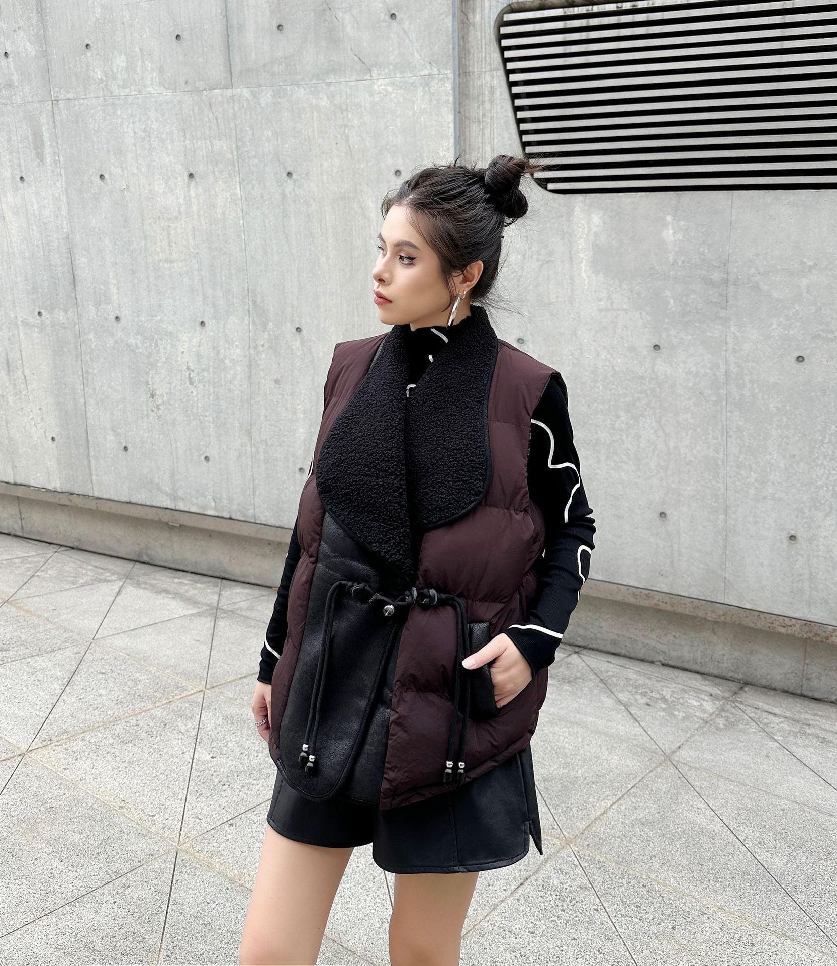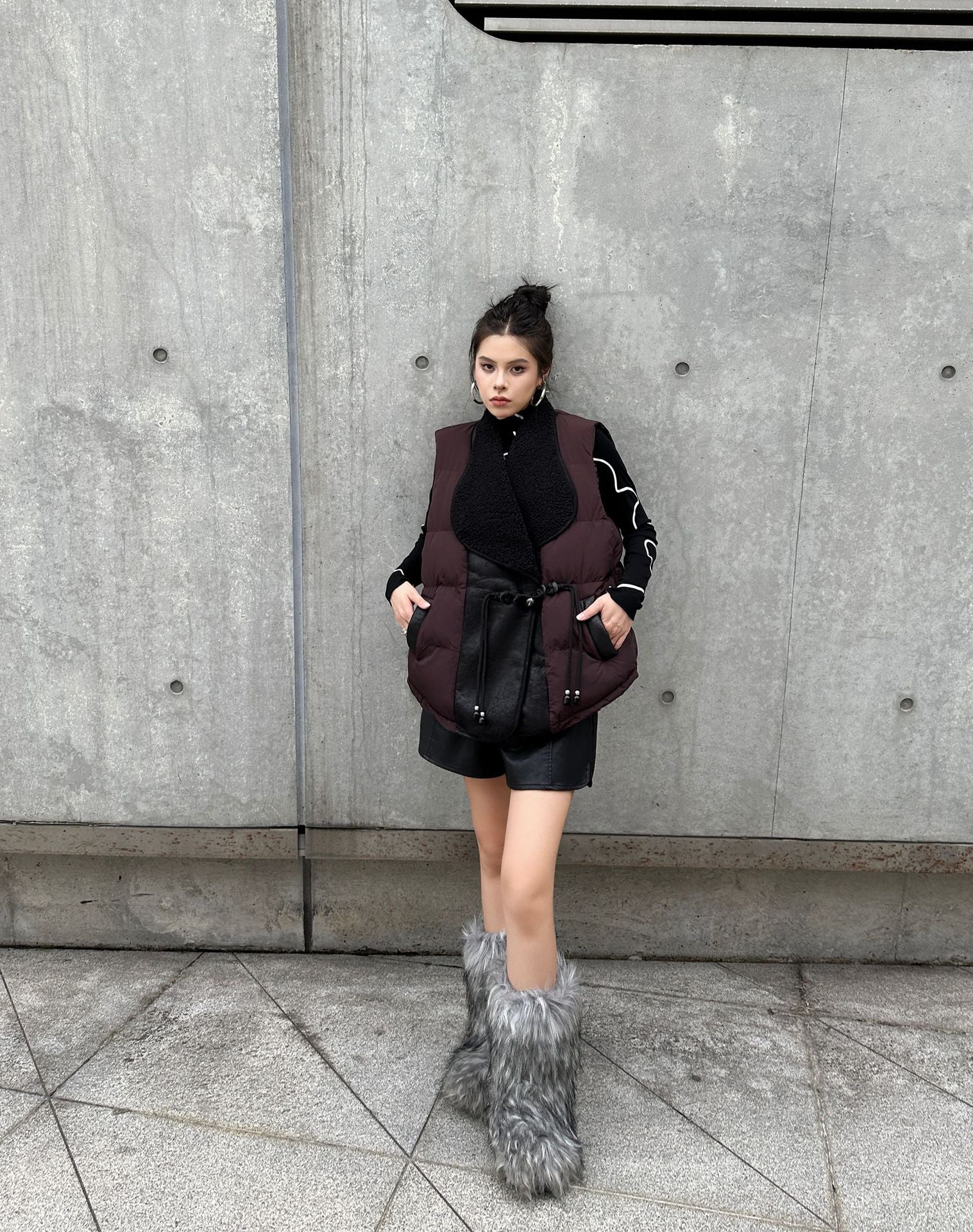 ふっくらとしたパフデザインに、内側のシープボアとスエード調素材を組み合わせた異素材構成のベスト。フロントにはドローストリングを配し、ウエストラインを自在に調整できる構造。ワイドなショールカラーが首元を包み込み、軽快さと温もりを両立。ミニマルなブラック×ディープブラウンの配色が都会的なムードを演出し、モードなコーディネートに深みを加える。