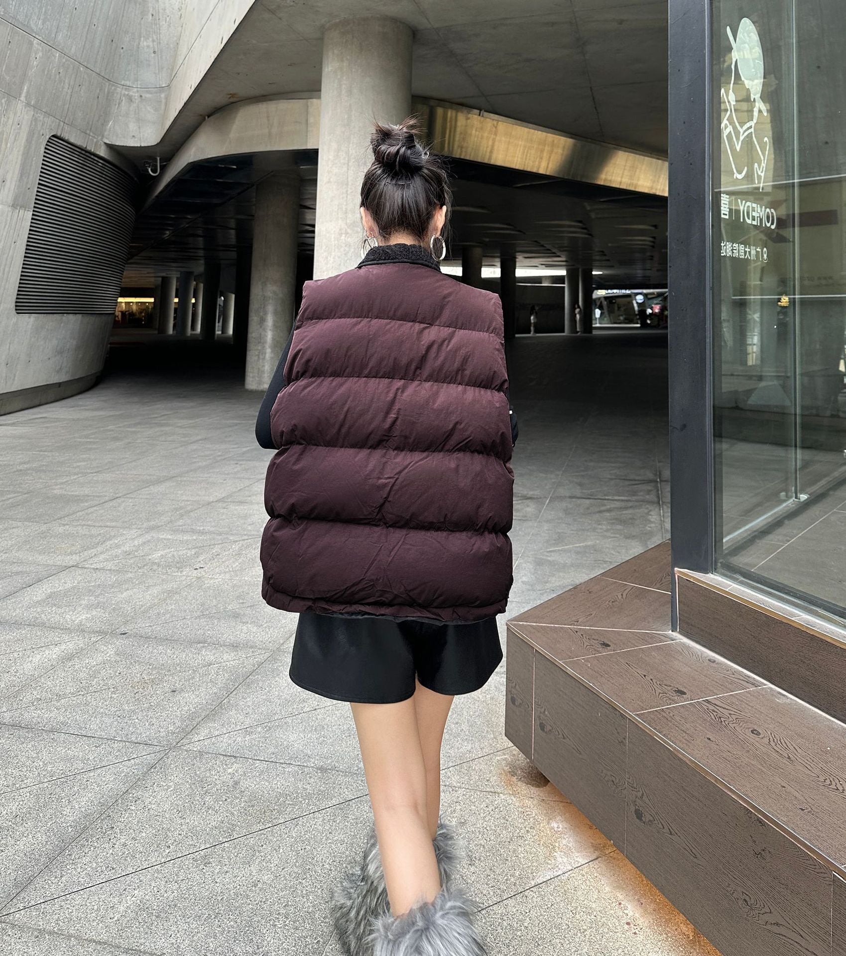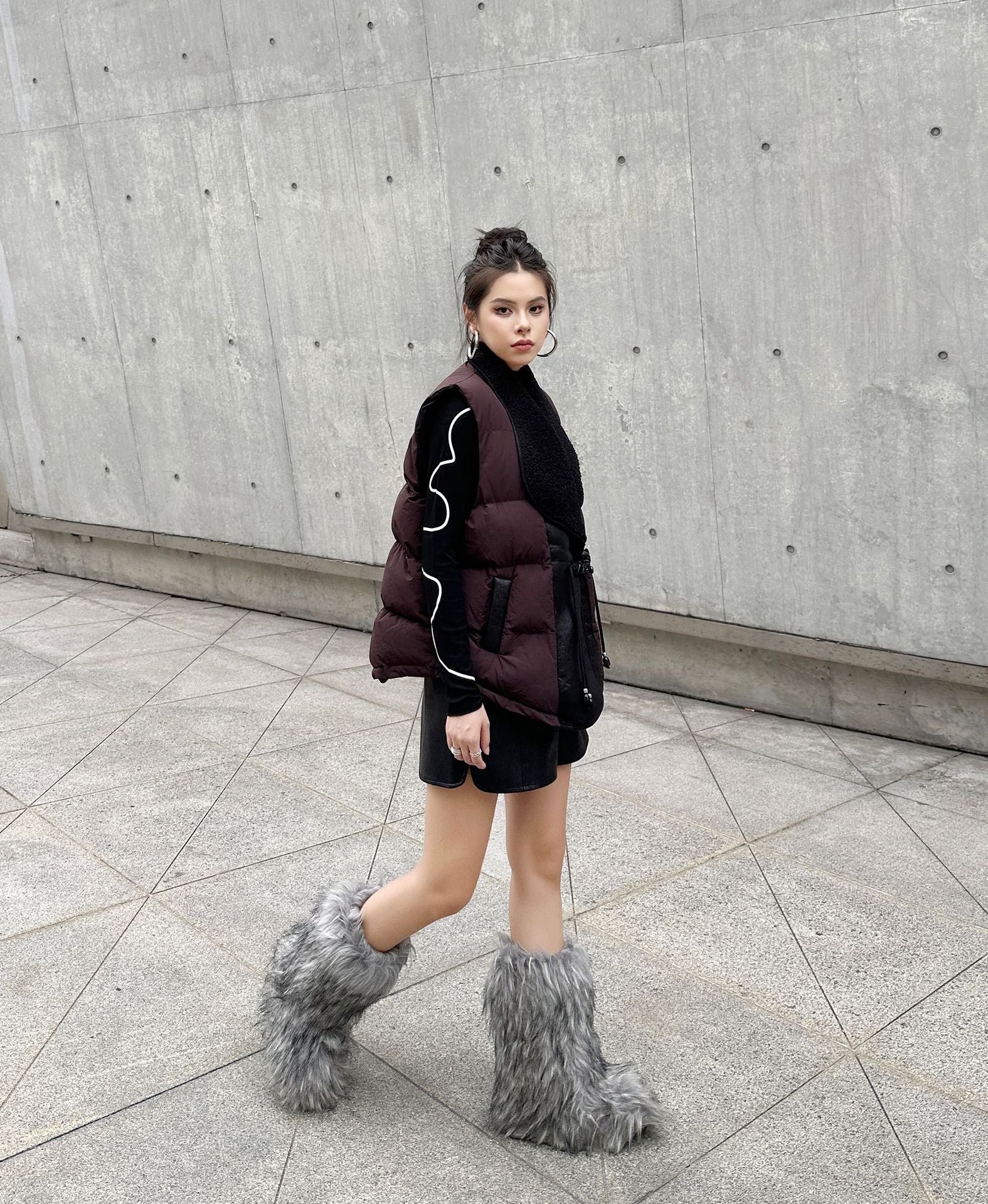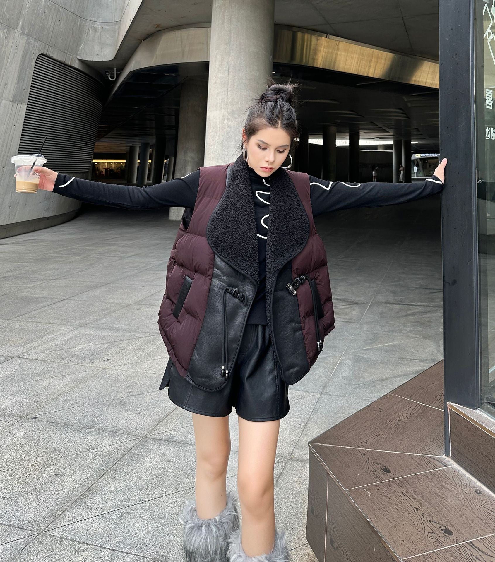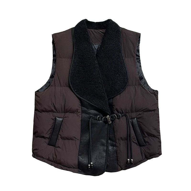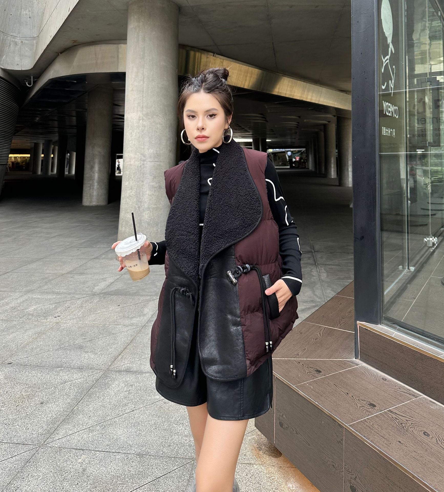 ふっくらとしたパフデザインに、内側のシープボアとスエード調素材を組み合わせた異素材構成のベスト。フロントにはドローストリングを配し、ウエストラインを自在に調整できる構造。ワイドなショールカラーが首元を包み込み、軽快さと温もりを両立。ミニマルなブラック×ディープブラウンの配色が都会的なムードを演出し、モードなコーディネートに深みを加える。