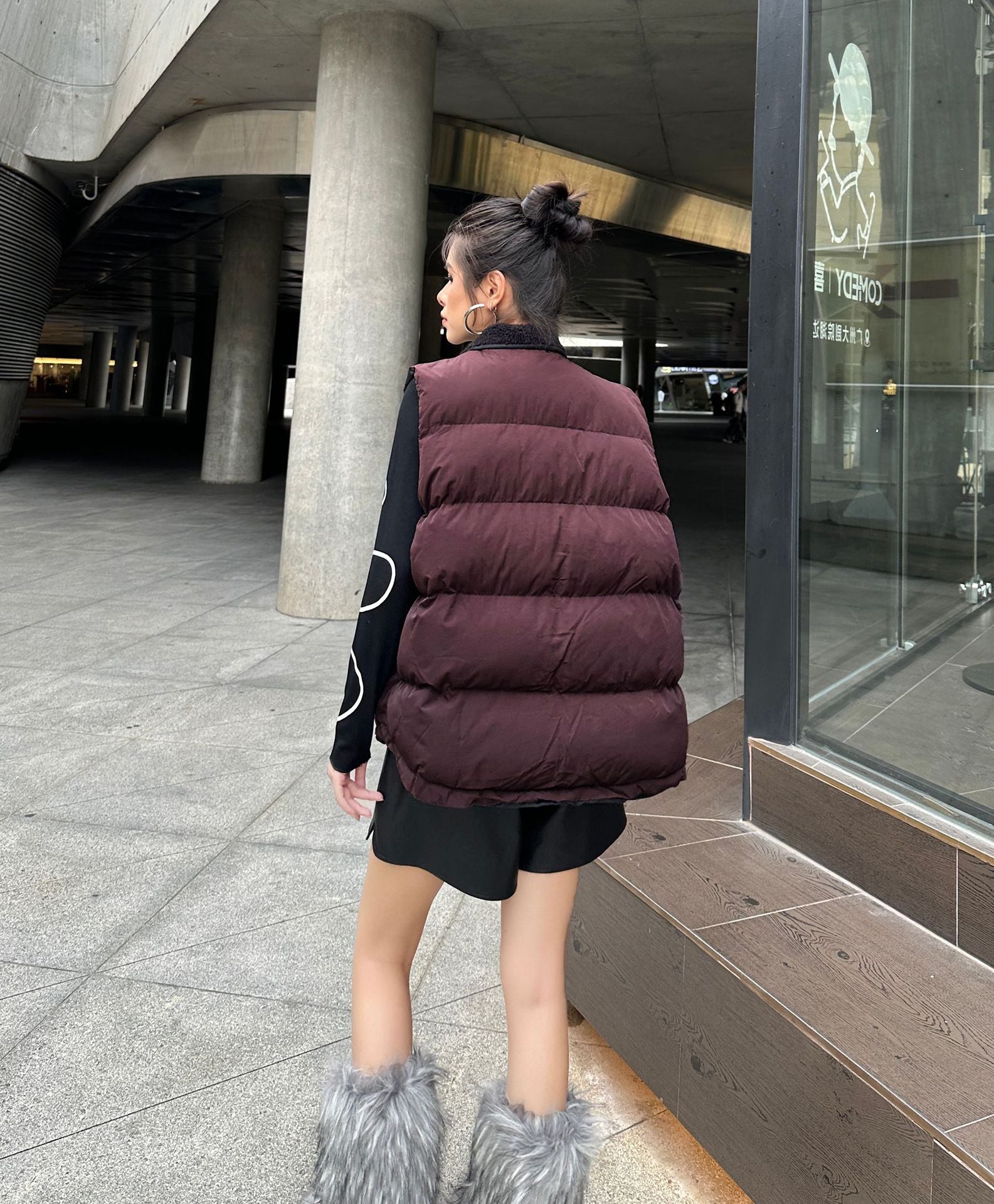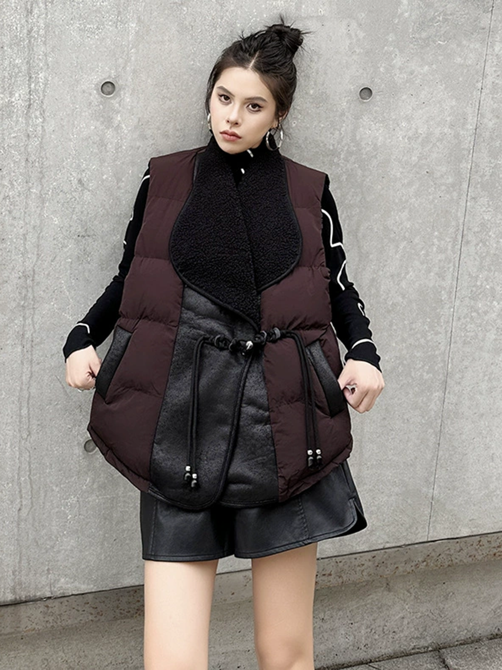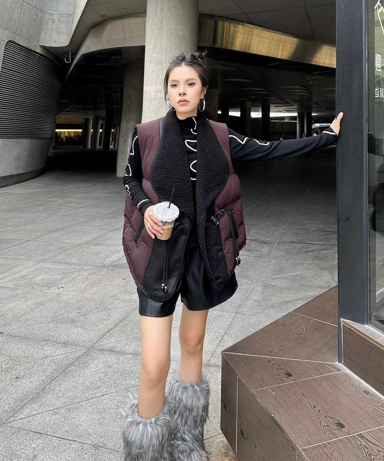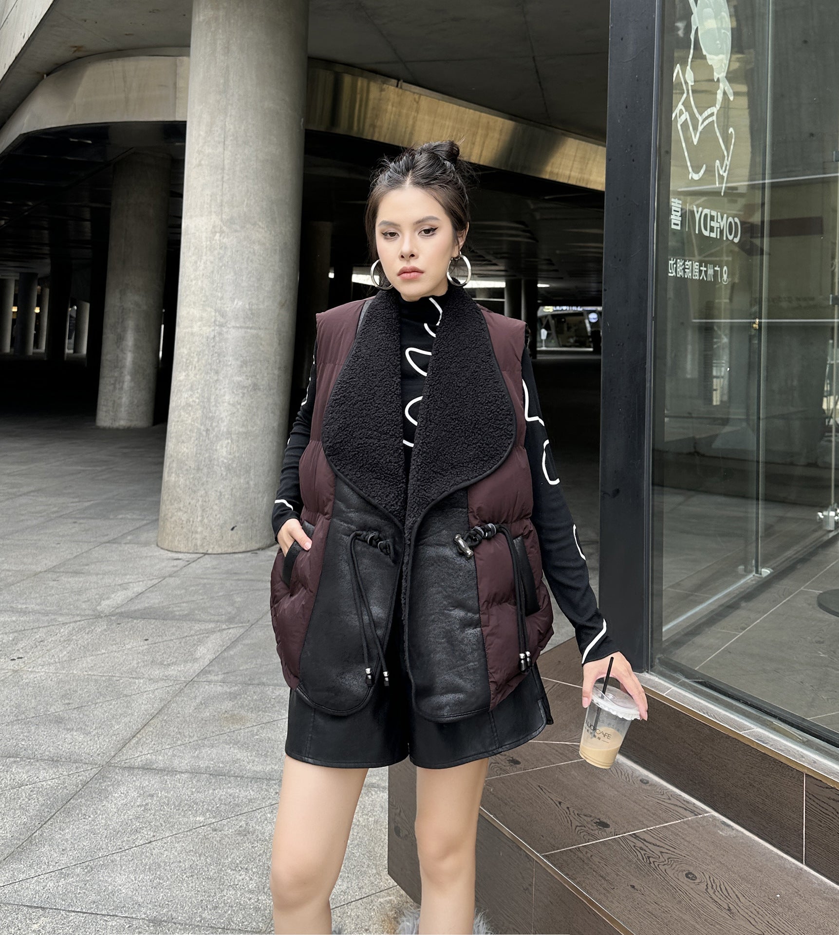 ふっくらとしたパフデザインに、内側のシープボアとスエード調素材を組み合わせた異素材構成のベスト。フロントにはドローストリングを配し、ウエストラインを自在に調整できる構造。ワイドなショールカラーが首元を包み込み、軽快さと温もりを両立。ミニマルなブラック×ディープブラウンの配色が都会的なムードを演出し、モードなコーディネートに深みを加える。
