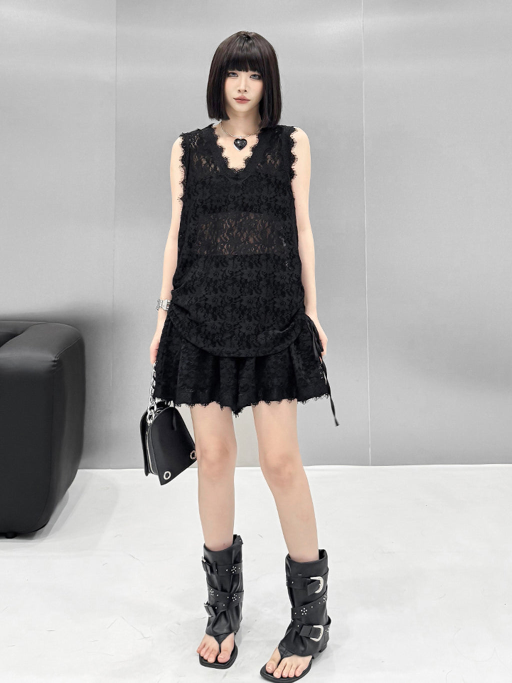 繊細なレース素材で仕立てたノースリーブトップスとショートパンツのセットシリーズ。トップスはヒップラインにかかる長めの着丈で、両サイドのギャザー調整が可能。裾のスカラップレースが華やかさを添え、程よい透け感がスタイリングに抜け感を生む。パンツは同素材の裏地付きで安心感があり、動くたびに揺れる軽やかさが印象的。セットとしても単品使いとしても着回しの幅が広がるデザイン。