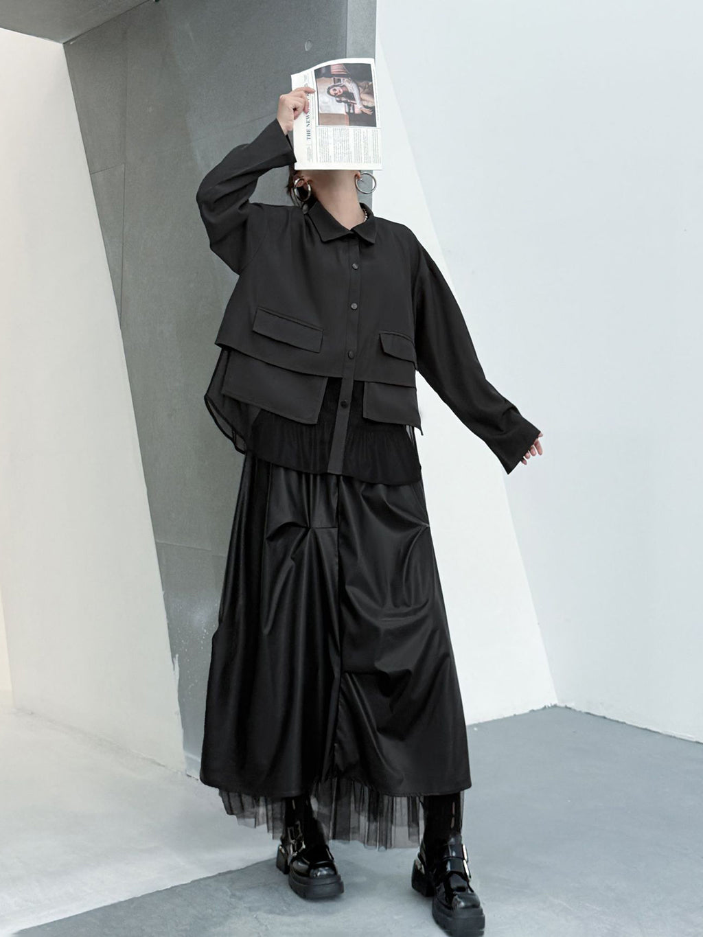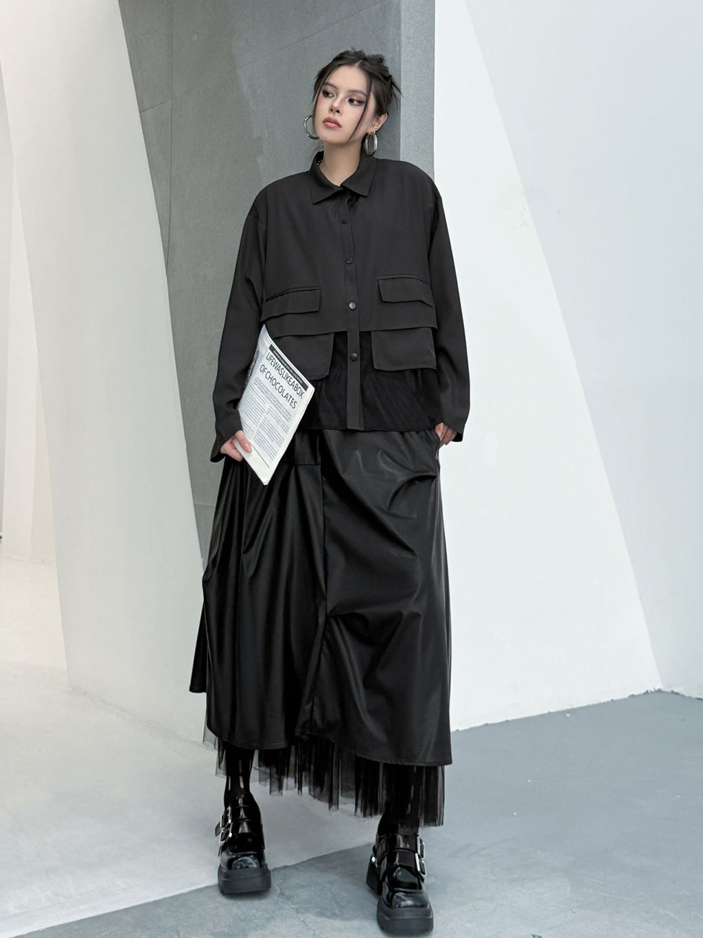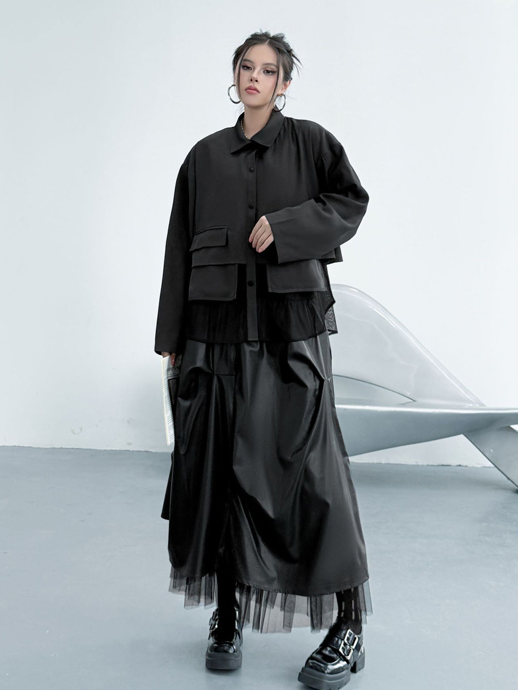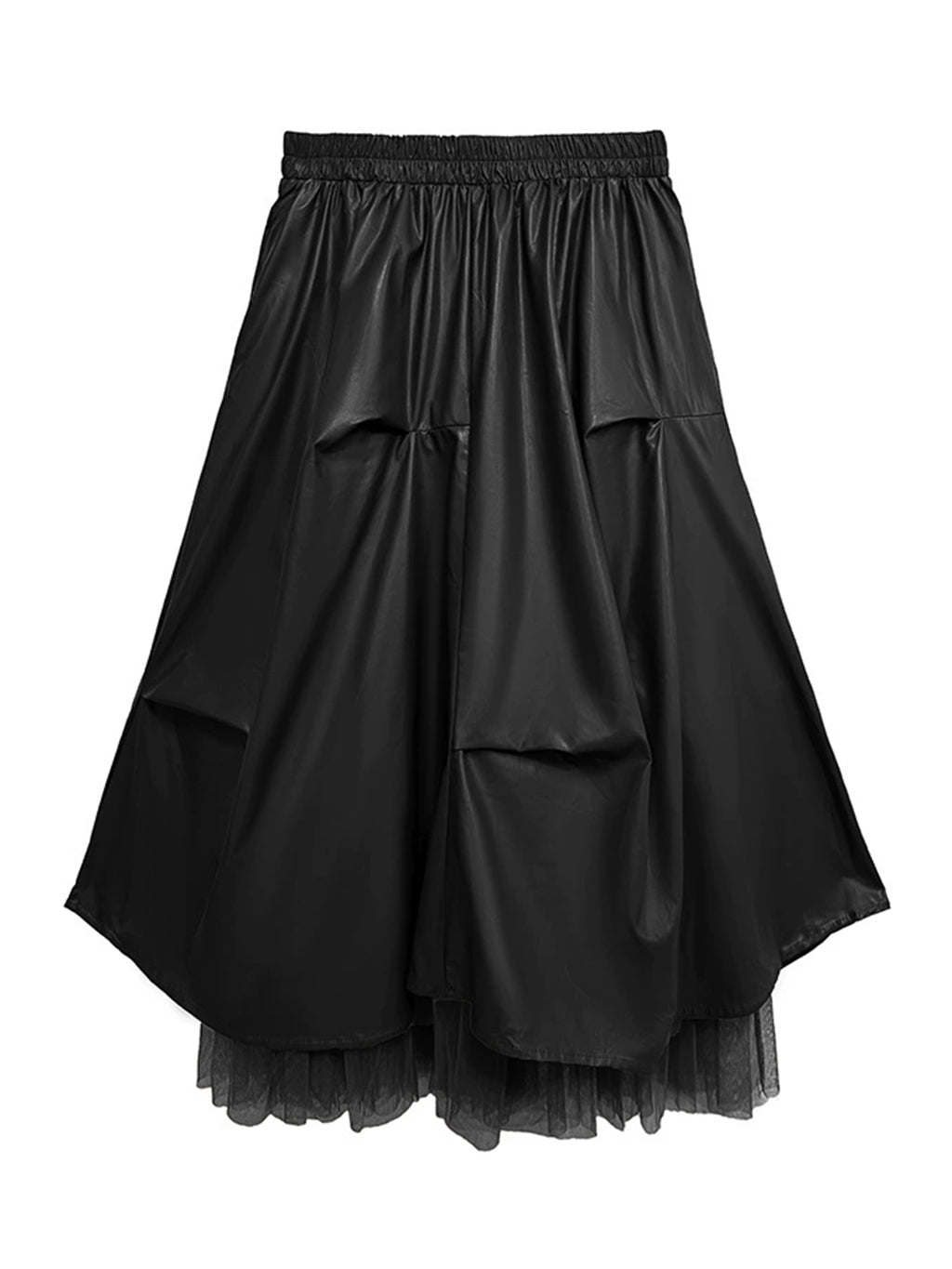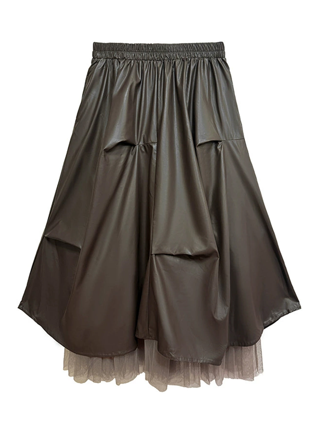 ツヤを抑えたマットなPU素材をベースに、裾から繊細なチュールが覗くロングスカート。フロントに配されたギャザーパネルが自然な立体感を生み、歩くたびに揺れるフォルムに奥行きを加える。ウエストはゴム仕様でストレスのない着用感に仕上げられており、ドローコードなどの装飾を省いたシンプルな設計がモードな印象を引き立てる。裾のチュールはあえて露出を抑えた設計で、アウターやロングシャツとのレイヤードでも映える設計。スニーカーからブーツまで幅広く合わせやすく、スタイリングの軸となる。
