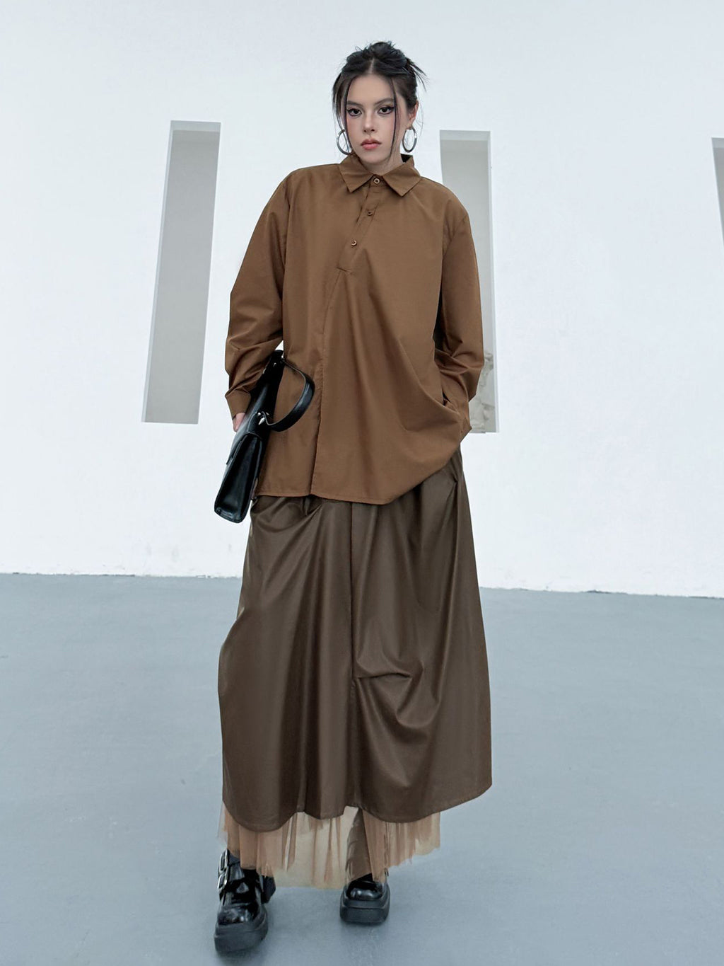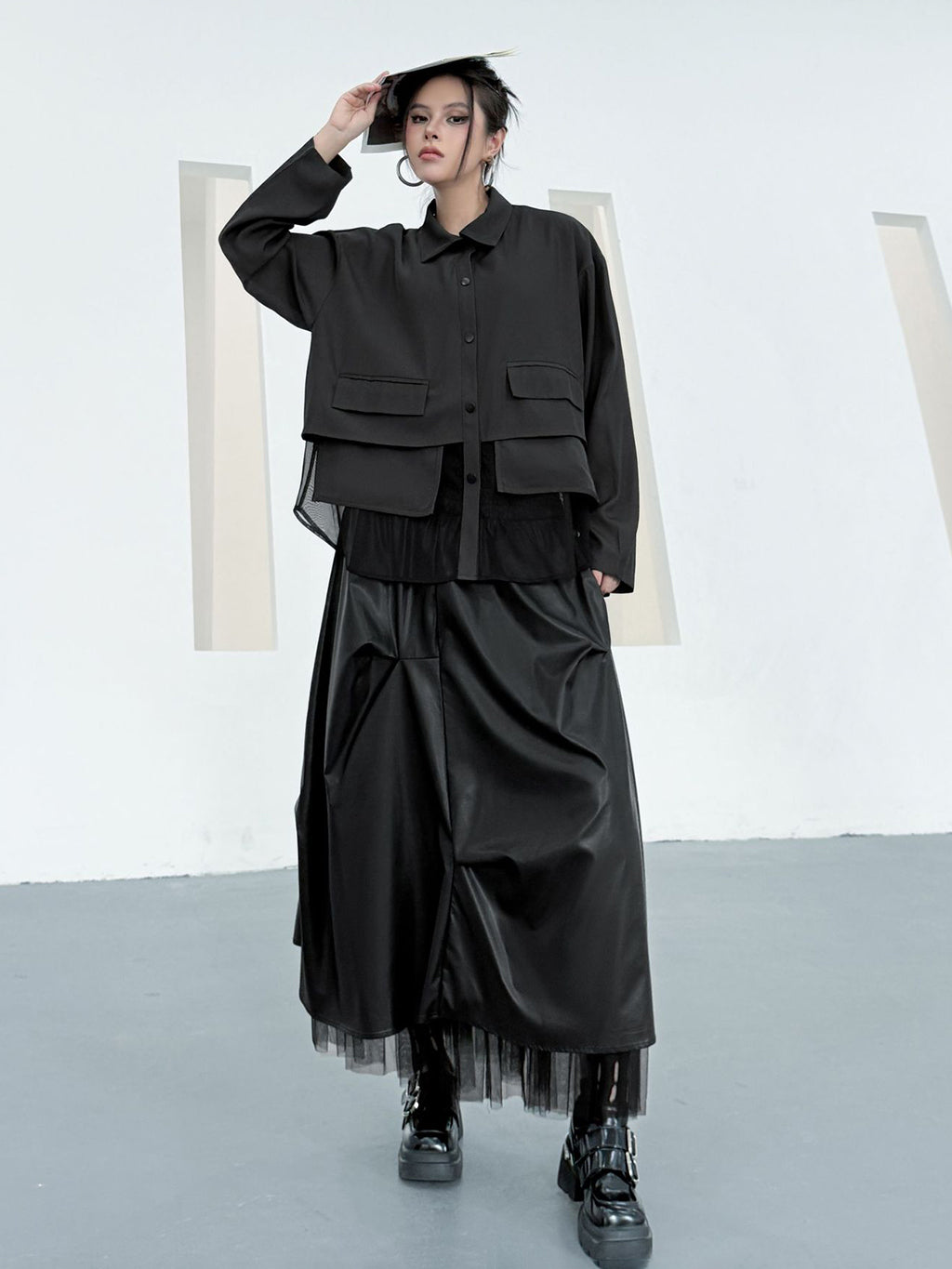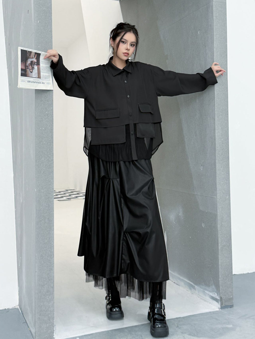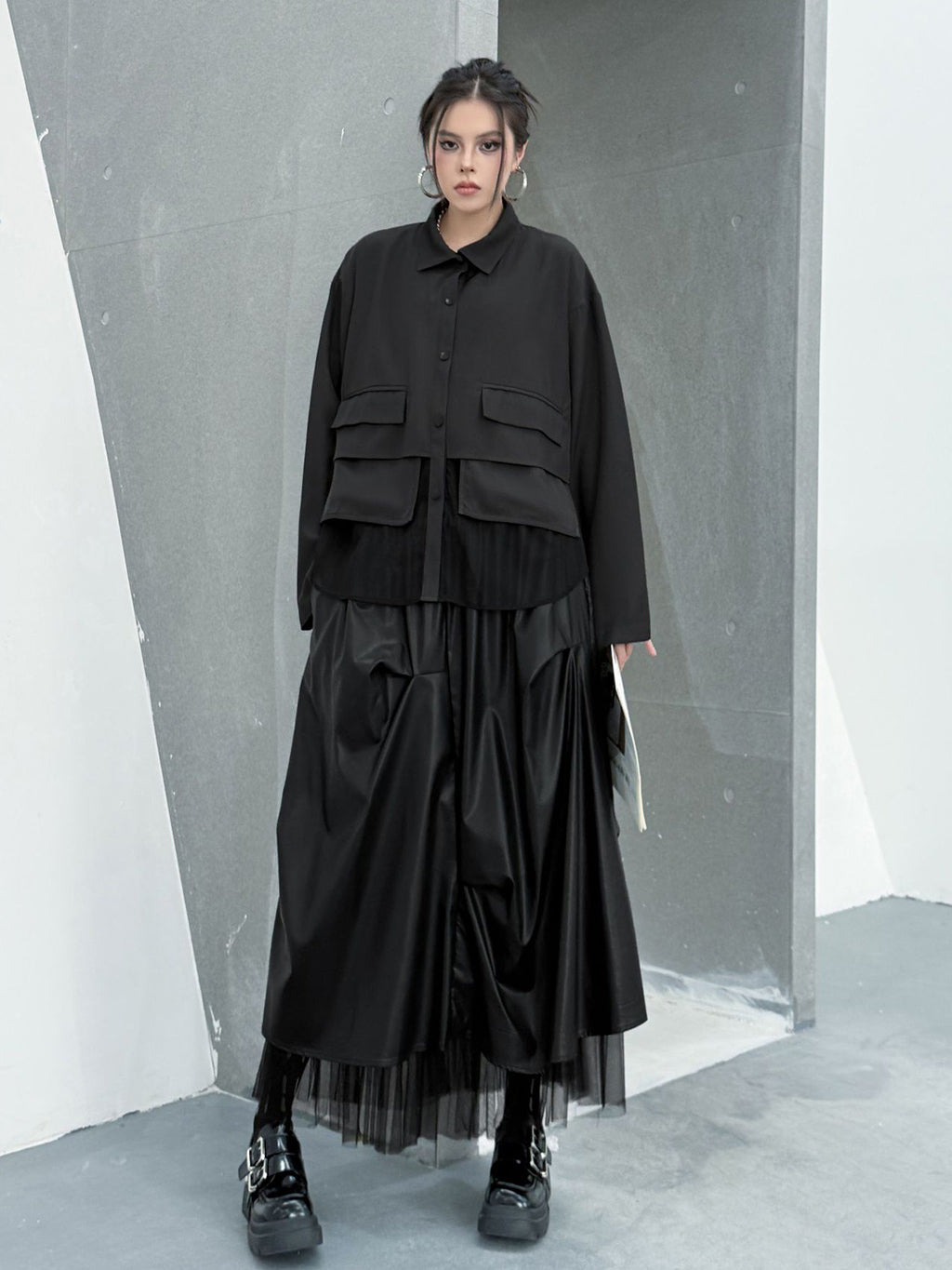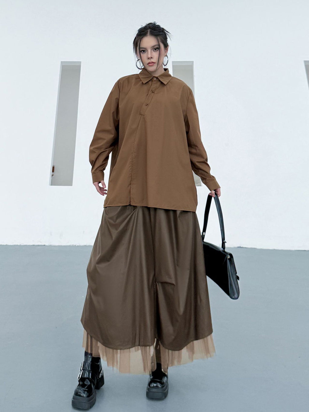 ツヤを抑えたマットなPU素材をベースに、裾から繊細なチュールが覗くロングスカート。フロントに配されたギャザーパネルが自然な立体感を生み、歩くたびに揺れるフォルムに奥行きを加える。ウエストはゴム仕様でストレスのない着用感に仕上げられており、ドローコードなどの装飾を省いたシンプルな設計がモードな印象を引き立てる。裾のチュールはあえて露出を抑えた設計で、アウターやロングシャツとのレイヤードでも映える設計。スニーカーからブーツまで幅広く合わせやすく、スタイリングの軸となる。