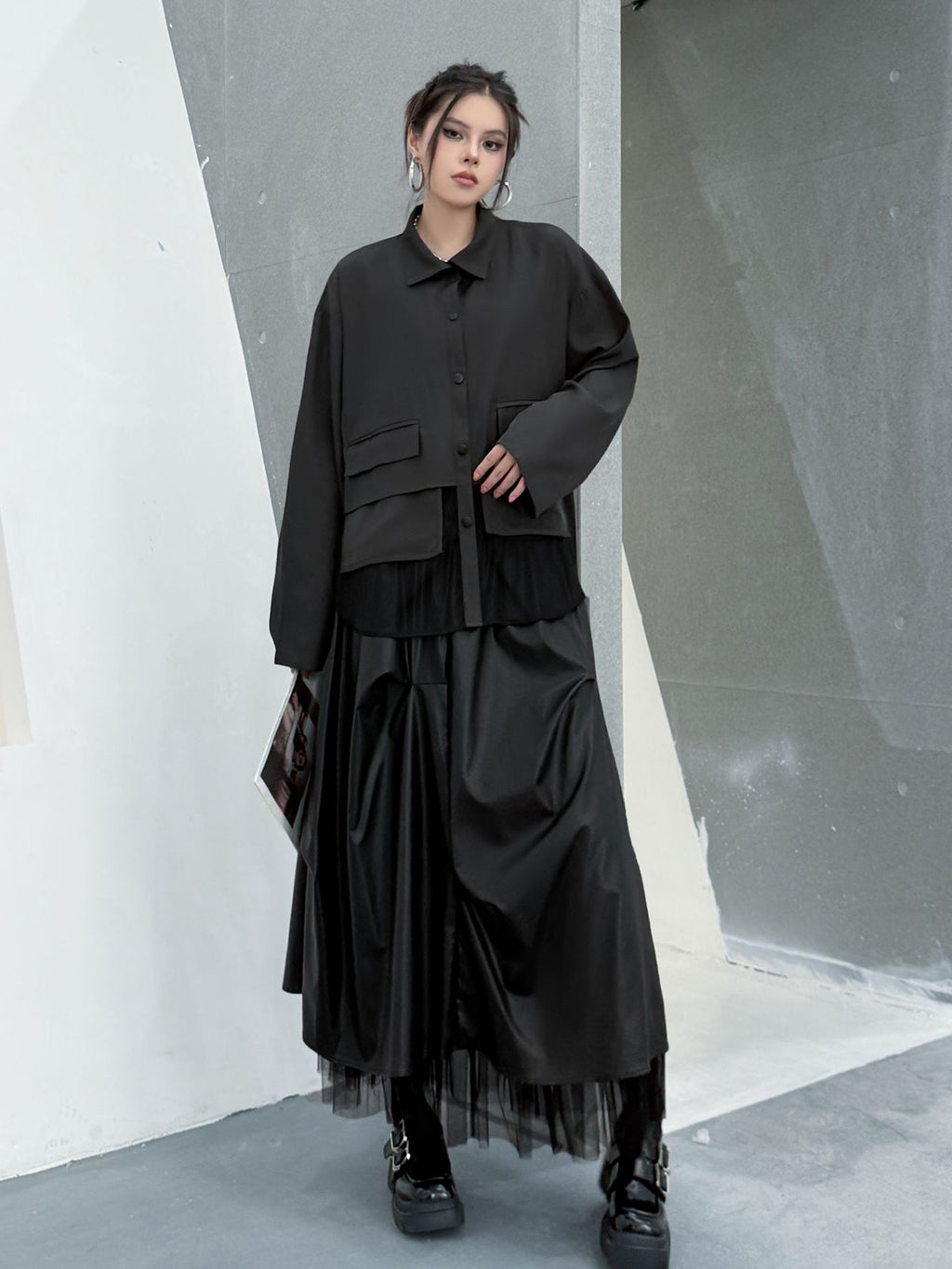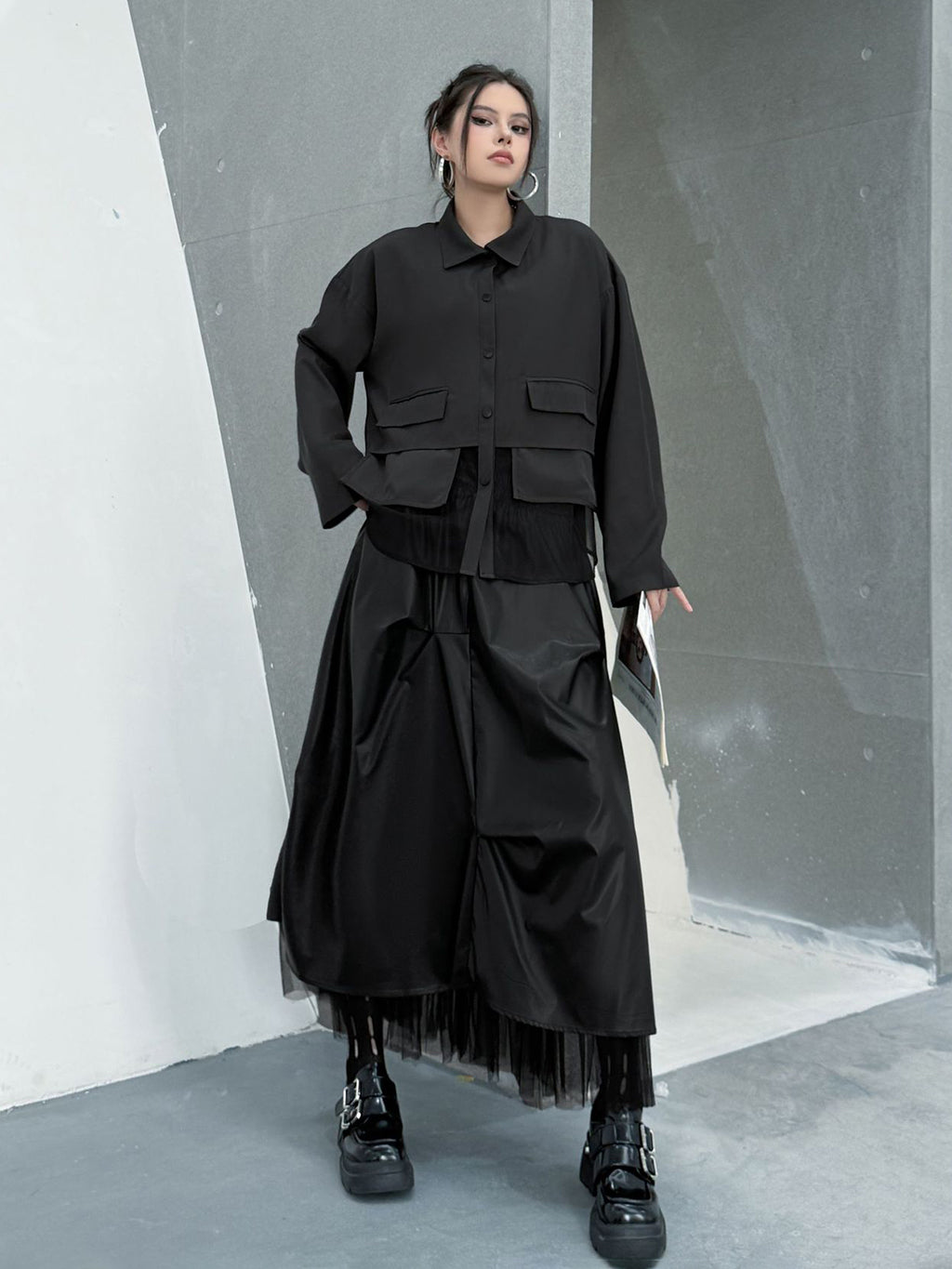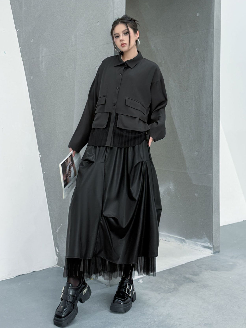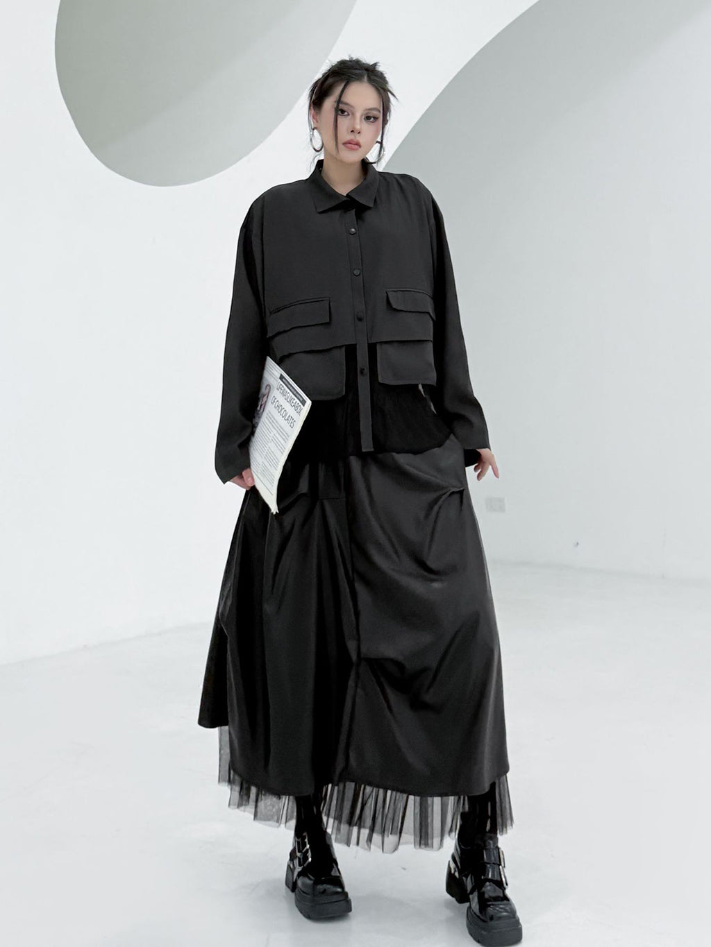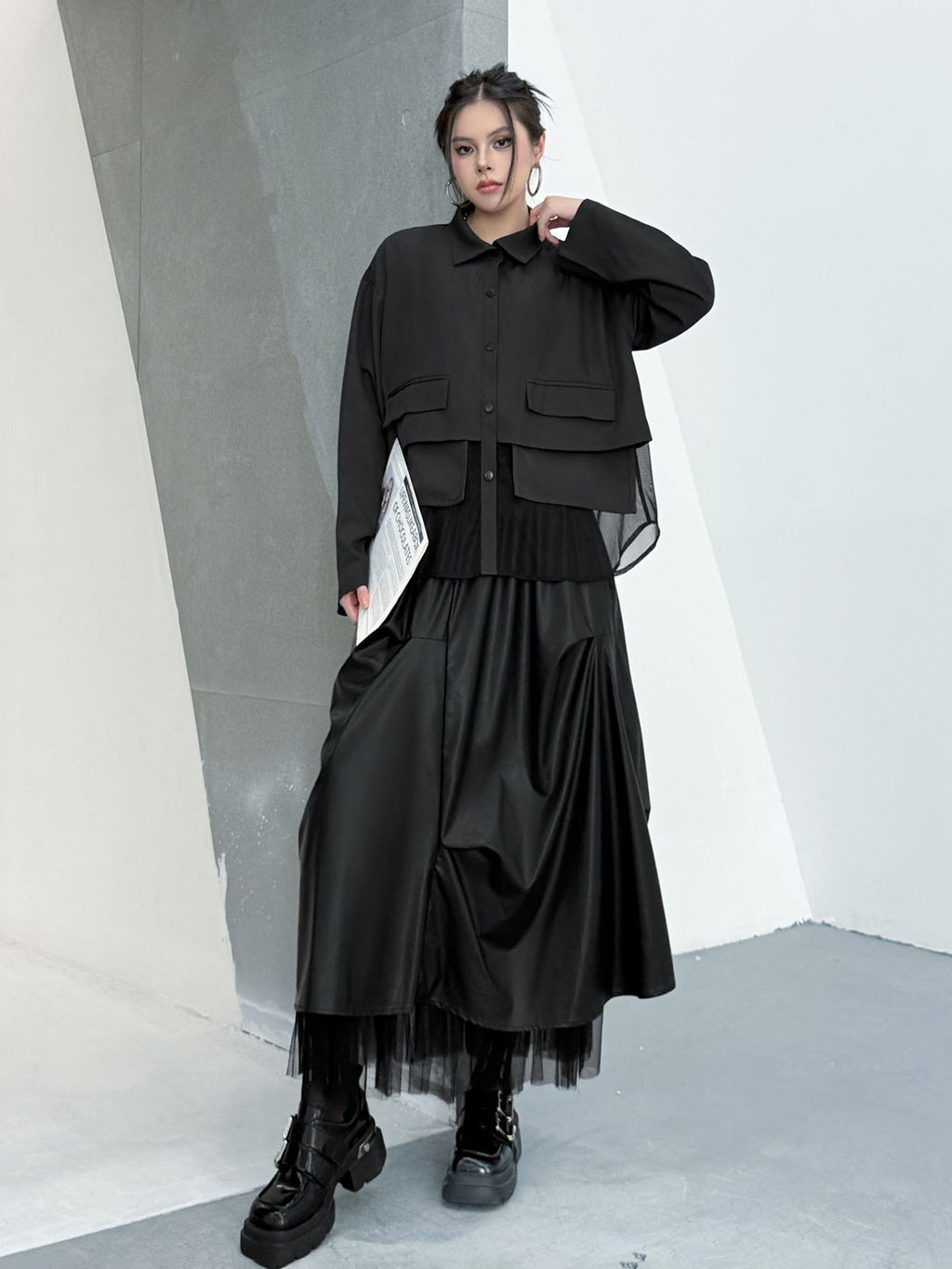 ツヤを抑えたマットなPU素材をベースに、裾から繊細なチュールが覗くロングスカート。フロントに配されたギャザーパネルが自然な立体感を生み、歩くたびに揺れるフォルムに奥行きを加える。ウエストはゴム仕様でストレスのない着用感に仕上げられており、ドローコードなどの装飾を省いたシンプルな設計がモードな印象を引き立てる。裾のチュールはあえて露出を抑えた設計で、アウターやロングシャツとのレイヤードでも映える設計。スニーカーからブーツまで幅広く合わせやすく、スタイリングの軸となる。