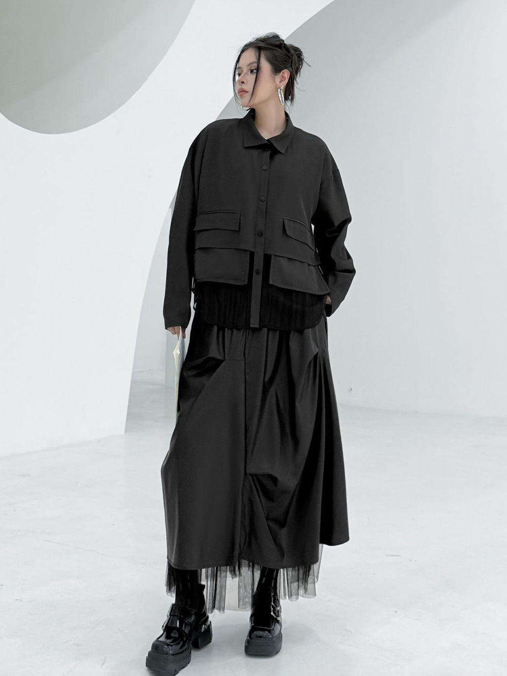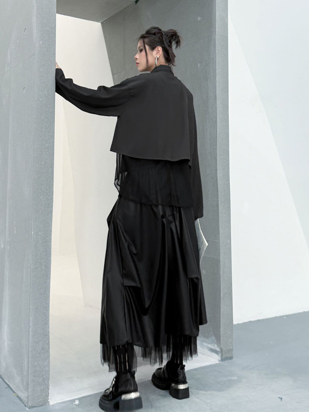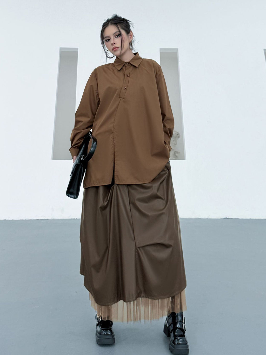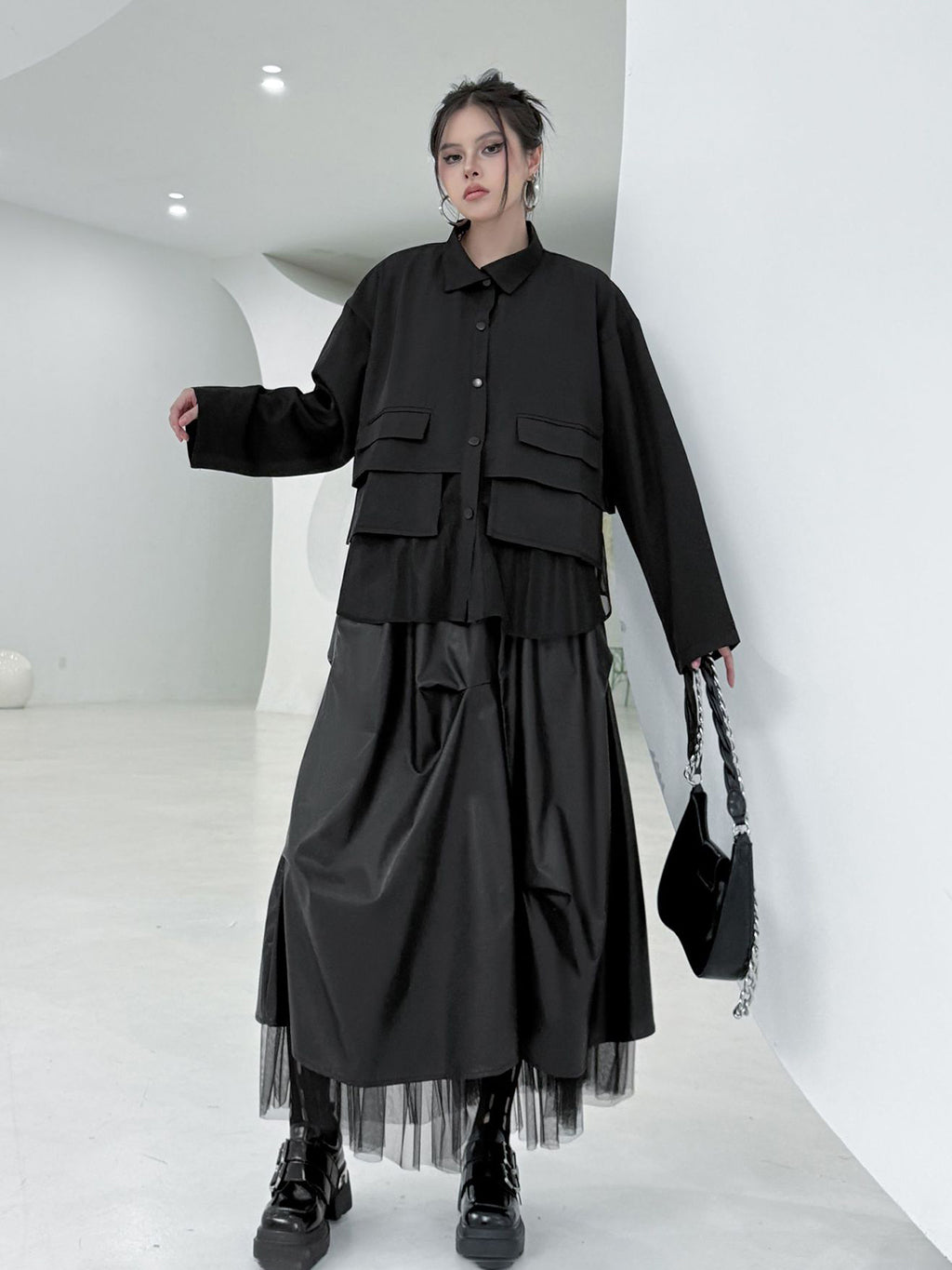 ツヤを抑えたマットなPU素材をベースに、裾から繊細なチュールが覗くロングスカート。フロントに配されたギャザーパネルが自然な立体感を生み、歩くたびに揺れるフォルムに奥行きを加える。ウエストはゴム仕様でストレスのない着用感に仕上げられており、ドローコードなどの装飾を省いたシンプルな設計がモードな印象を引き立てる。裾のチュールはあえて露出を抑えた設計で、アウターやロングシャツとのレイヤードでも映える設計。スニーカーからブーツまで幅広く合わせやすく、スタイリングの軸となる。
