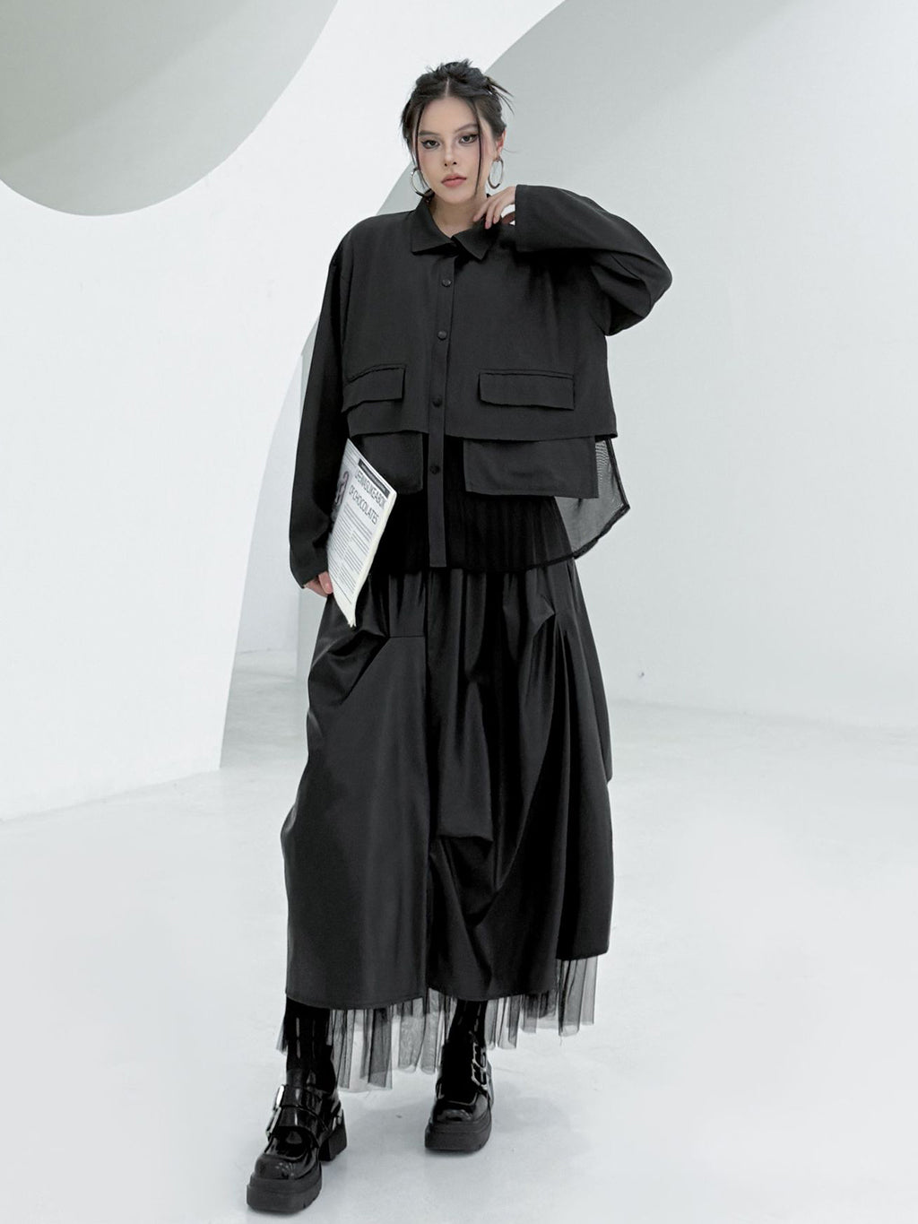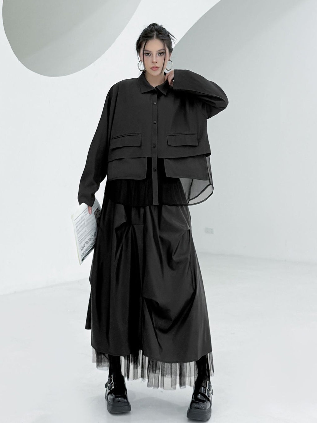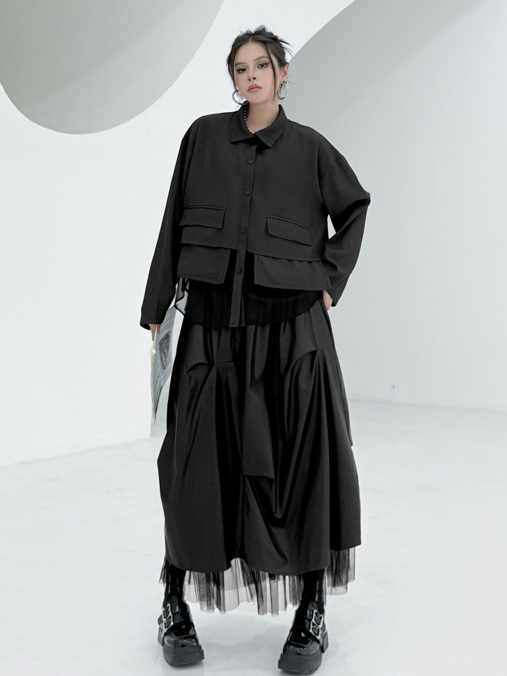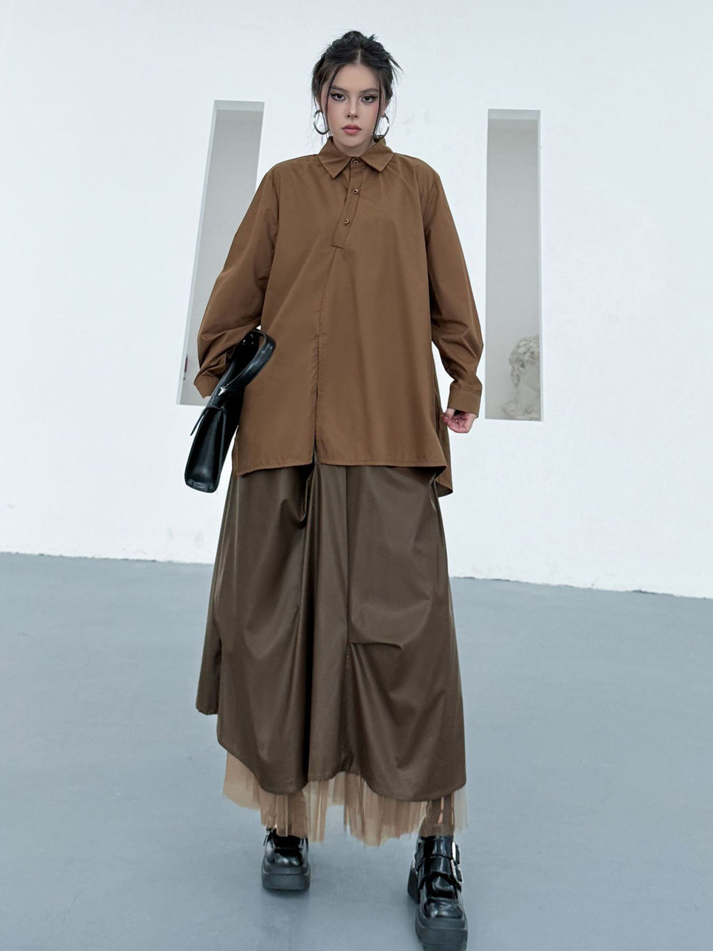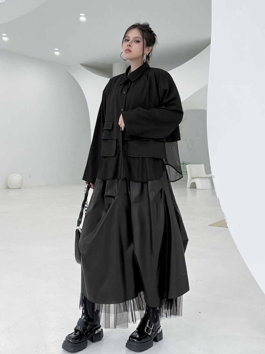 ツヤを抑えたマットなPU素材をベースに、裾から繊細なチュールが覗くロングスカート。フロントに配されたギャザーパネルが自然な立体感を生み、歩くたびに揺れるフォルムに奥行きを加える。ウエストはゴム仕様でストレスのない着用感に仕上げられており、ドローコードなどの装飾を省いたシンプルな設計がモードな印象を引き立てる。裾のチュールはあえて露出を抑えた設計で、アウターやロングシャツとのレイヤードでも映える設計。スニーカーからブーツまで幅広く合わせやすく、スタイリングの軸となる。