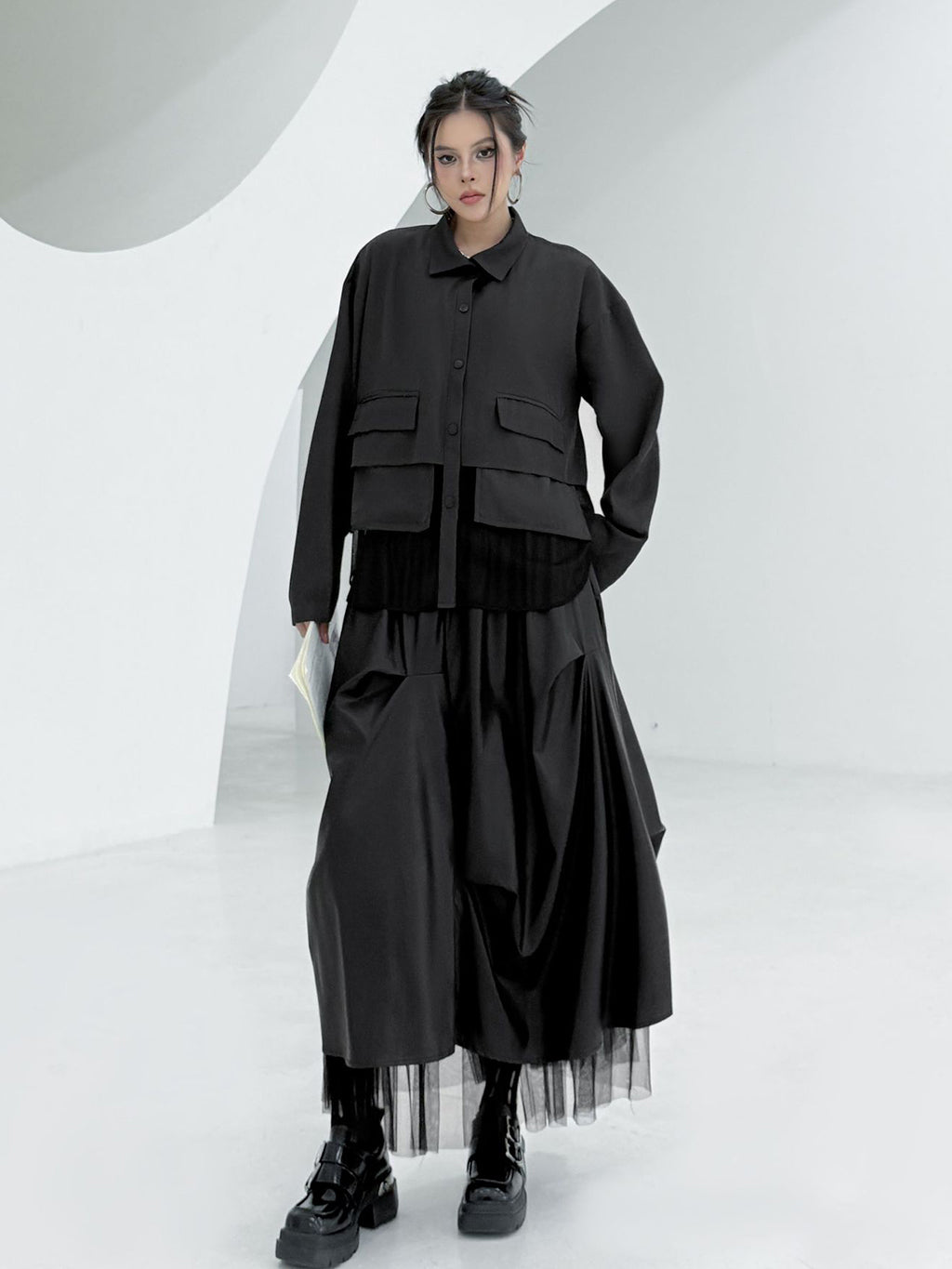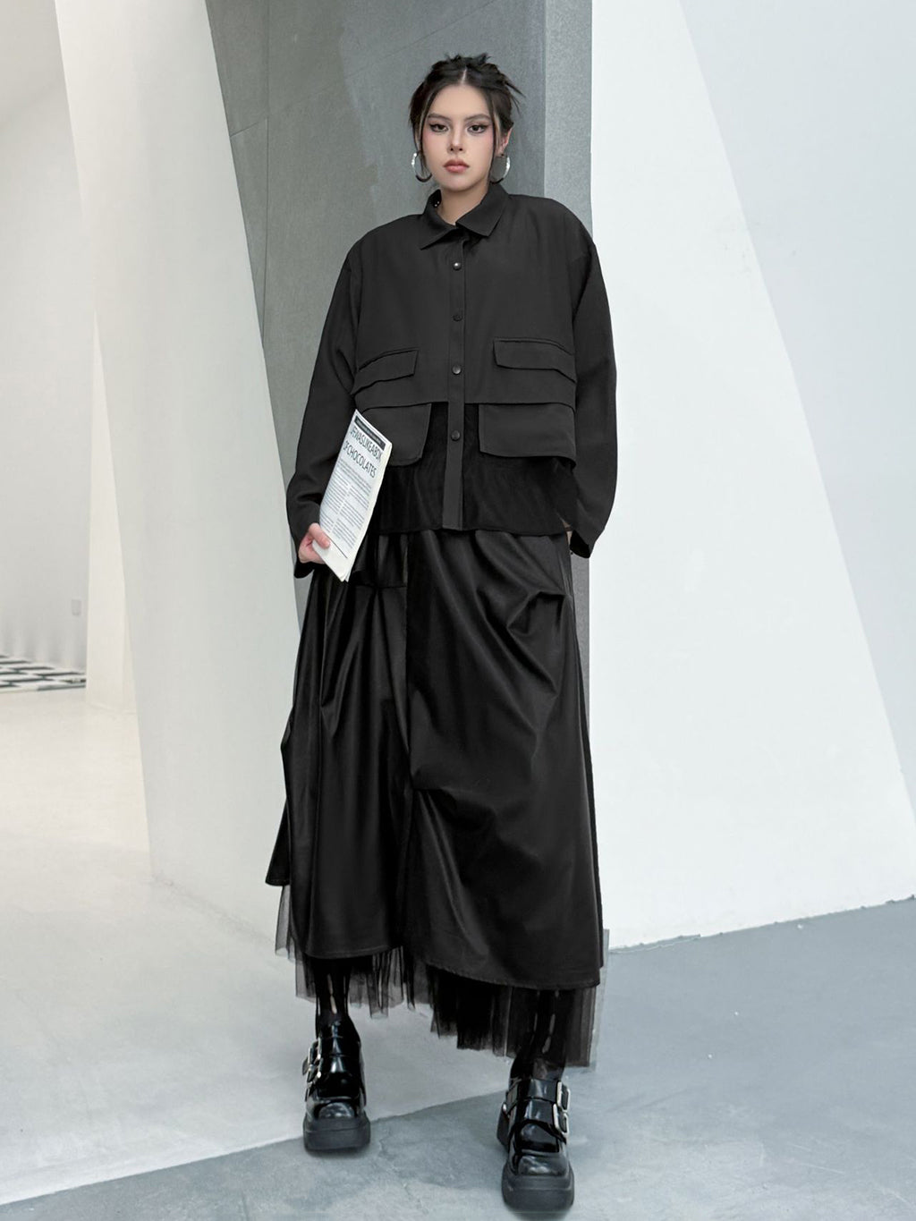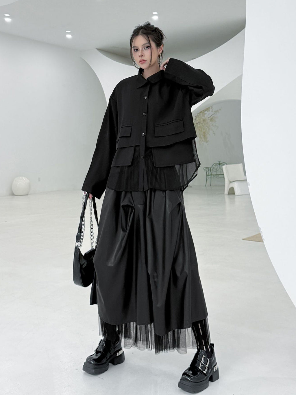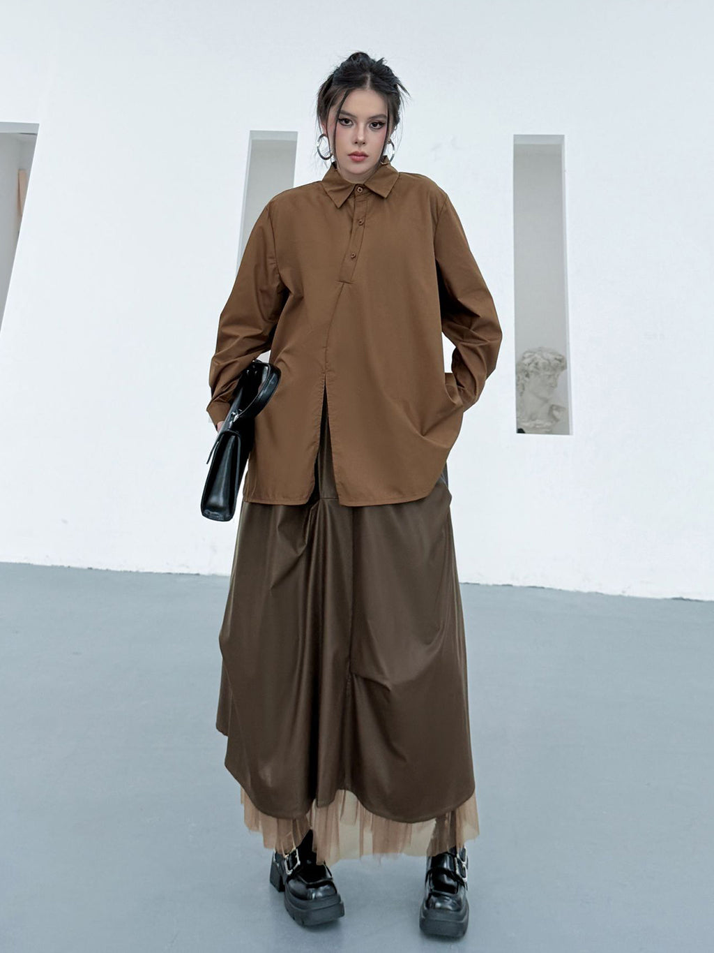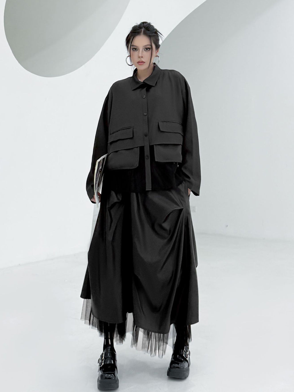 ツヤを抑えたマットなPU素材をベースに、裾から繊細なチュールが覗くロングスカート。フロントに配されたギャザーパネルが自然な立体感を生み、歩くたびに揺れるフォルムに奥行きを加える。ウエストはゴム仕様でストレスのない着用感に仕上げられており、ドローコードなどの装飾を省いたシンプルな設計がモードな印象を引き立てる。裾のチュールはあえて露出を抑えた設計で、アウターやロングシャツとのレイヤードでも映える設計。スニーカーからブーツまで幅広く合わせやすく、スタイリングの軸となる。