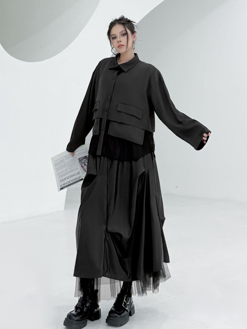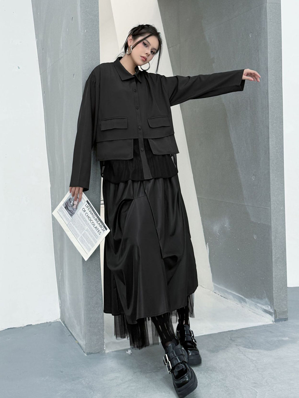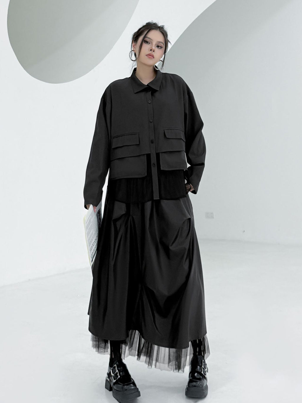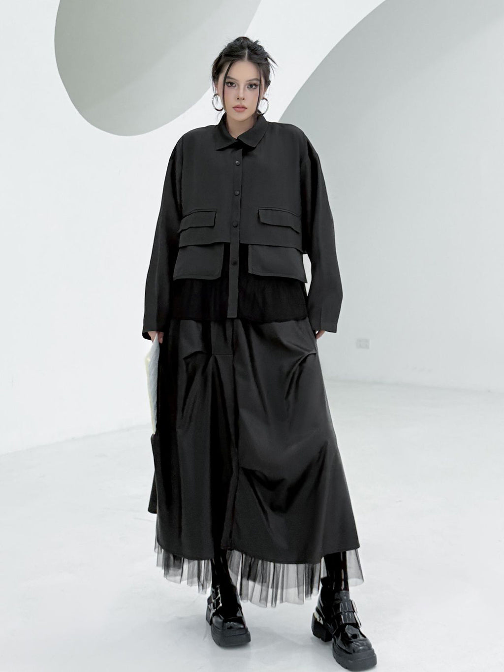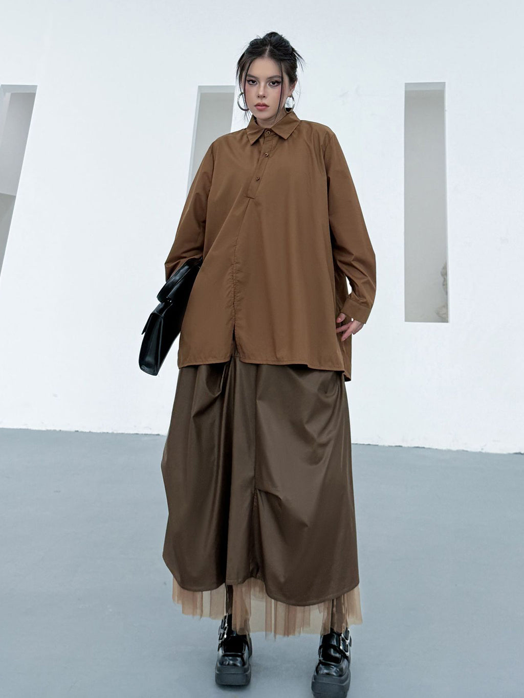 ツヤを抑えたマットなPU素材をベースに、裾から繊細なチュールが覗くロングスカート。フロントに配されたギャザーパネルが自然な立体感を生み、歩くたびに揺れるフォルムに奥行きを加える。ウエストはゴム仕様でストレスのない着用感に仕上げられており、ドローコードなどの装飾を省いたシンプルな設計がモードな印象を引き立てる。裾のチュールはあえて露出を抑えた設計で、アウターやロングシャツとのレイヤードでも映える設計。スニーカーからブーツまで幅広く合わせやすく、スタイリングの軸となる。
