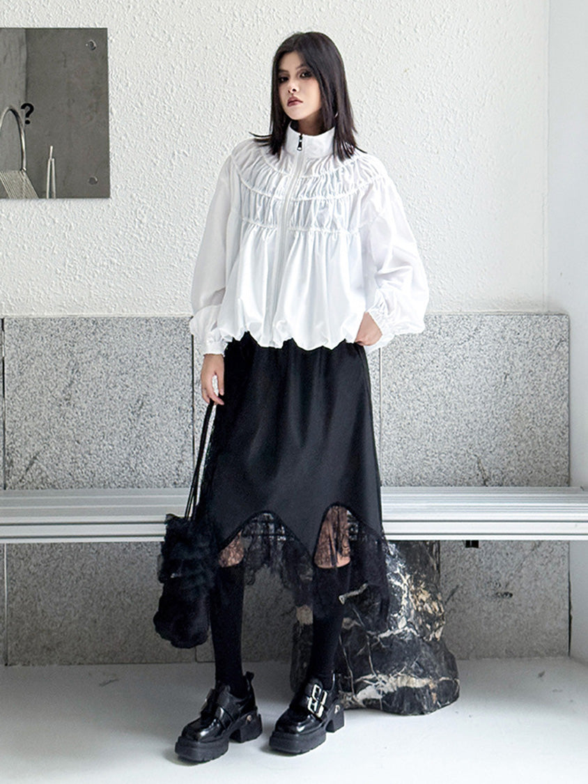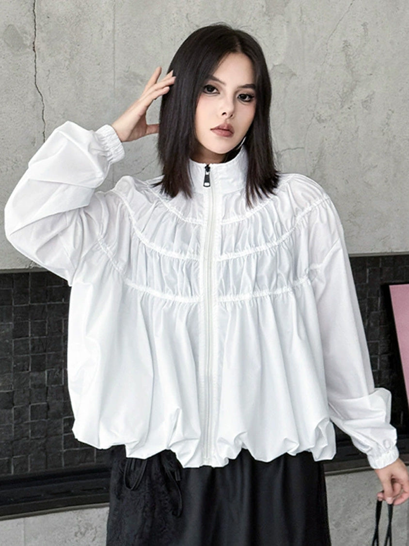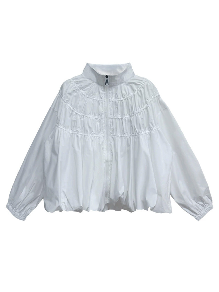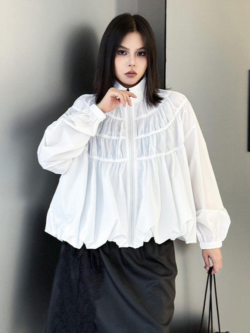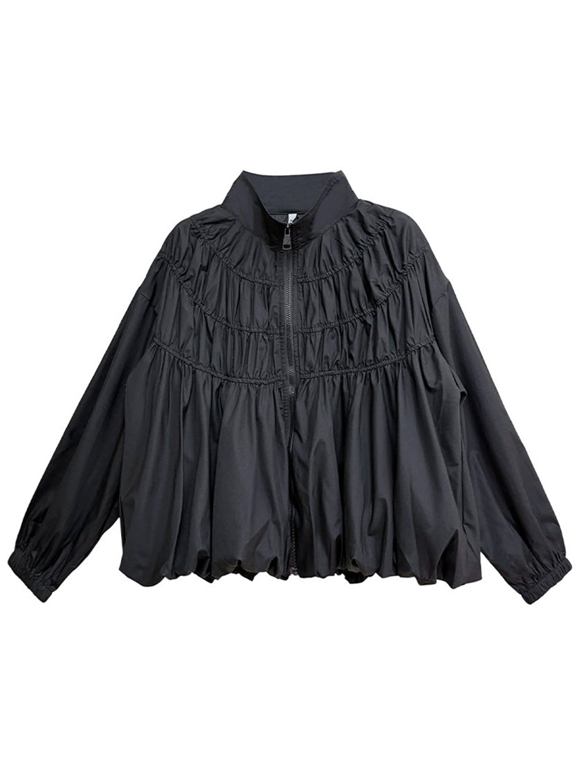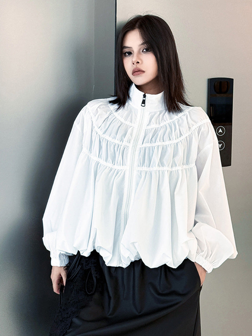 全体に寄せを重ねた構築的な表情を持つ構成で、スタンドカラーから切り替えへと連続するシャーリングが上方向へ重心を寄せる輪郭を生む。軽量素材が空気を含みながら膨らみを描き、裾に向かって柔らかく広がる流れが生まれる。袖はゆるく丸みを持たせ、肩の位置を曖昧に整えることで上半身に奥行きが加わる。ファスナーを前面に配したミニマルな仕様で、端の丸いフォルムと直線的な前立ての対比が印象の起点となる。