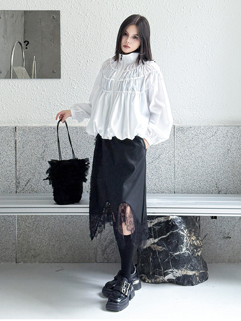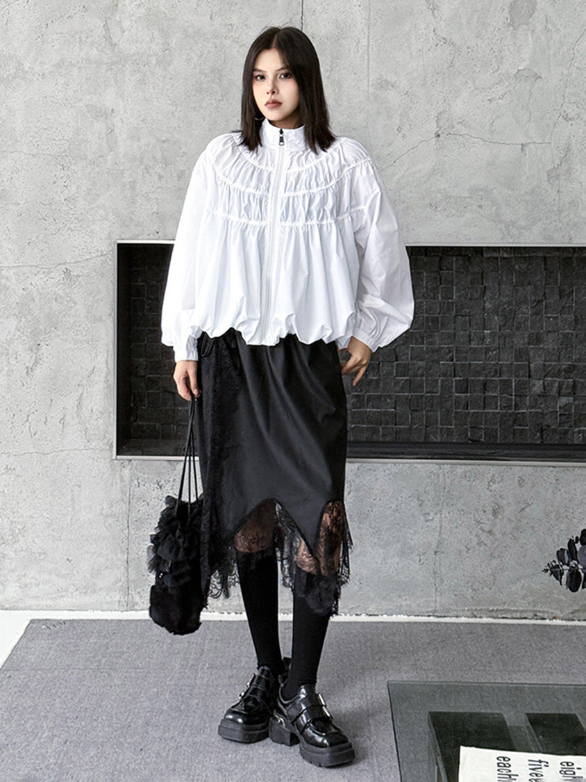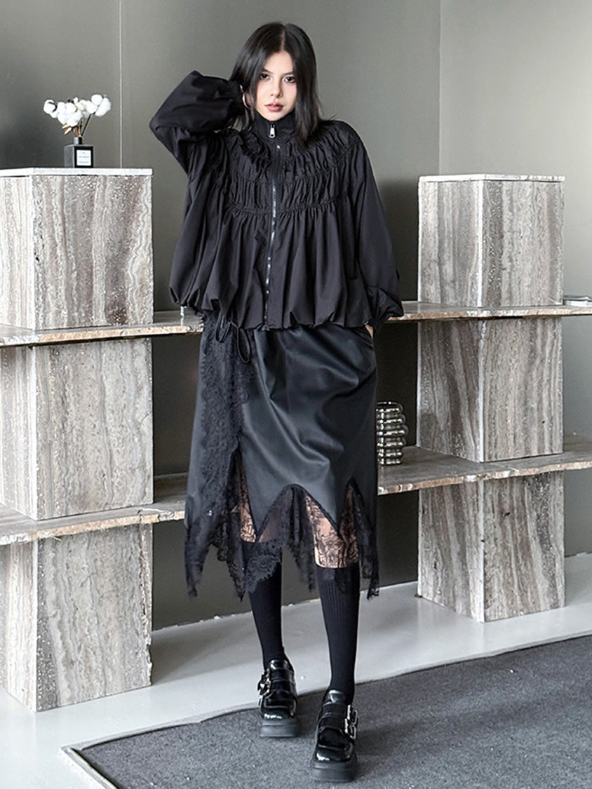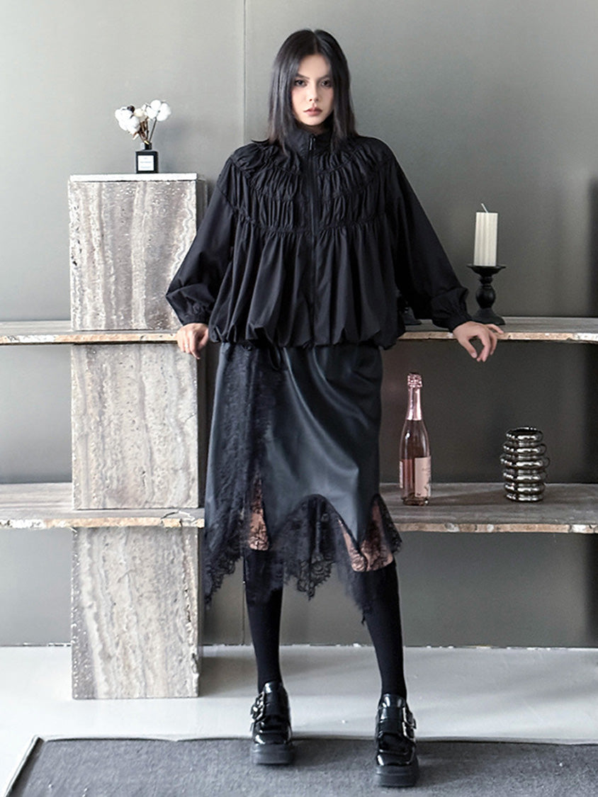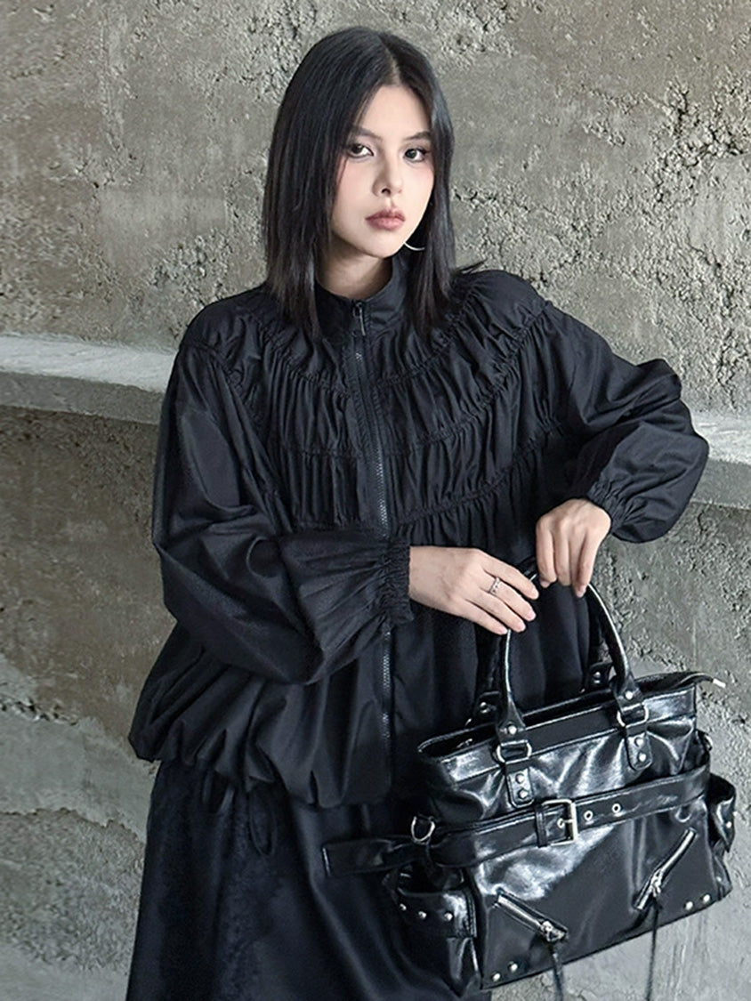 全体に寄せを重ねた構築的な表情を持つ構成で、スタンドカラーから切り替えへと連続するシャーリングが上方向へ重心を寄せる輪郭を生む。軽量素材が空気を含みながら膨らみを描き、裾に向かって柔らかく広がる流れが生まれる。袖はゆるく丸みを持たせ、肩の位置を曖昧に整えることで上半身に奥行きが加わる。ファスナーを前面に配したミニマルな仕様で、端の丸いフォルムと直線的な前立ての対比が印象の起点となる。