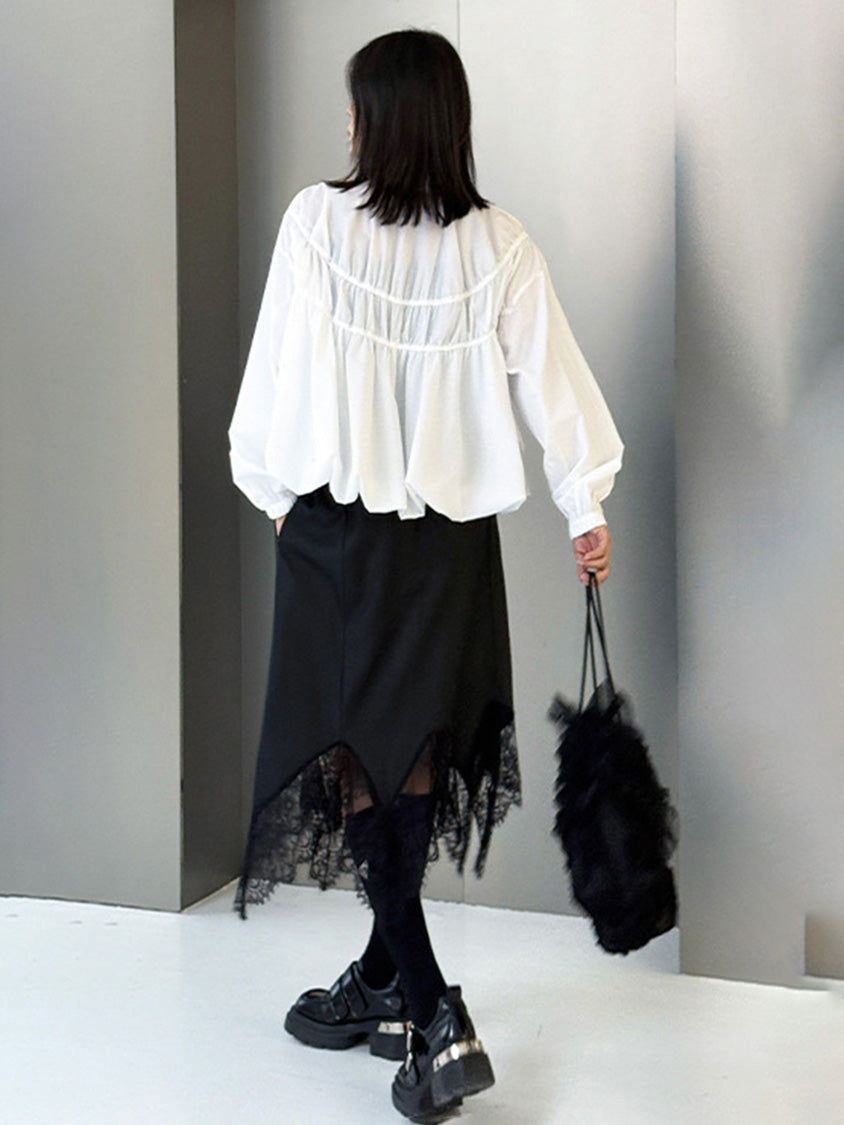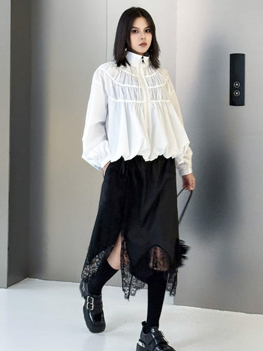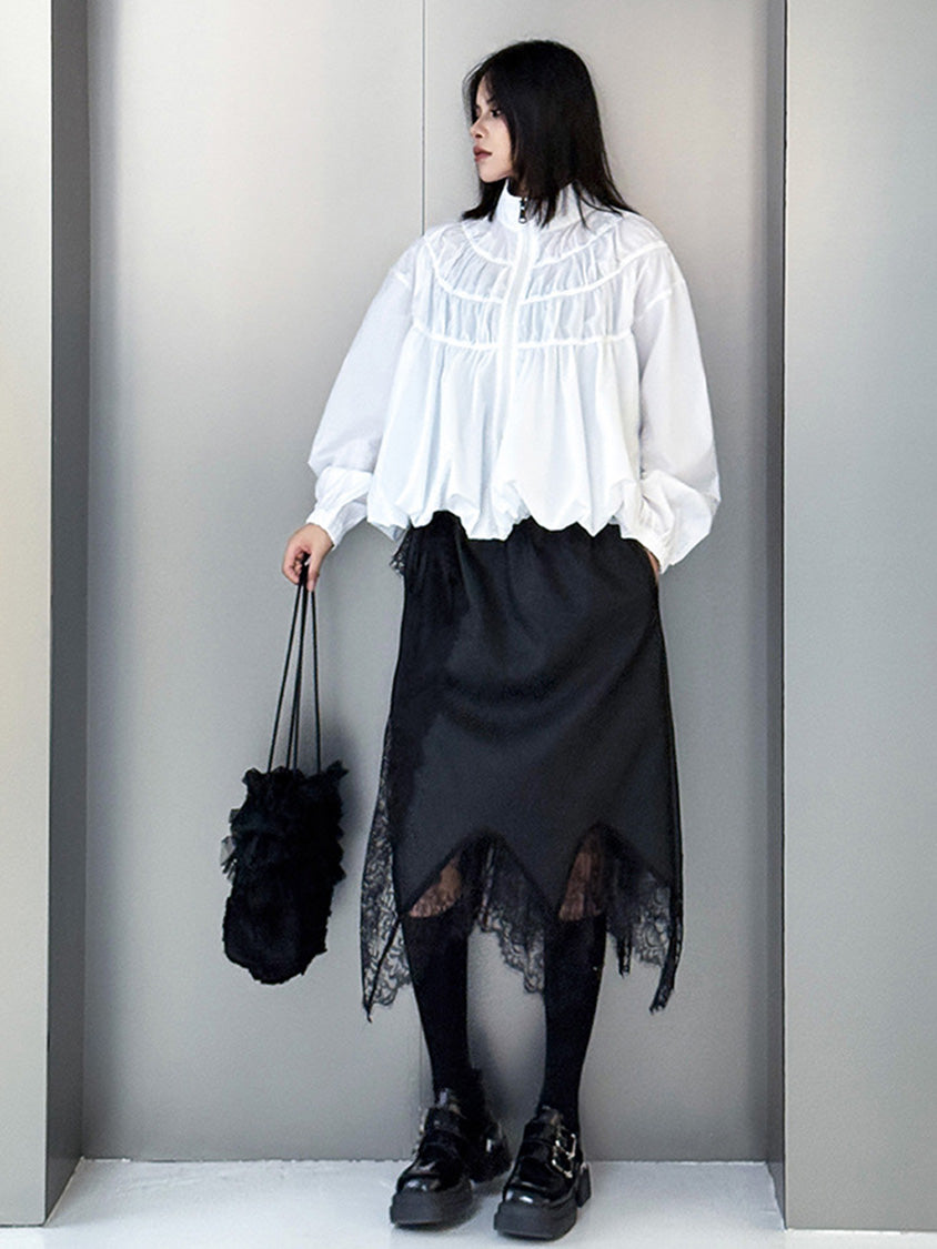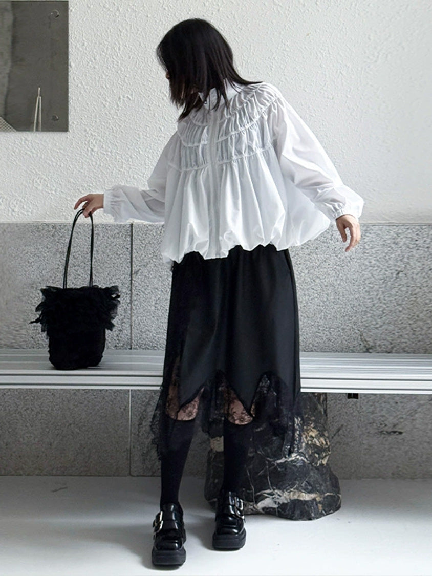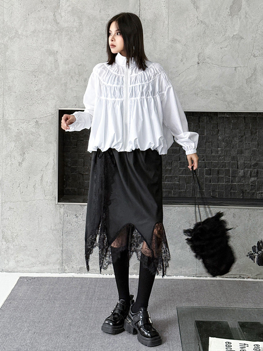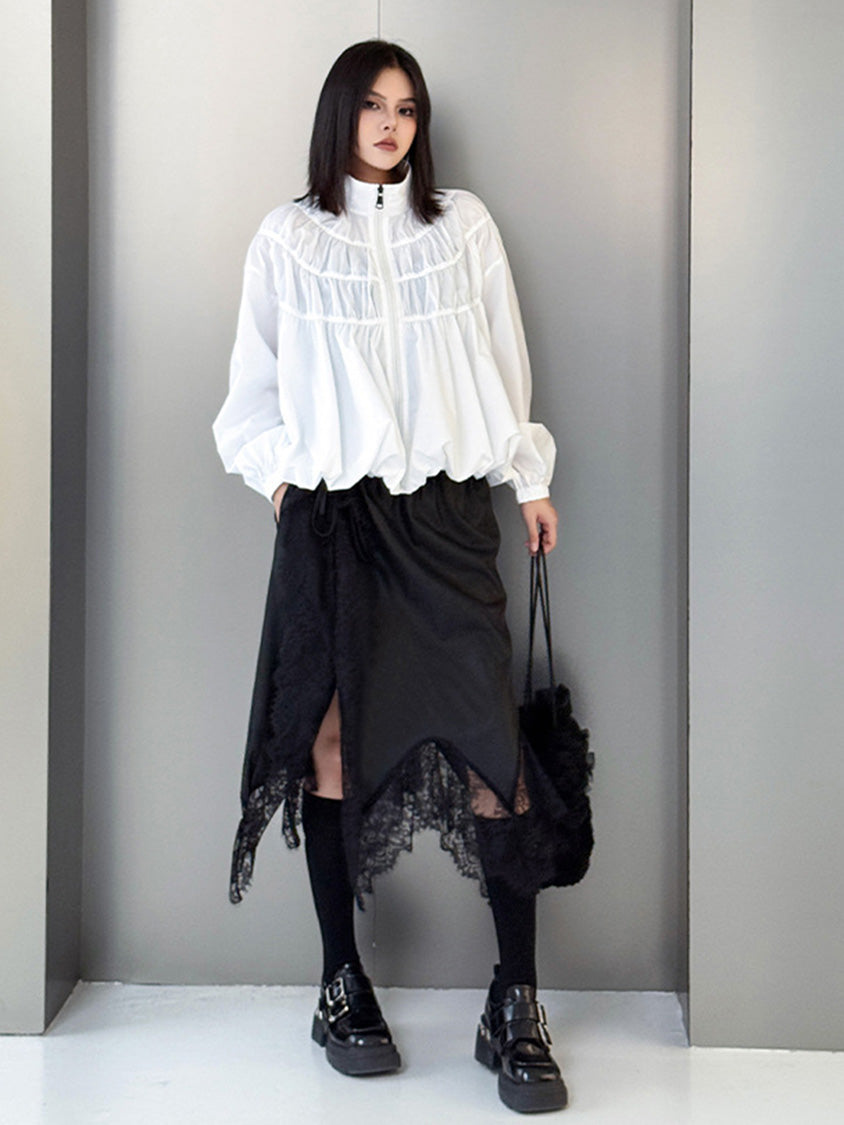 全体に寄せを重ねた構築的な表情を持つ構成で、スタンドカラーから切り替えへと連続するシャーリングが上方向へ重心を寄せる輪郭を生む。軽量素材が空気を含みながら膨らみを描き、裾に向かって柔らかく広がる流れが生まれる。袖はゆるく丸みを持たせ、肩の位置を曖昧に整えることで上半身に奥行きが加わる。ファスナーを前面に配したミニマルな仕様で、端の丸いフォルムと直線的な前立ての対比が印象の起点となる。