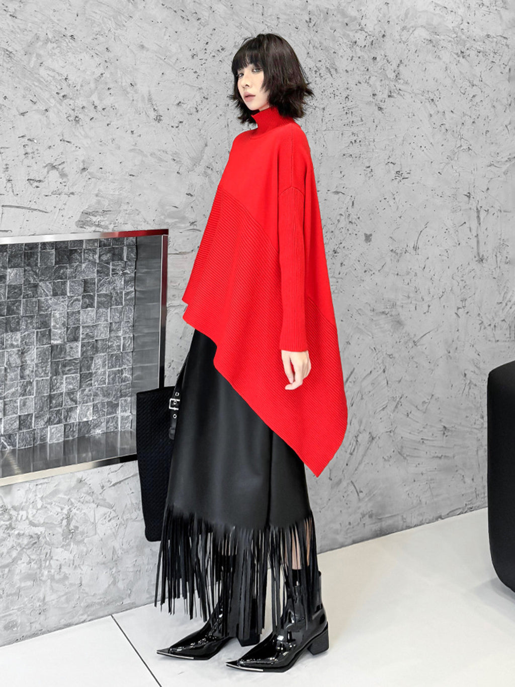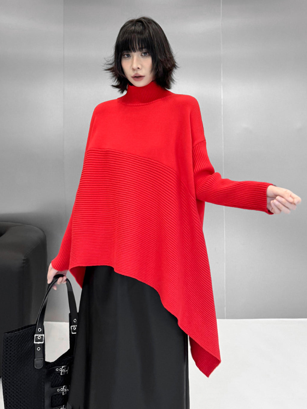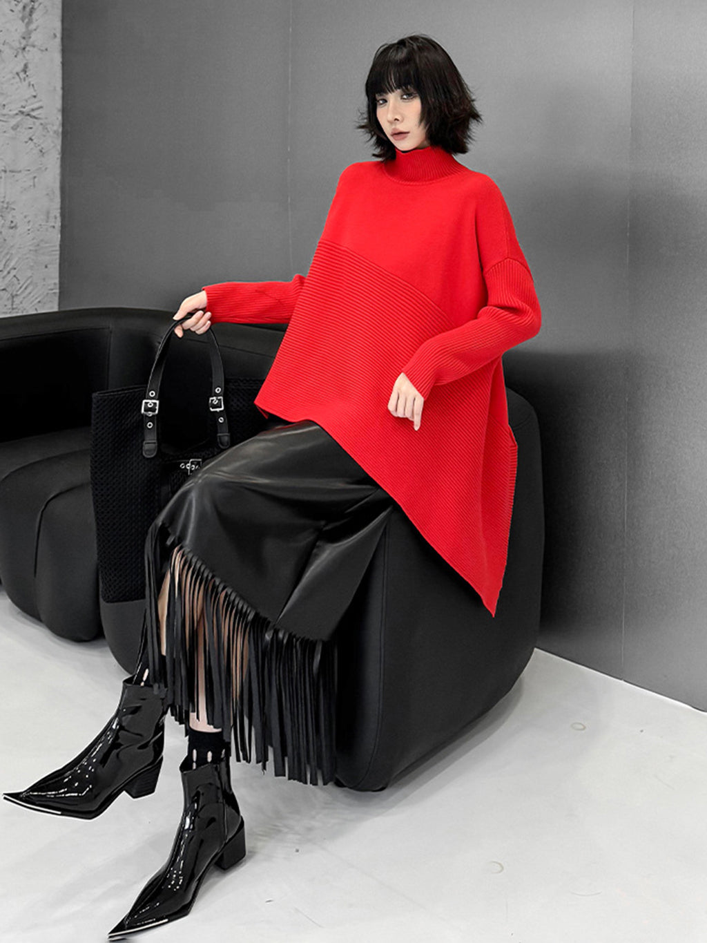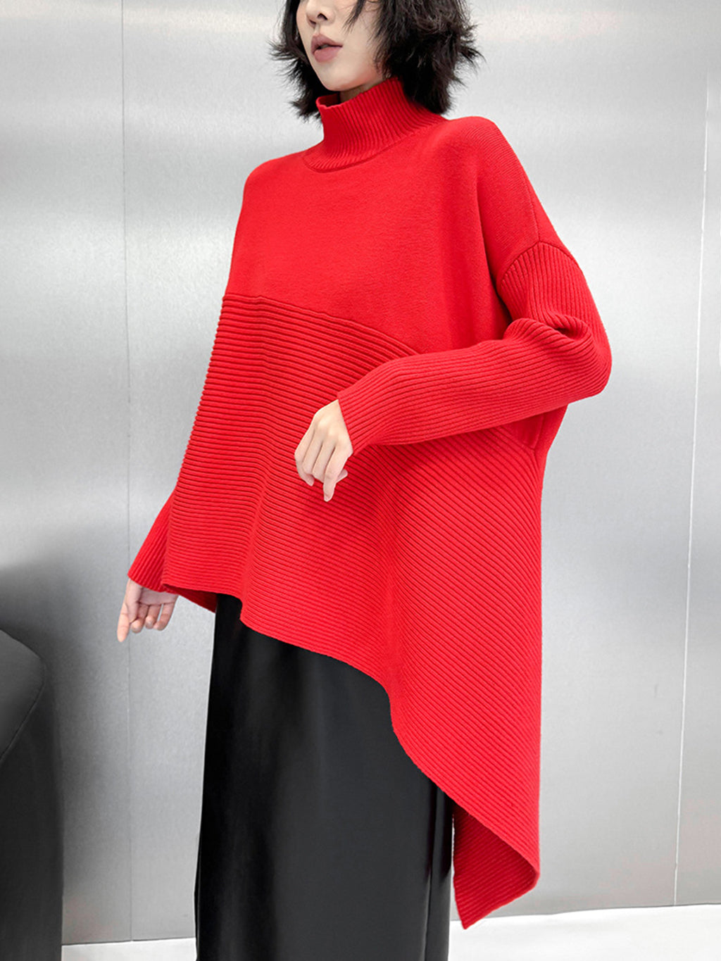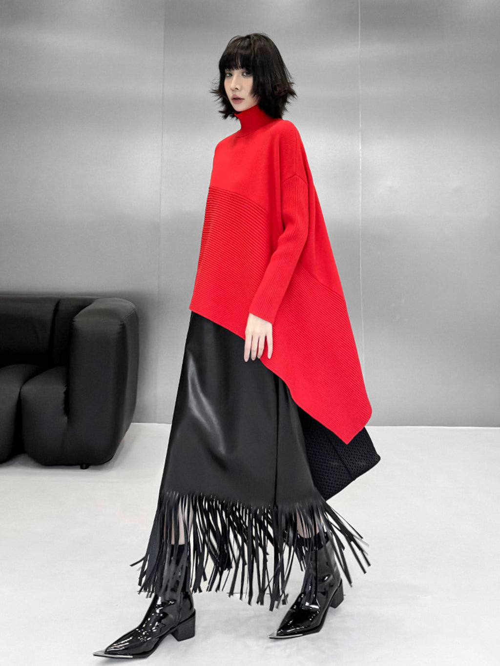 滑らかな編地と立体リブの切替が印象的なモックネックニットトップ。ゆったりとした身幅に対して、両裾を尖らせた大胆なカッティングが構築的なシルエットを生み出す。前後で長さに差をつけることで動きと奥行きを加え、どの角度からも美しく映えるバランスに。首元と袖口には程よい厚みのリブを配し、着用時のフォルムをしっかりとキープ。シンプルながらもディテールで魅せる設計。