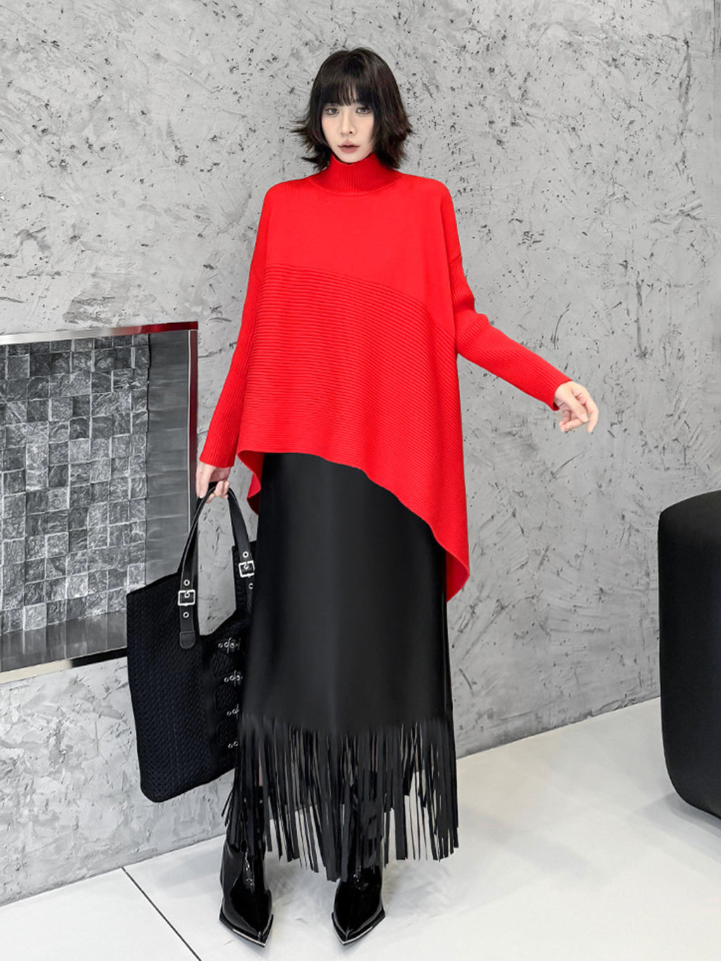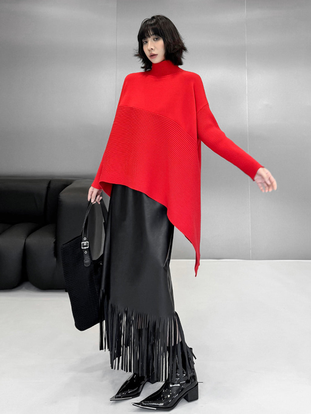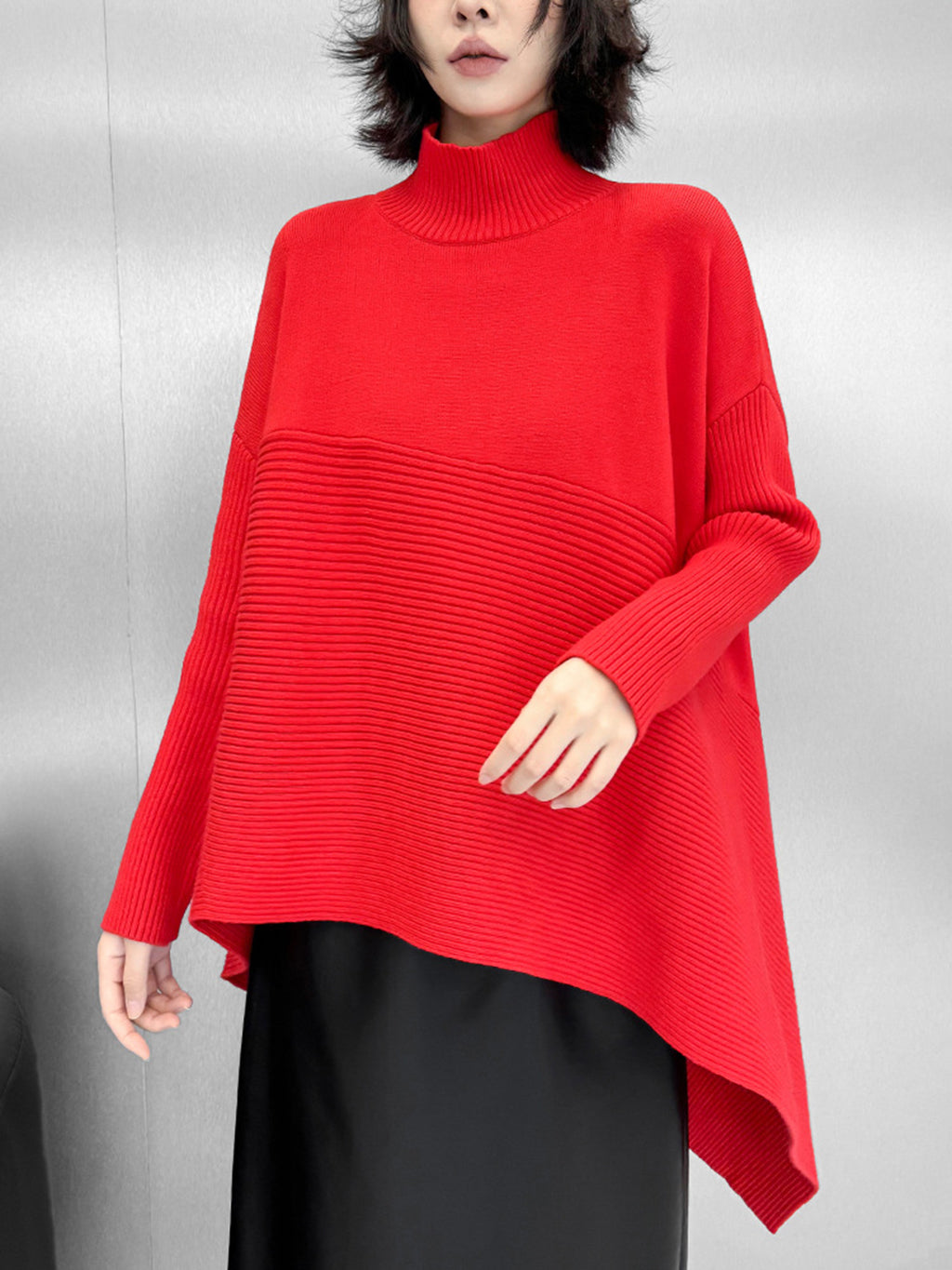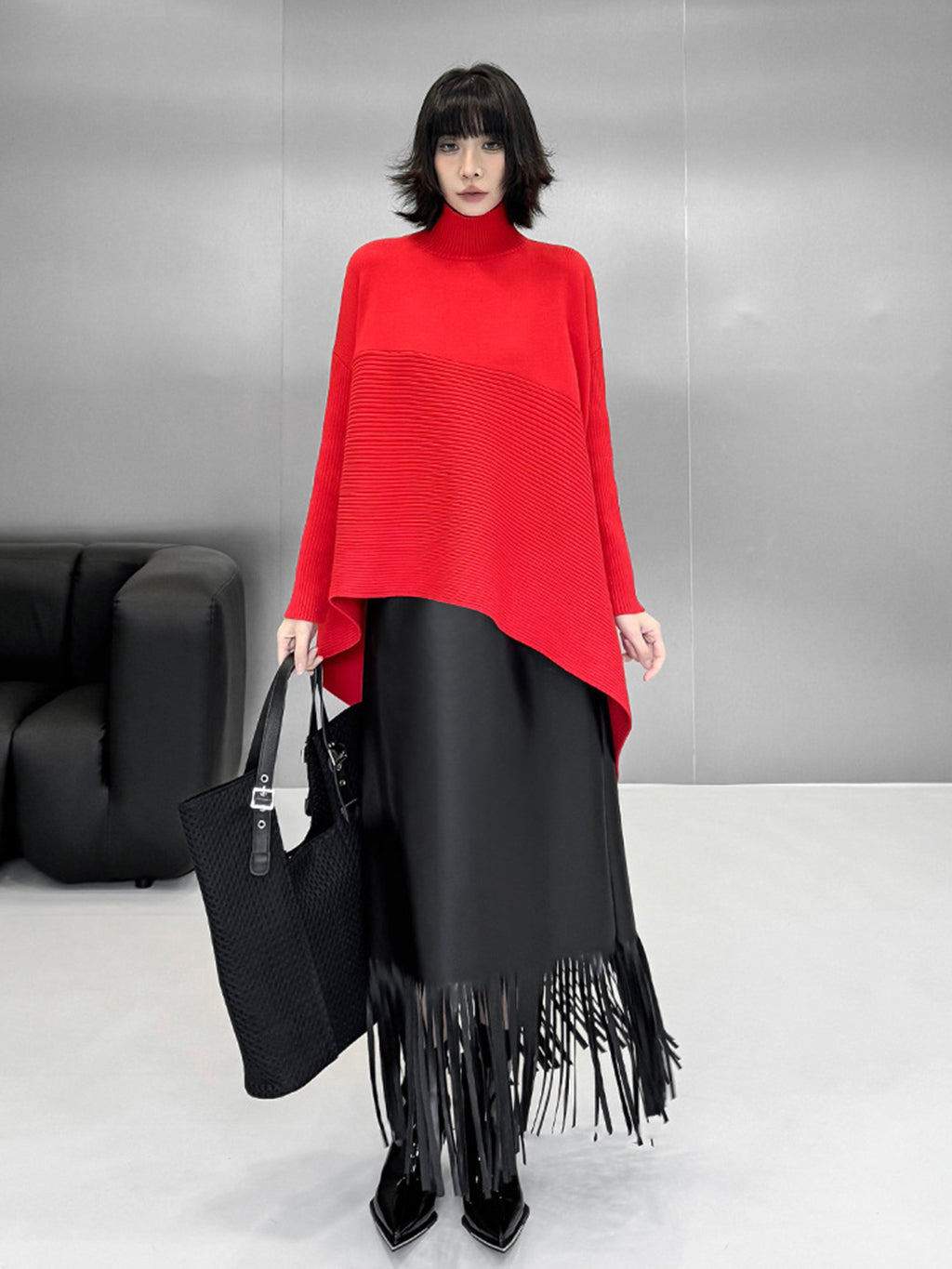 滑らかな編地と立体リブの切替が印象的なモックネックニットトップ。ゆったりとした身幅に対して、両裾を尖らせた大胆なカッティングが構築的なシルエットを生み出す。前後で長さに差をつけることで動きと奥行きを加え、どの角度からも美しく映えるバランスに。首元と袖口には程よい厚みのリブを配し、着用時のフォルムをしっかりとキープ。シンプルながらもディテールで魅せる設計。