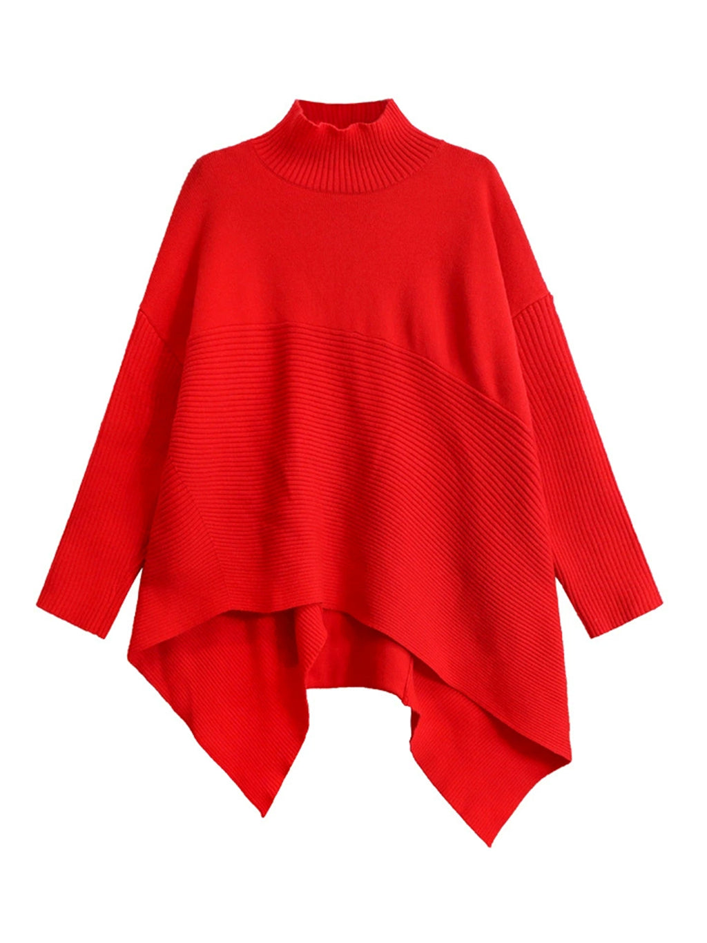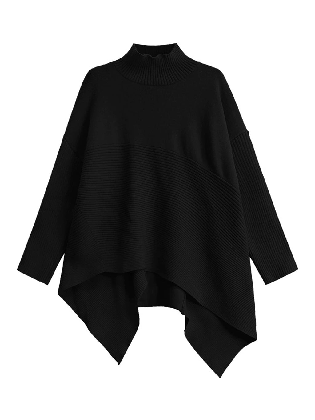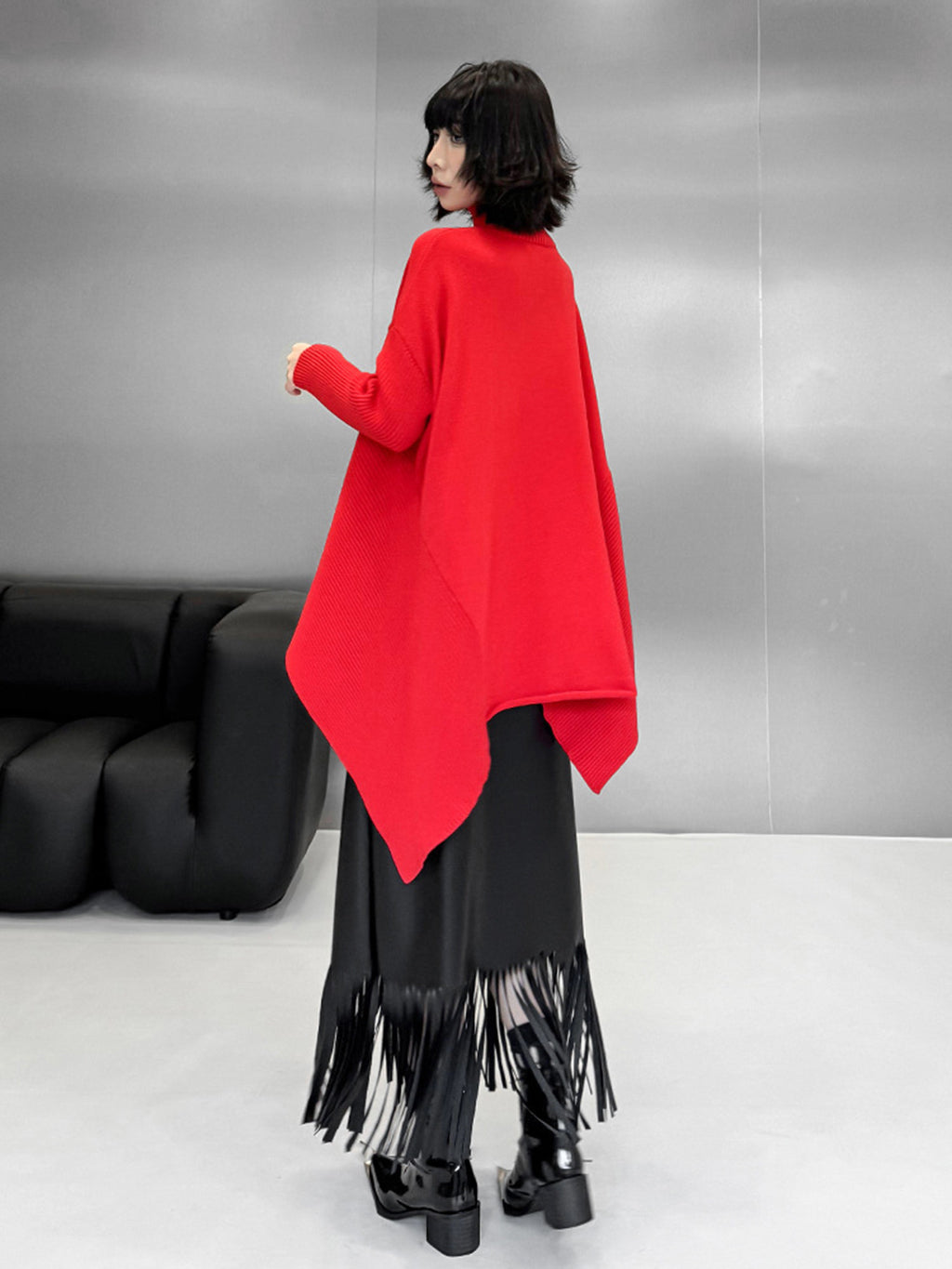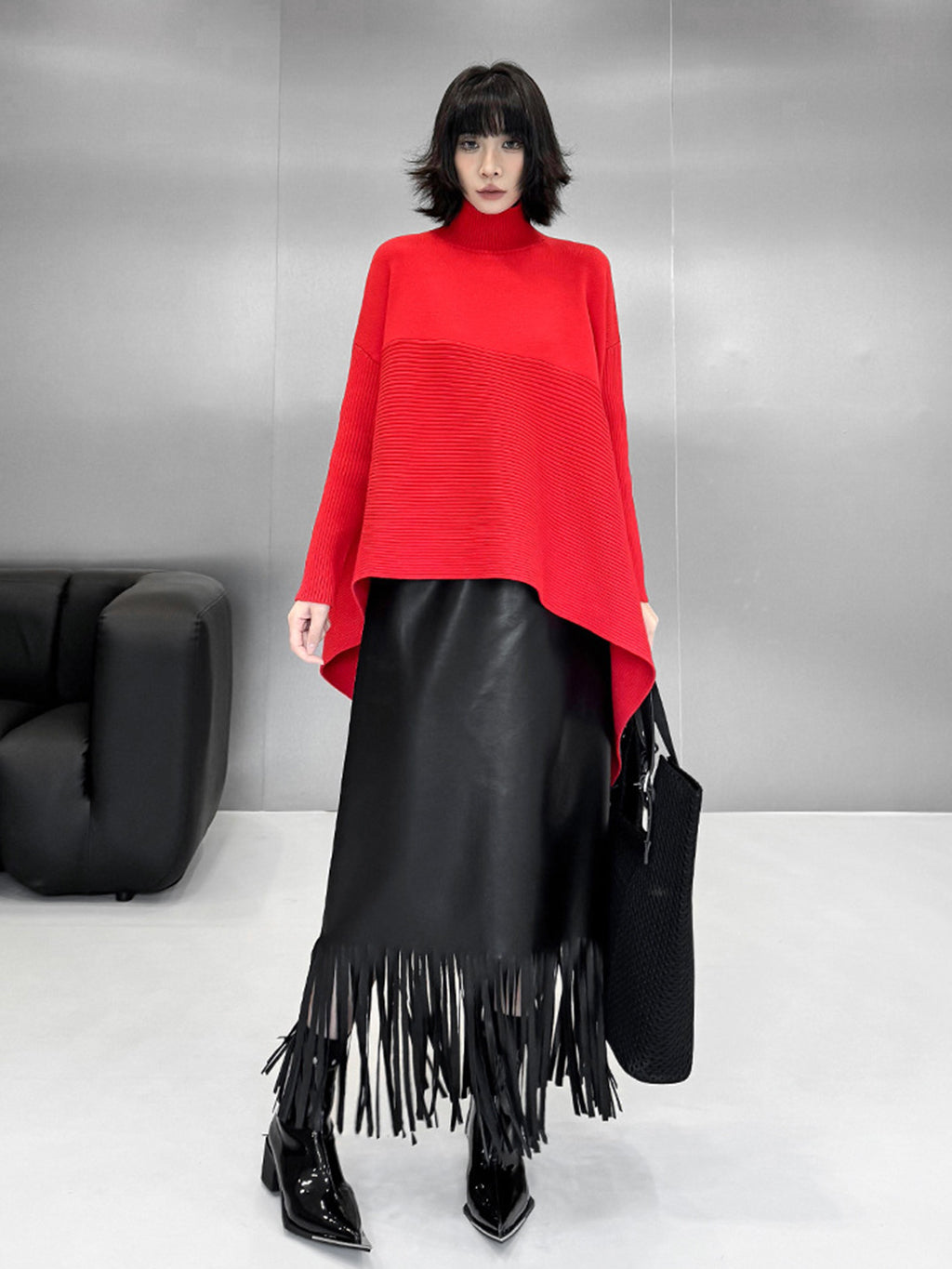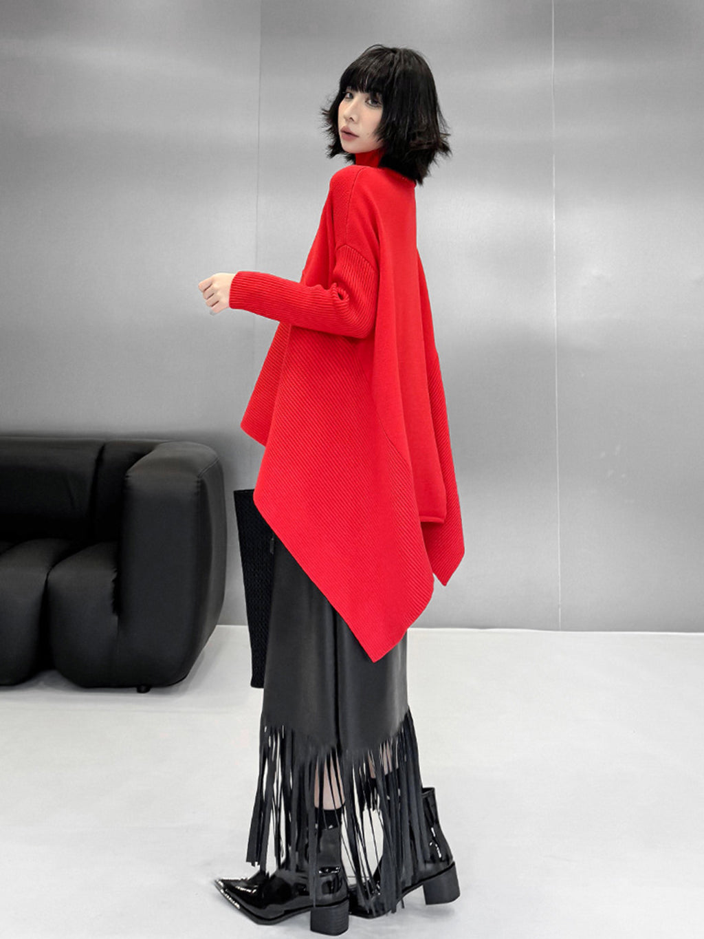 滑らかな編地と立体リブの切替が印象的なモックネックニットトップ。ゆったりとした身幅に対して、両裾を尖らせた大胆なカッティングが構築的なシルエットを生み出す。前後で長さに差をつけることで動きと奥行きを加え、どの角度からも美しく映えるバランスに。首元と袖口には程よい厚みのリブを配し、着用時のフォルムをしっかりとキープ。シンプルながらもディテールで魅せる設計。