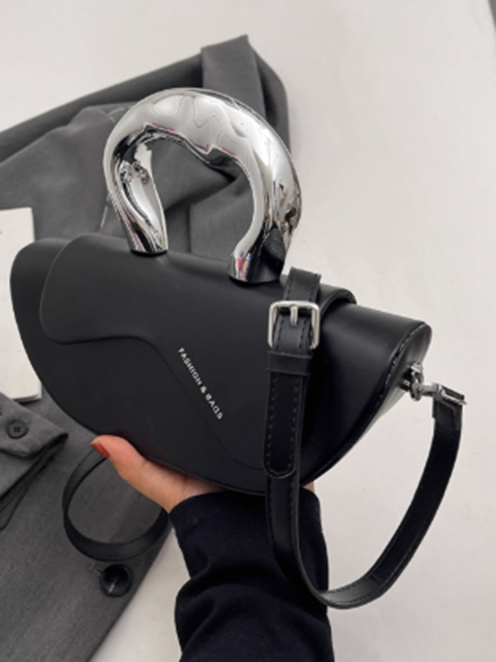 流線型の美しさを活かした立体構造のコンパクトバッグ。丸みのある本体に対し、異素材のメタリックハンドルが強烈なアクセントとなり、未来感ある印象を演出。マットなPU素材が全体に高級感を与え、手持ち・肩掛け・斜め掛けの3WAY仕様でスタイリングに応じた自由なアレンジが可能。ミニマルながらも個性を放つデザインが特徴。
