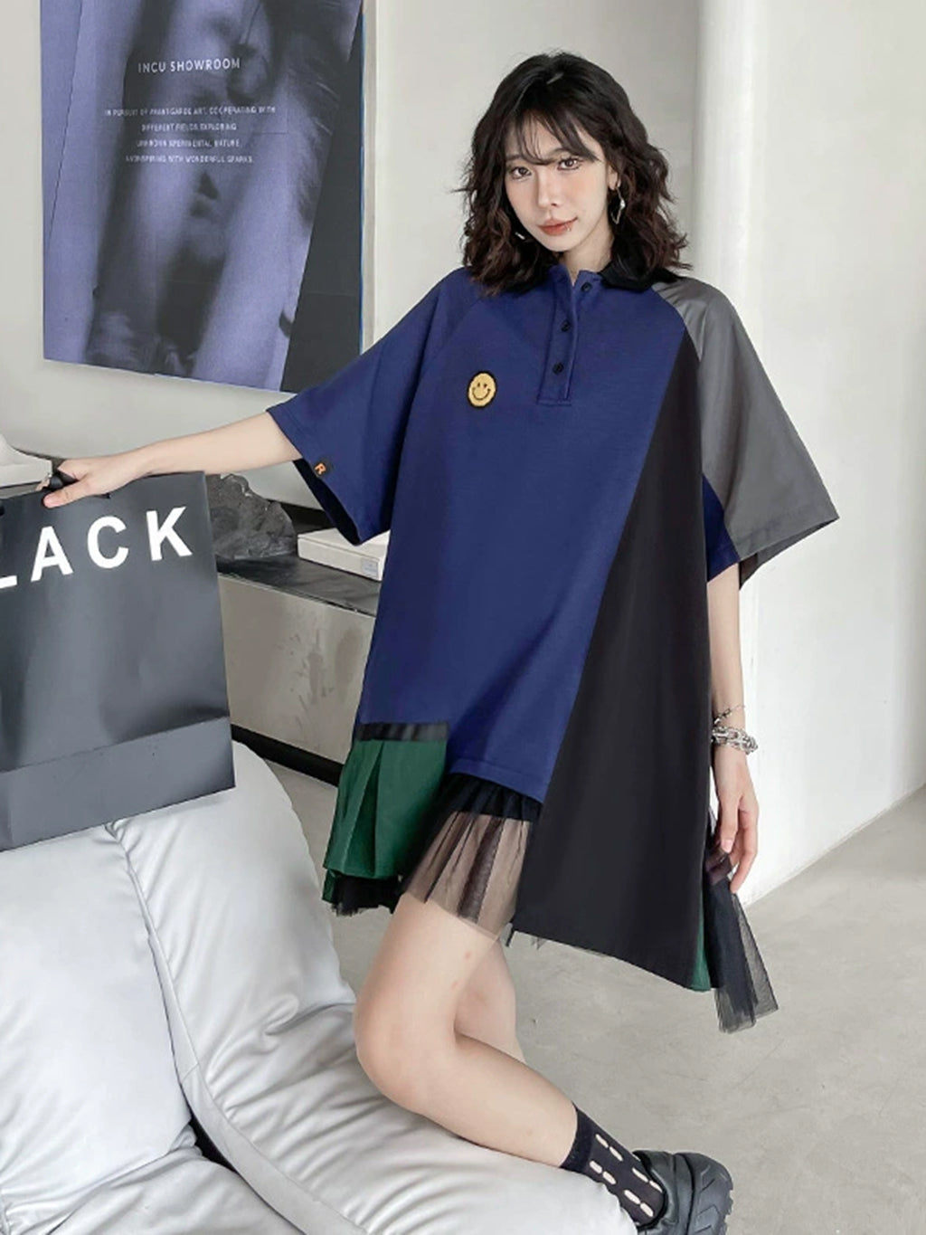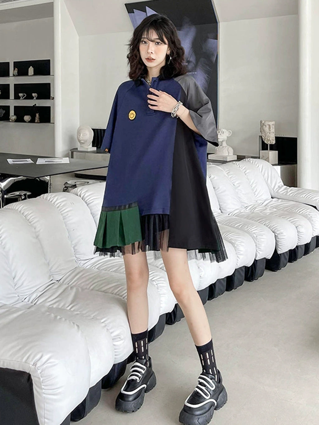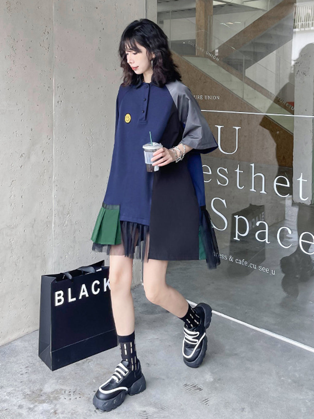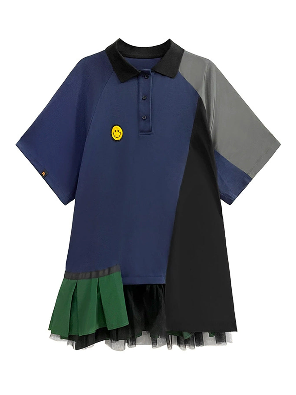 クラシックなポロ襟に、グリーンとブラックの切替えプリーツやチュールを重ねた大胆な構成が印象的なドレス。フロントにはワンポイントでスマイルパッチを添え、ユニークなアクセントに。袖と身頃に異なるカラーと素材が組み合わさることで、角度によって印象が変化する構成。ゆったりとしたシルエットが抜け感を演出しつつ、裾のチュールが軽やかさと個性を引き立てる。