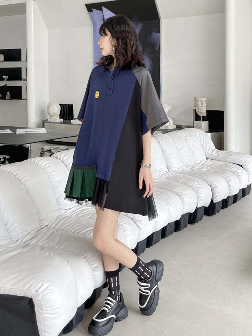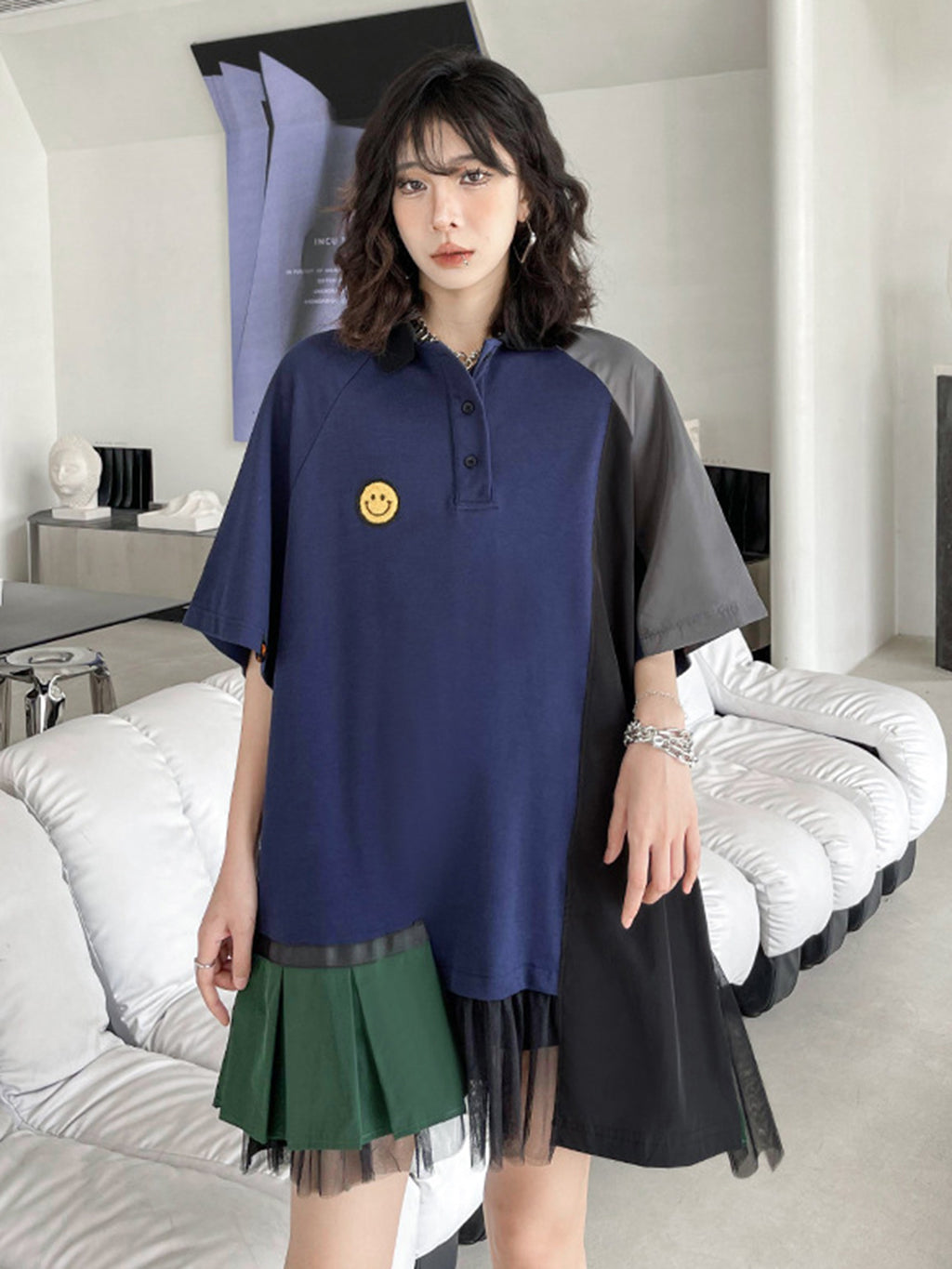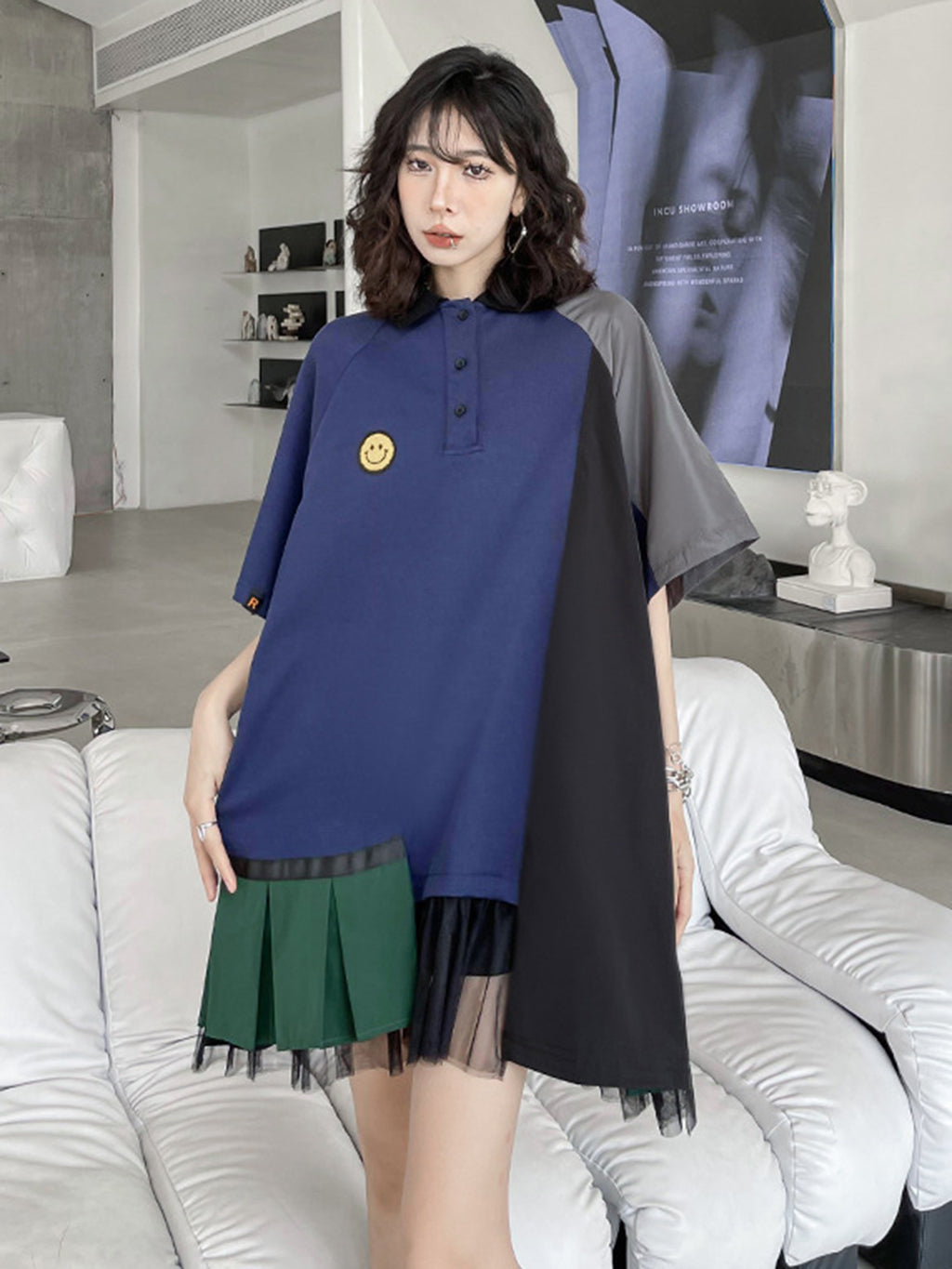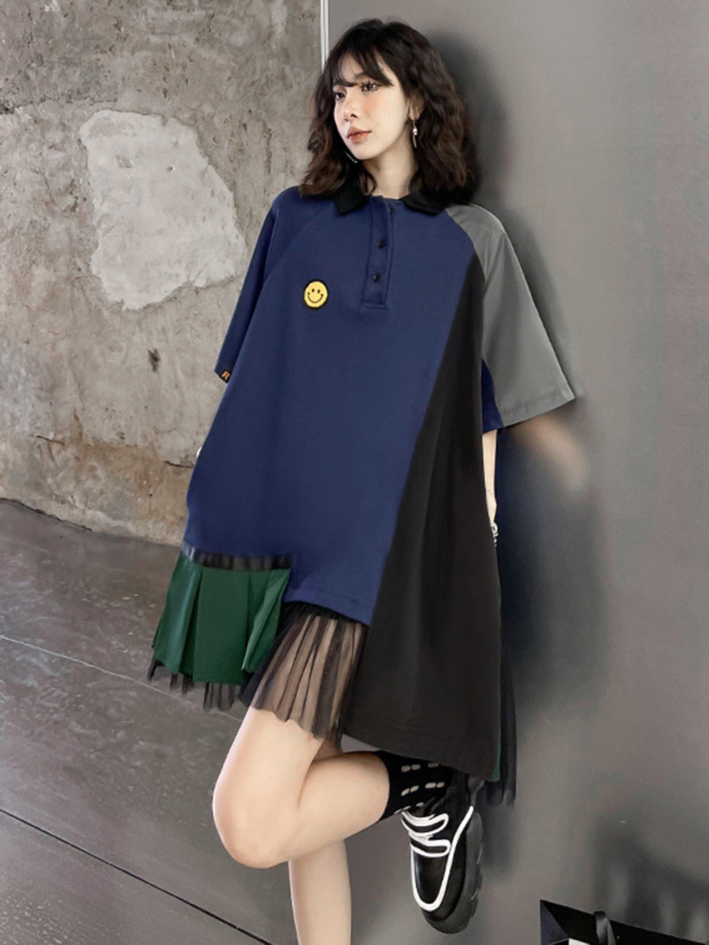 クラシックなポロ襟に、グリーンとブラックの切替えプリーツやチュールを重ねた大胆な構成が印象的なドレス。フロントにはワンポイントでスマイルパッチを添え、ユニークなアクセントに。袖と身頃に異なるカラーと素材が組み合わさることで、角度によって印象が変化する構成。ゆったりとしたシルエットが抜け感を演出しつつ、裾のチュールが軽やかさと個性を引き立てる。