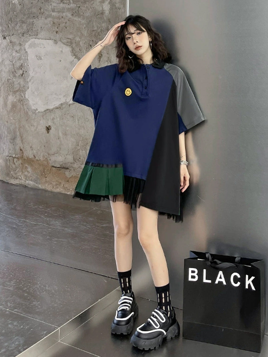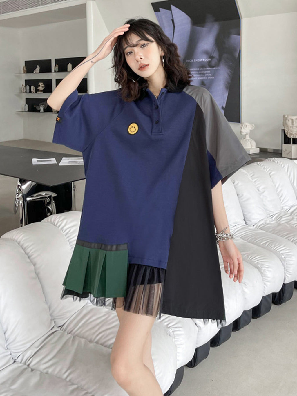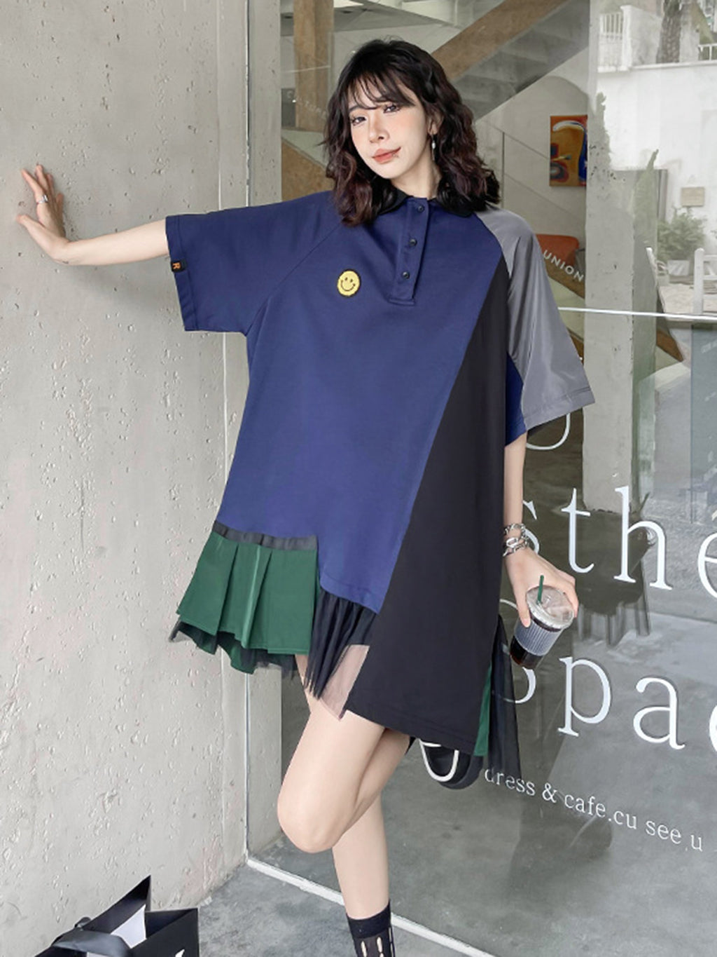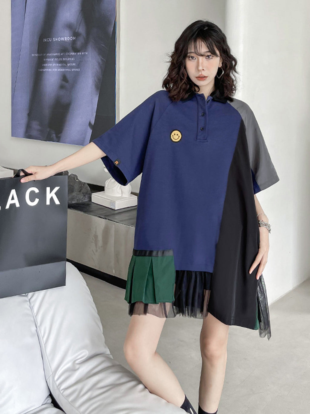 クラシックなポロ襟に、グリーンとブラックの切替えプリーツやチュールを重ねた大胆な構成が印象的なドレス。フロントにはワンポイントでスマイルパッチを添え、ユニークなアクセントに。袖と身頃に異なるカラーと素材が組み合わさることで、角度によって印象が変化する構成。ゆったりとしたシルエットが抜け感を演出しつつ、裾のチュールが軽やかさと個性を引き立てる。